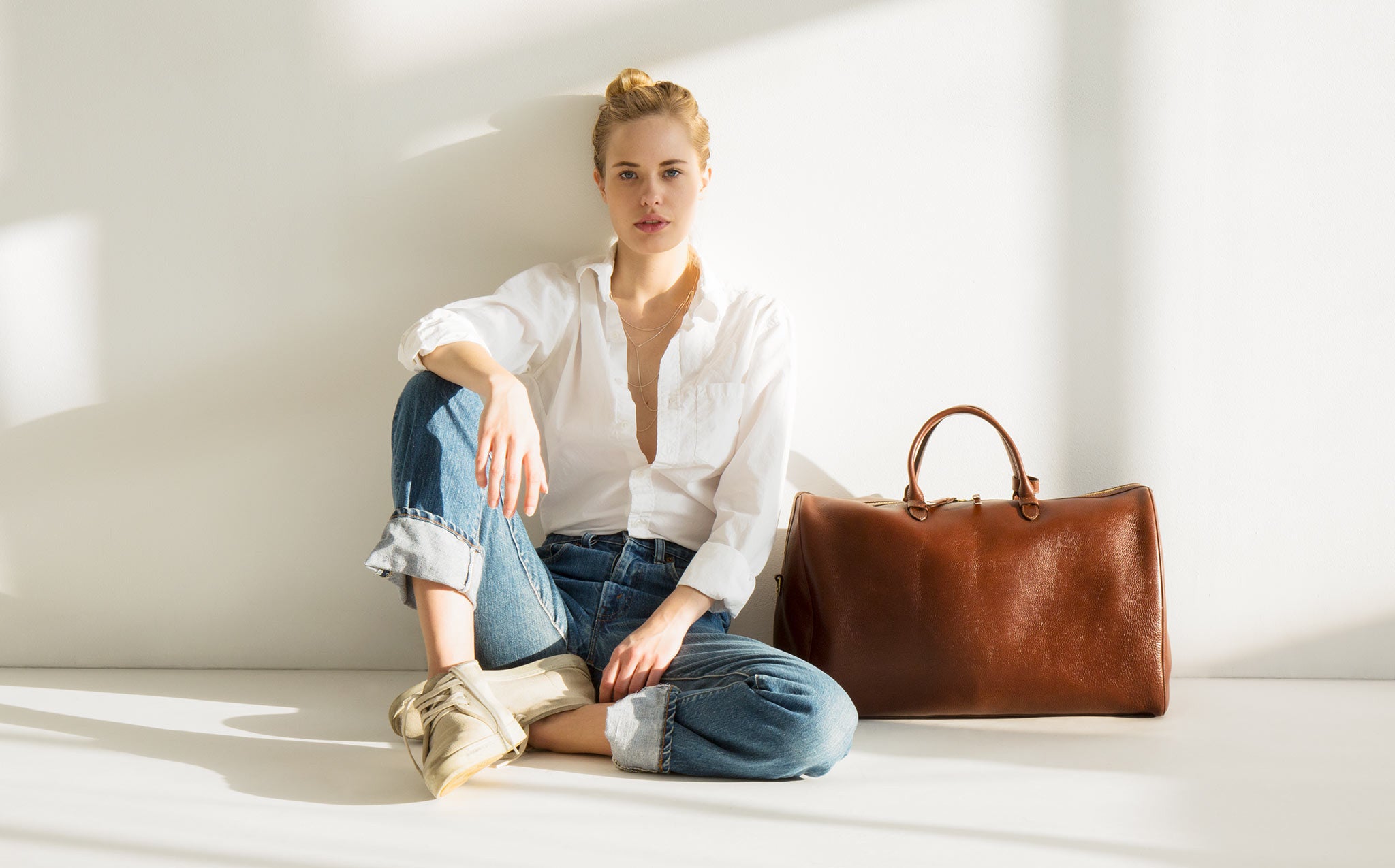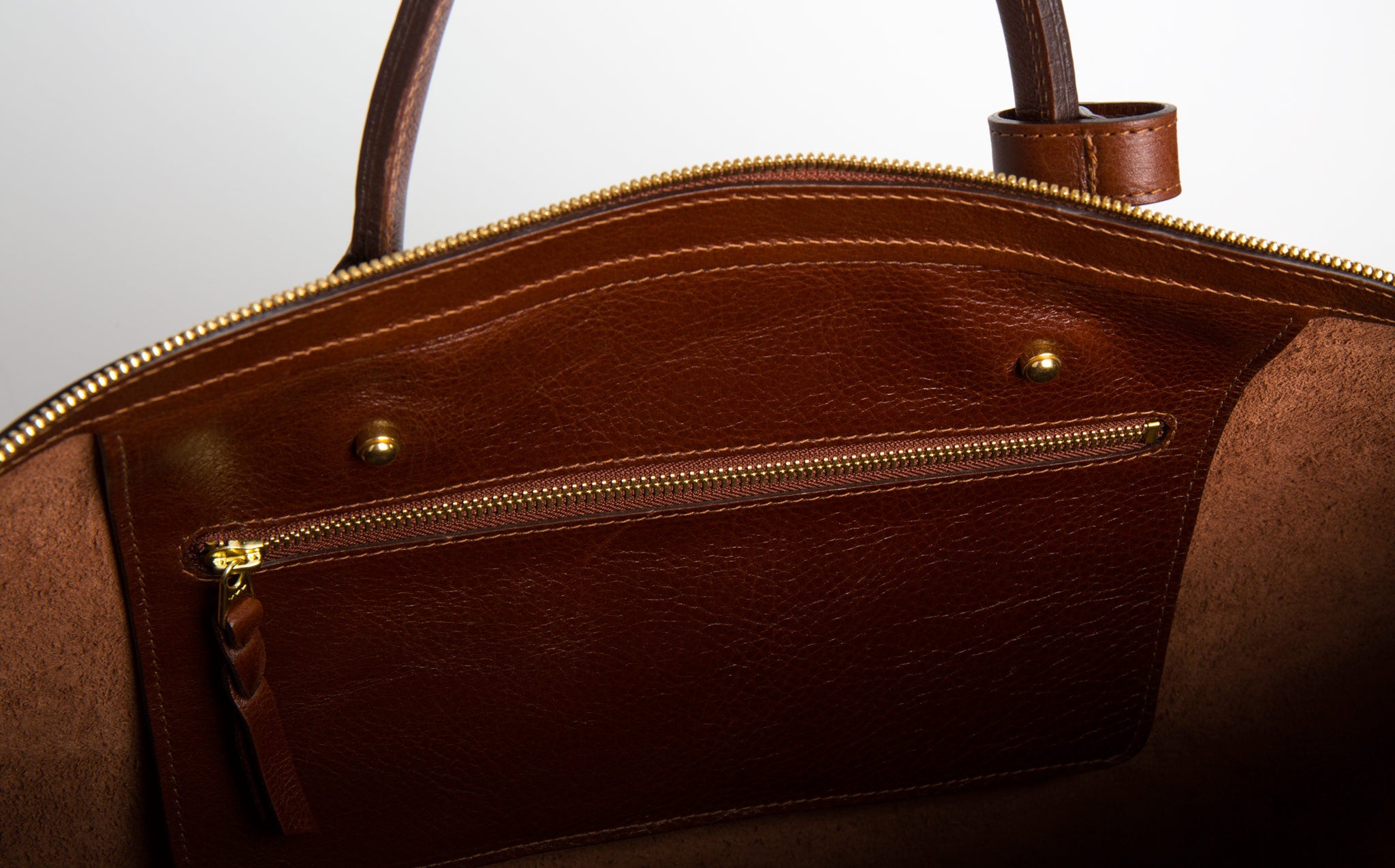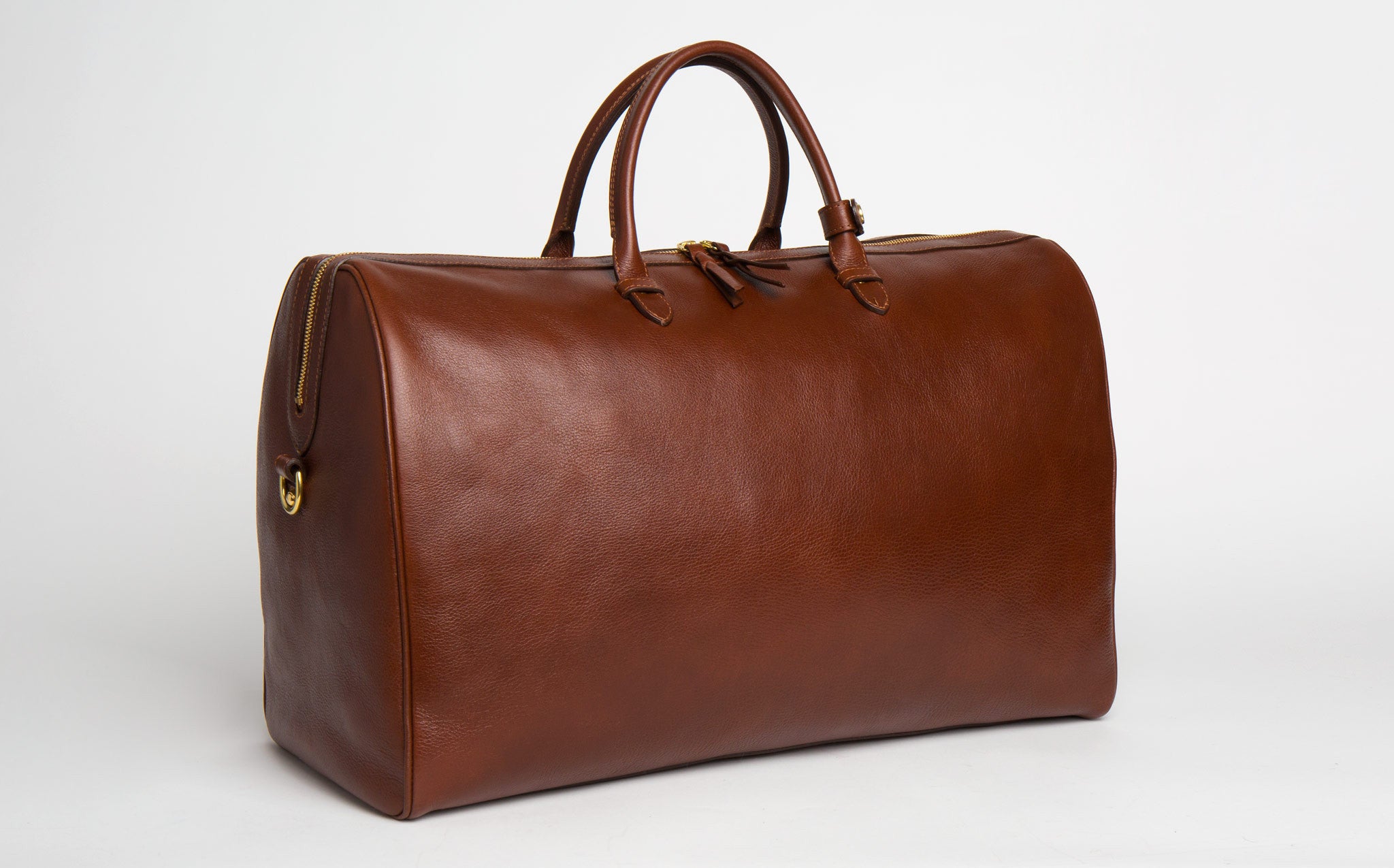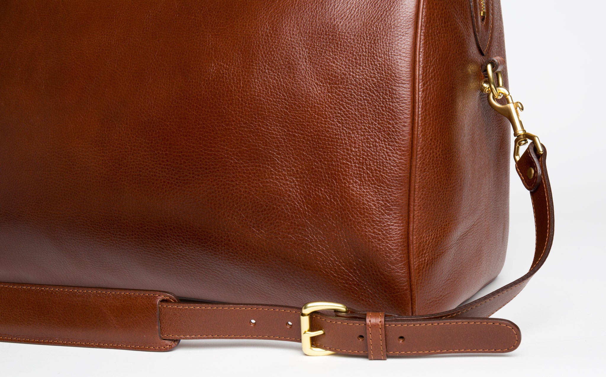 A sleek chestnut colored leather weekender sized to fit perfectly on top of a roller suitcase. Extended zipper for easy access and comfortable nesting handles that are both riveted and stitched onto the bag for durability and integrity. An heirloom quality piece that will last for years.