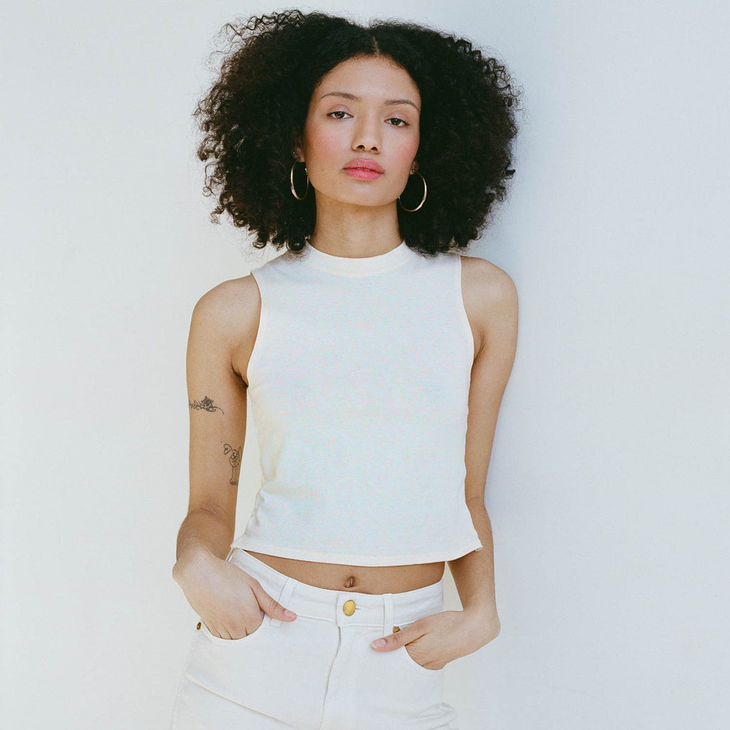 A classic sleeveless tee with a high neckline and slim, cropped silhouette. A limited edition for summer, The Muscle Tee in confetti is made in a soft cotton blend deadstock fabric with pop neon flecks. **THIS ITEM IS FINAL SALE.