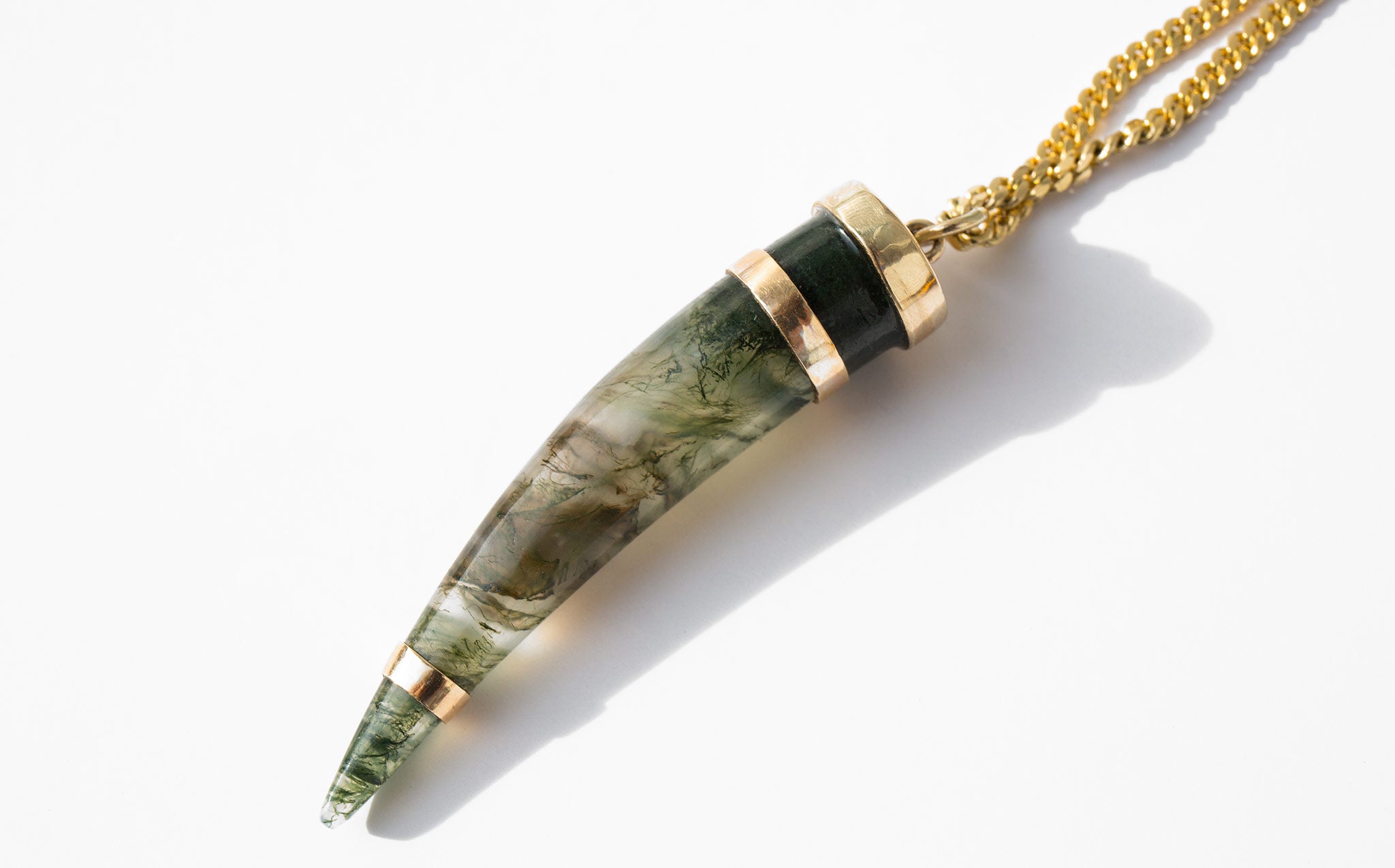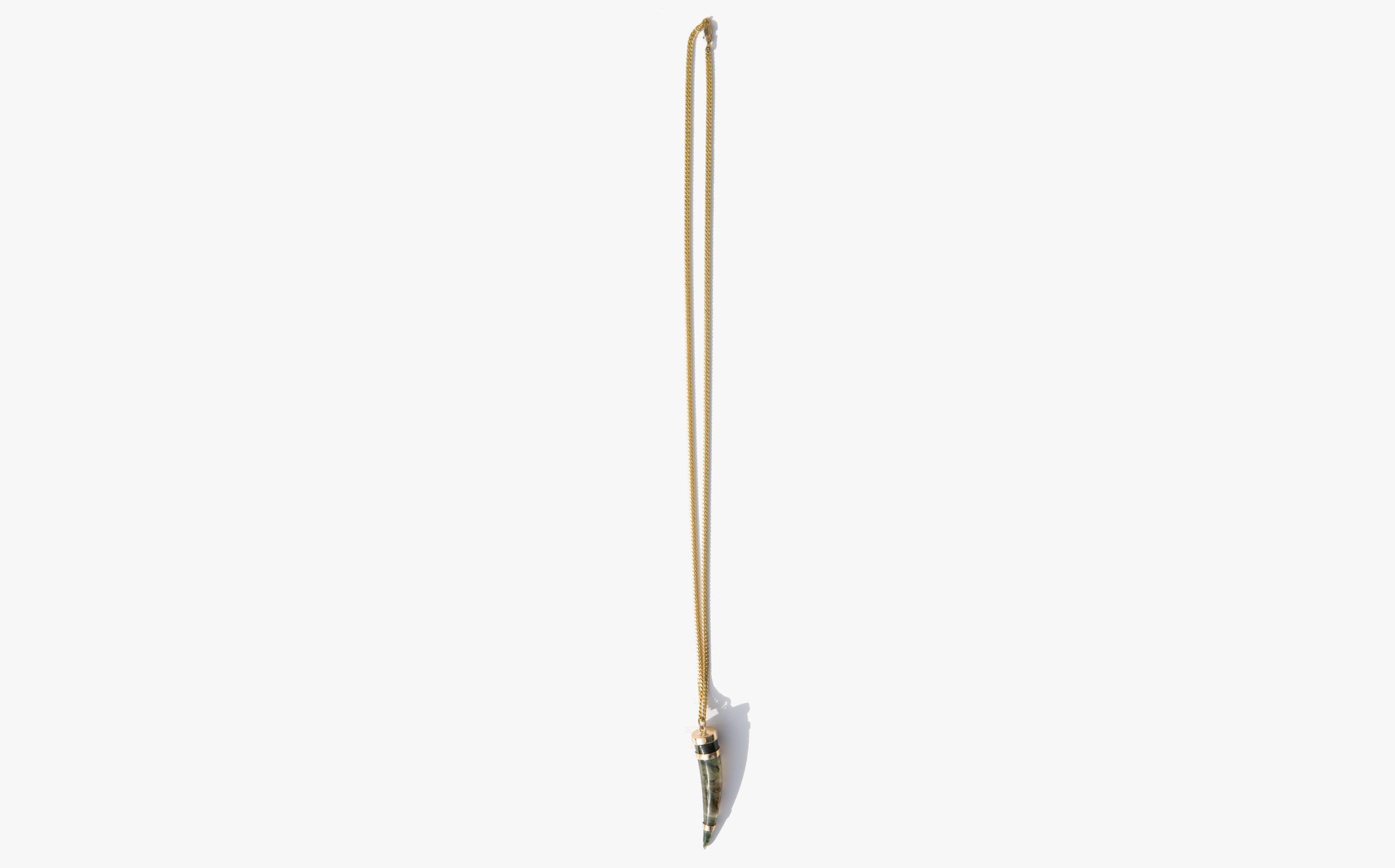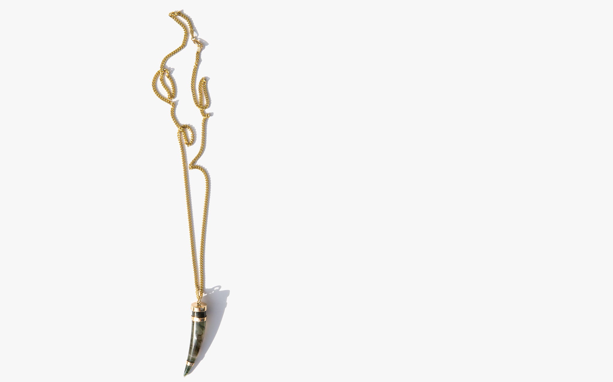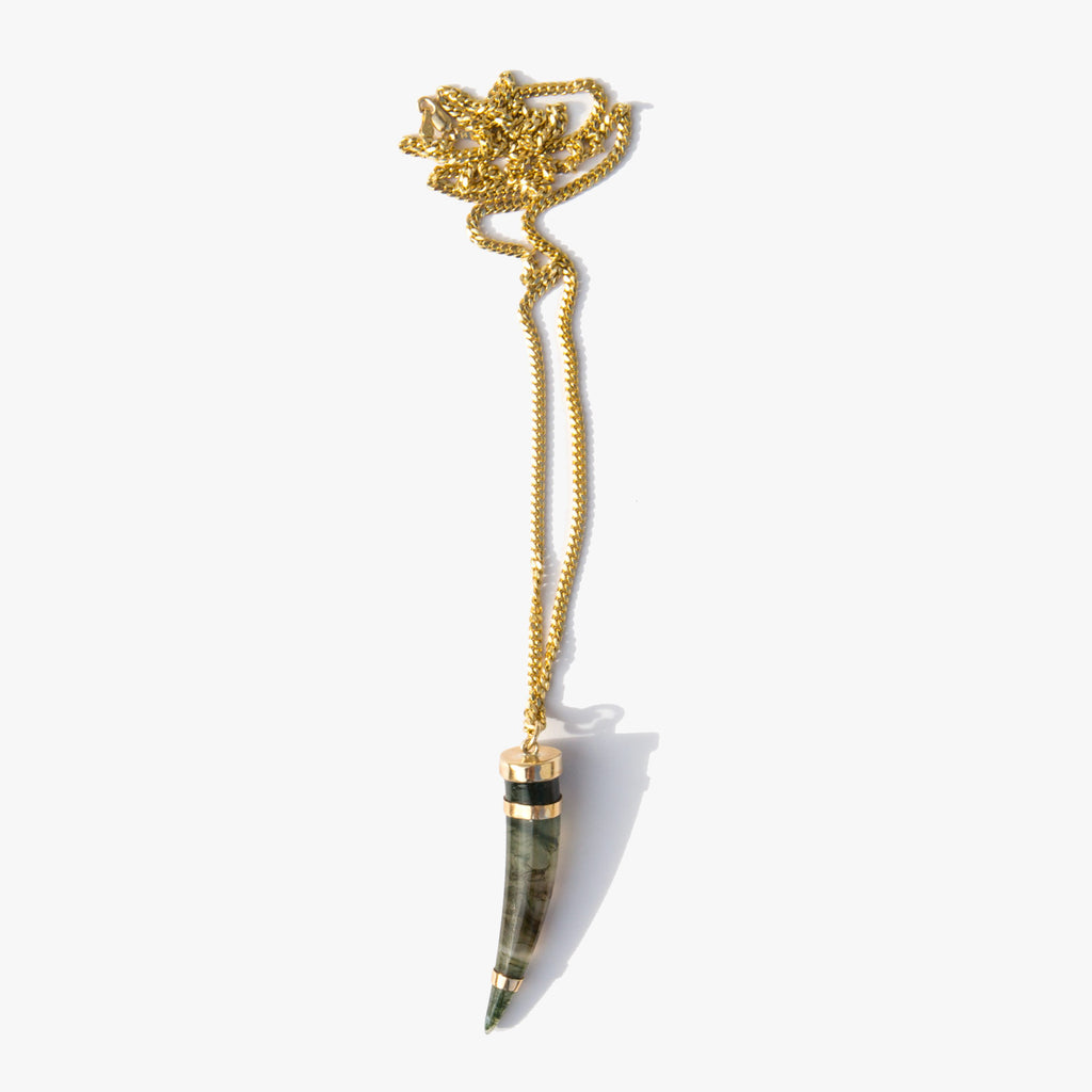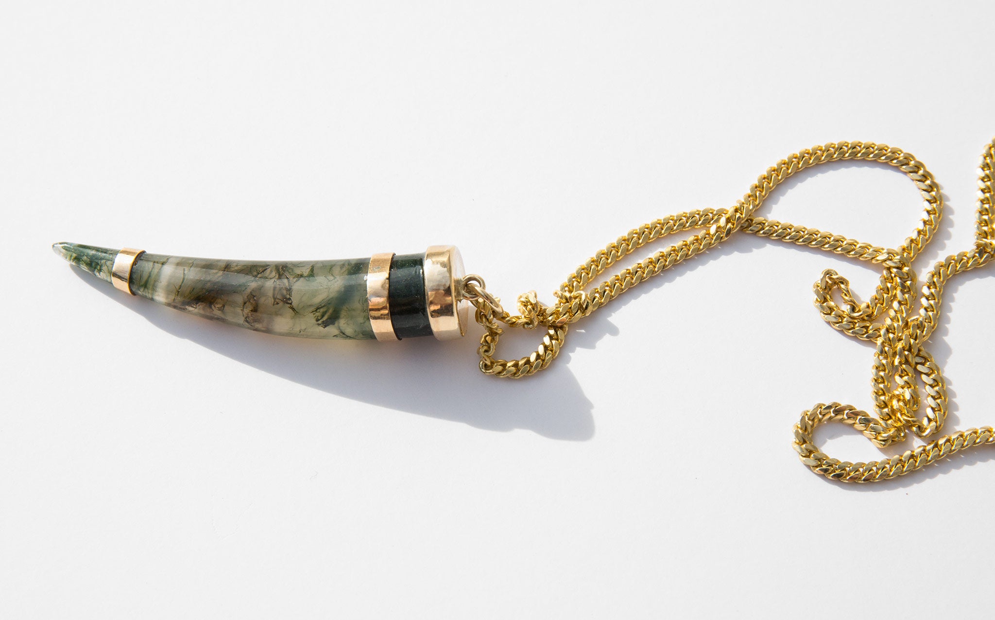 A rare and special piece – sage green and smoky clear antique Scottish agate horn topped with polished 14k gold and strung on a heavy 14k gold curb link chain. Agate is known to be a powerful protector on its own, while the horn has long been worn as an amulet for luck and to deflect negative energy.