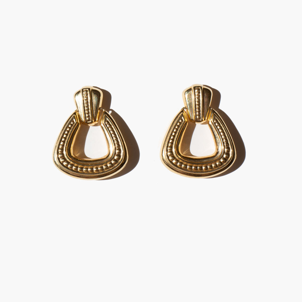 Classic, glittering 14k gold door knocker style earrings.