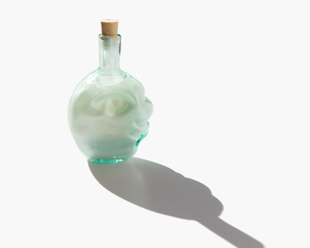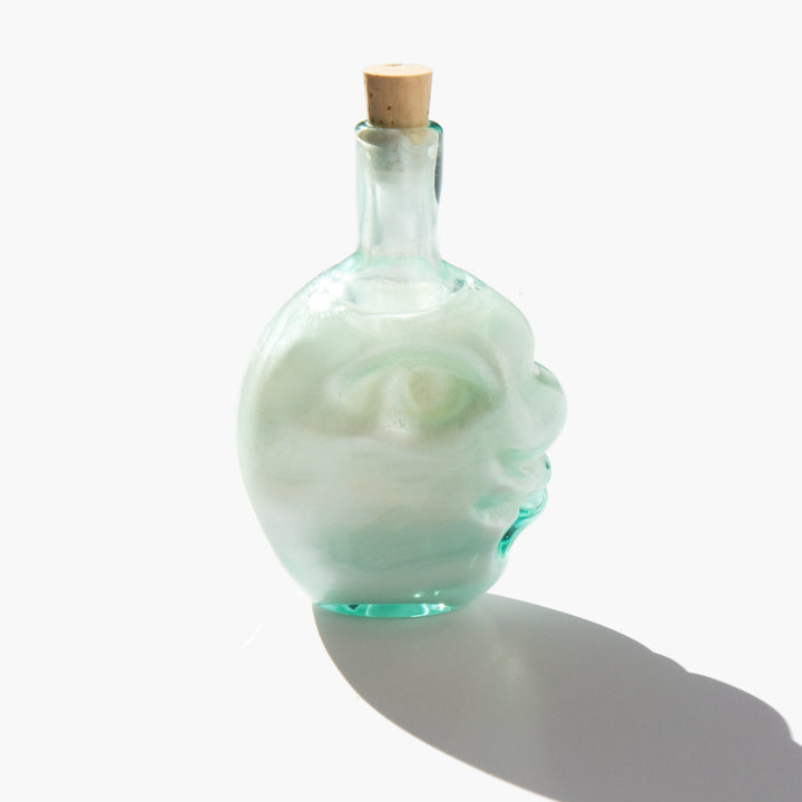 The figural face bottle in seaglass is hand blown piece by piece by a small collective of glass artisans in Illinois and shipped wax and cork sealed.