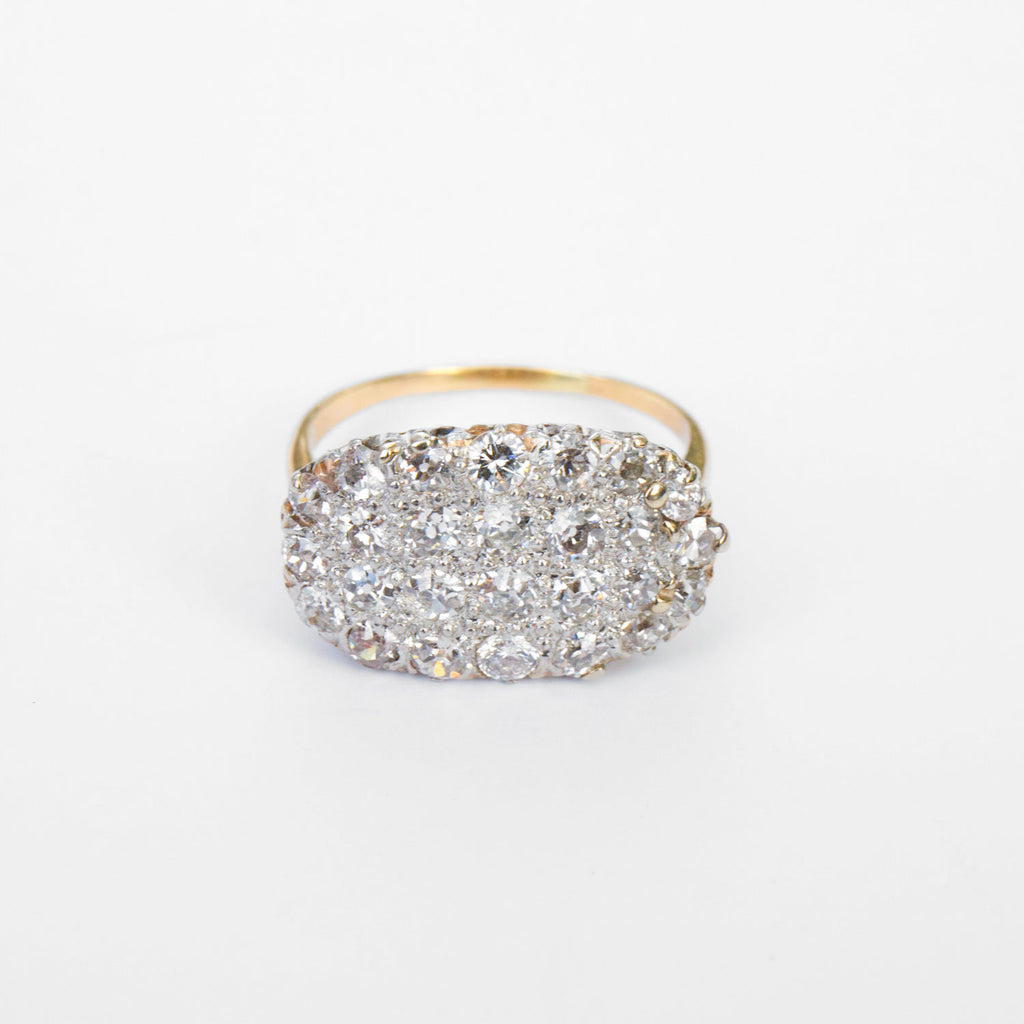 1930's 14k white diamond cluster ring with hand done gallery. Each diamond is mine cut and set in individual prongs.
