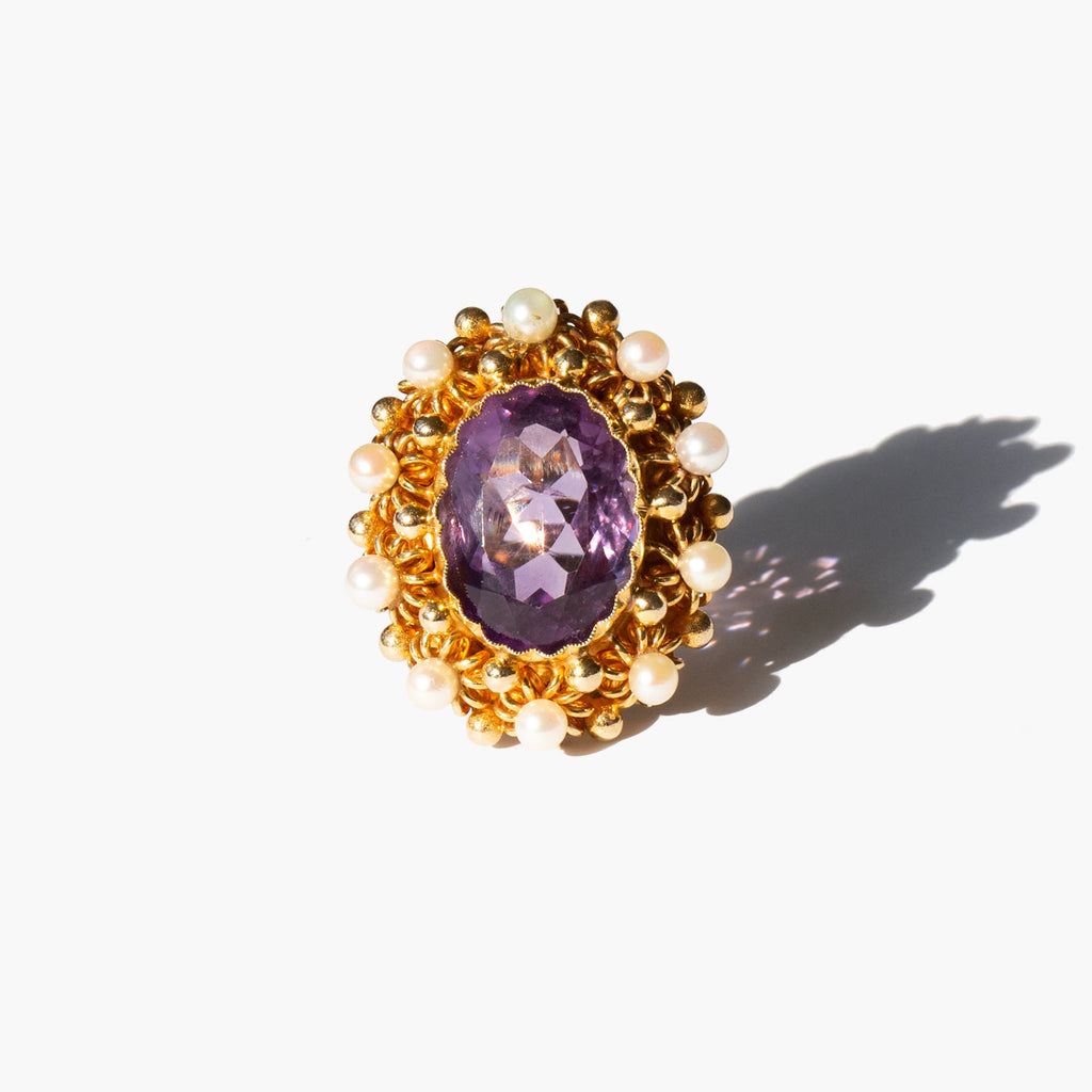 Elegant 14k gold setting with a large deep purple center amethyst and seed pearls. The February birthstone, amethyst has been known throughout the centuries as a symbol of purity and spirituality, an amulet of protection against evil, and as a talisman of wealth and success.