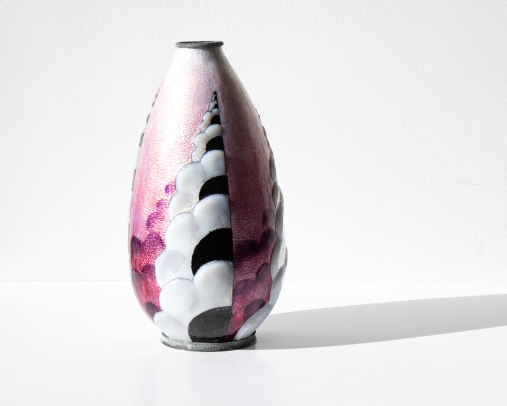 Beautifully patterned and brilliantly colored, this enameled metal vase is the work of the celebrated French enamel artist Camille Fauré (1874–1956). Fauré’s signature style was floral and figurative motifs rendered in deep, saturated hues. Working in Limoges, the historic center of French enamel, he pioneered techniques that pushed the medium into new artistic territory and today he is widely regarded as the greatest creative enamel artist of the Art Deco era.