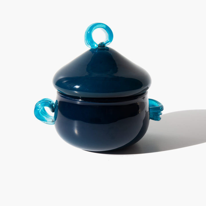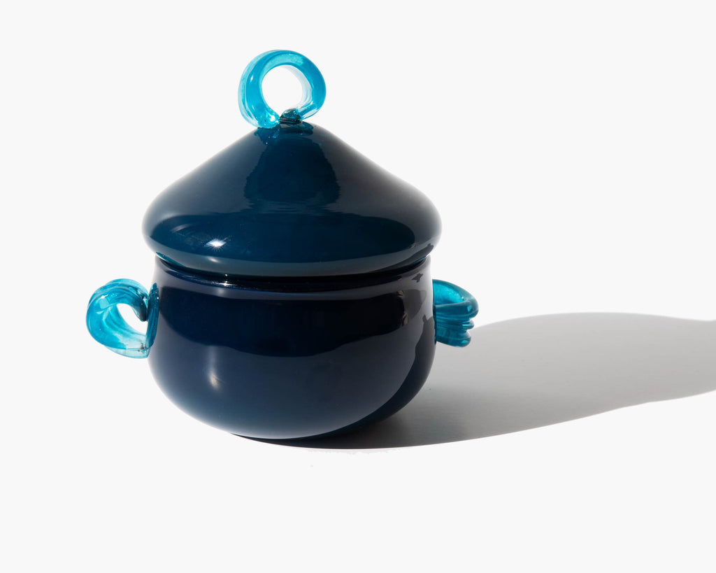 Playful handmade modernist lidded vanity jar by Canadian glass artist Alana Biffert.