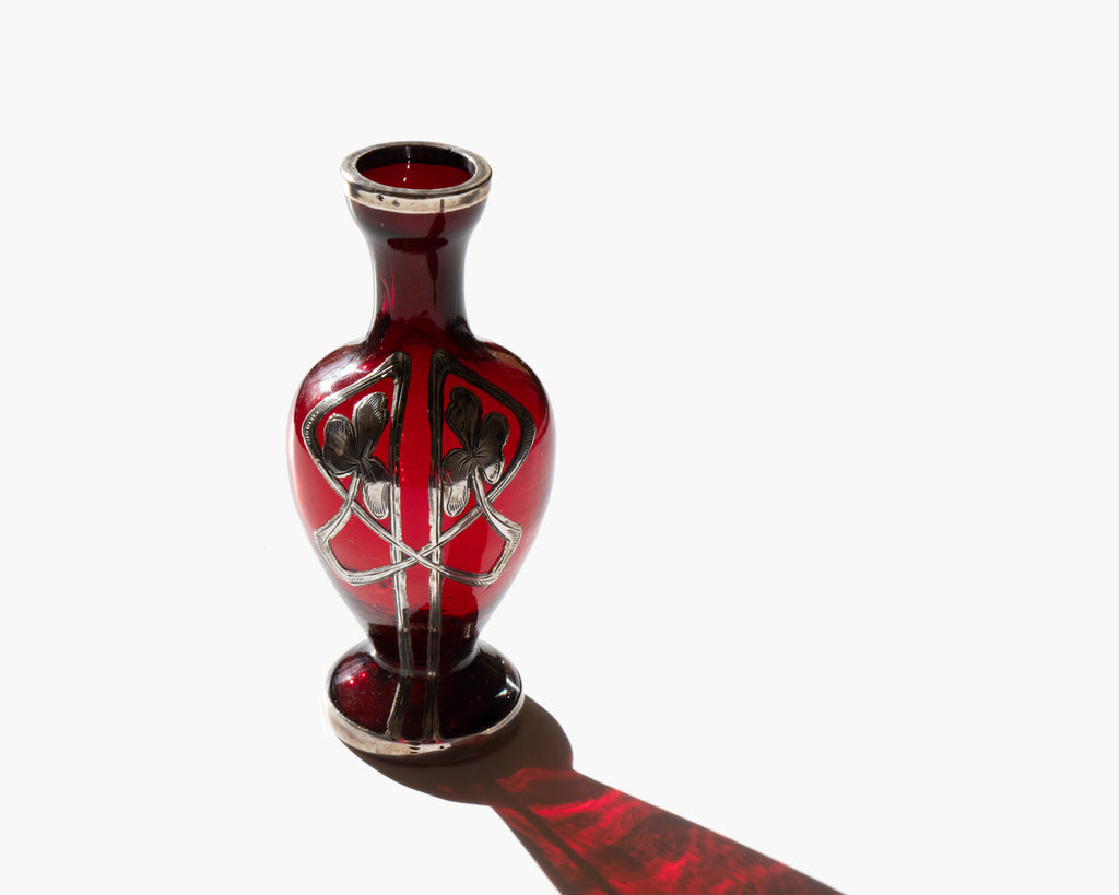 Antique Art Nouveau glass bud vase with sterling silver overlay.