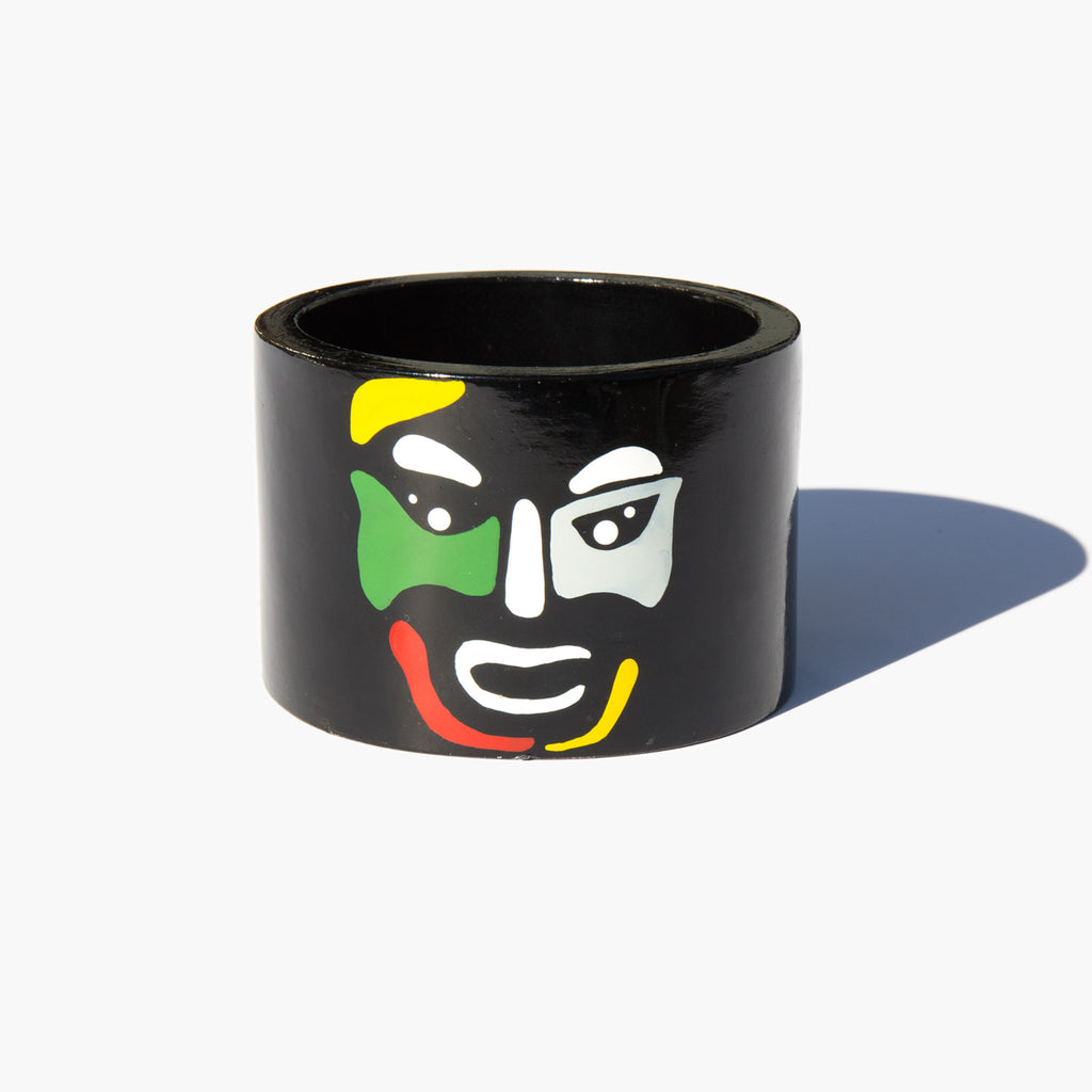 Artist made Brazilian wooden bangle with hand painted abstract faces. Inside is signed "RB" with the edition number 28/100.