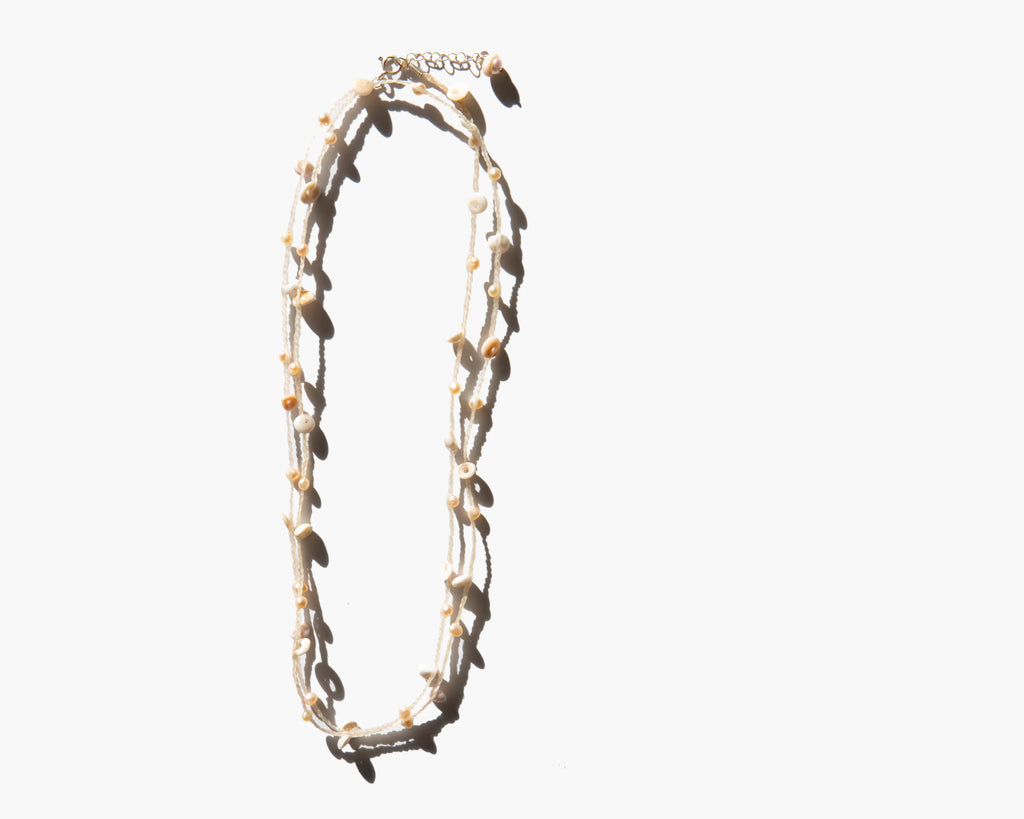 Handmade in Costa Rica, hand braided waxed cord strung with tiny natural shells and a sterling silver closure. The necklace can be worn long and loose or doubled.