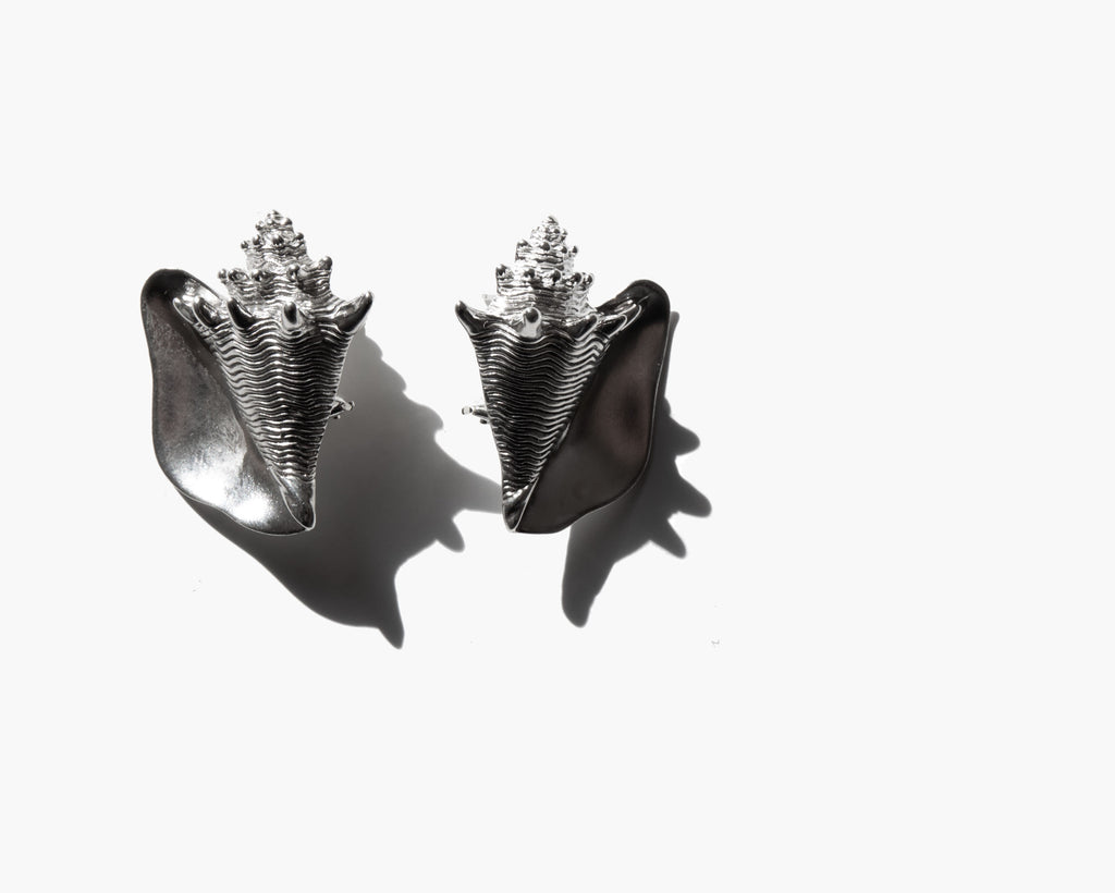Solid sterling silver conch shell earrings with omega backs.