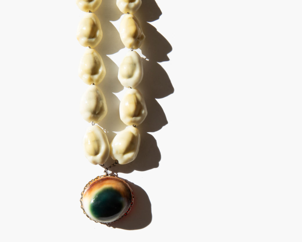 Antique handmade sterling silver necklace made with cowrie shells and a center operculum. The cowrie shell is a yonic symbol that represents fertility, feminine powers, healing, magic, and good luck. An operculum is a sort of door that covers the opening of a marine gastropod shell when the animal is retracted, thus sealing it off from danger and protecting it from predators. The Victorians used these small shells that resemble cat eyes as talismans to protect against the evil eye, a supernatural malevolent glare that can be cast on the unsuspecting, causing misfortune, injury, and even death.
