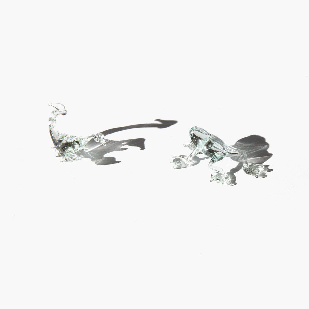 Small and beautifully detailed hand blown glass scorpion and frog. An early 20th century fable, based on a much earlier Persian story, the scorpion and the frog have come to symbolize the difficulties that humans have breaking free of their innate nature.
