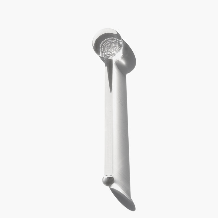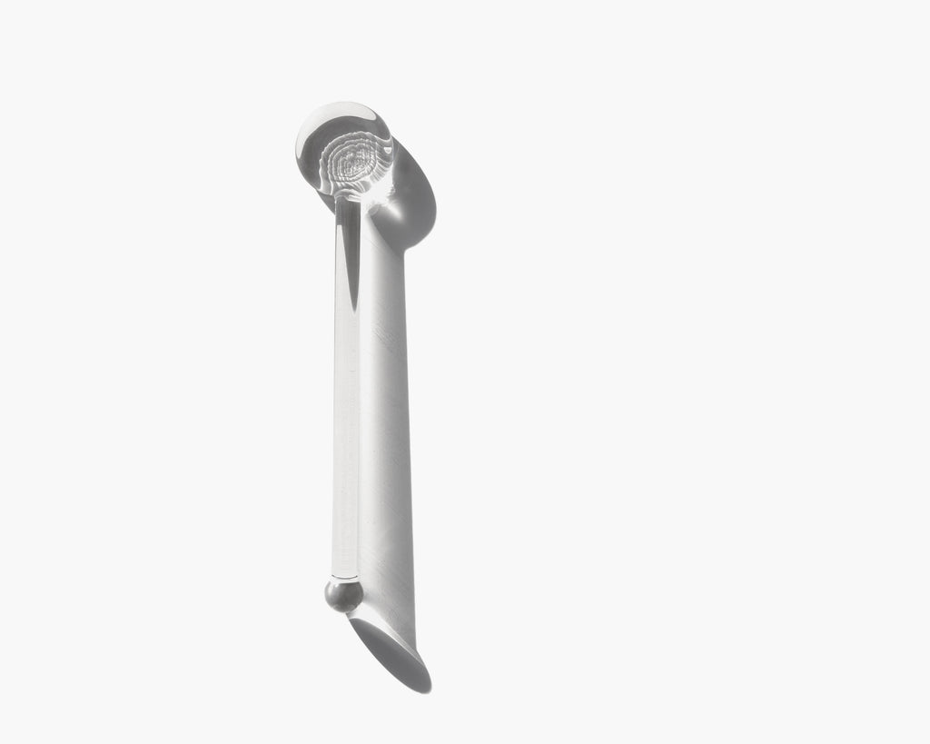 Handmade clear glass spoon for mask mixing. The straight end of the spoon can also be used as a dropper for our larger bottles of Sonoran Jojoba Oil, Argan Oil, and Unicorn Multiuse Oil. Each sculptural spoon is handmade by our glass artisans.