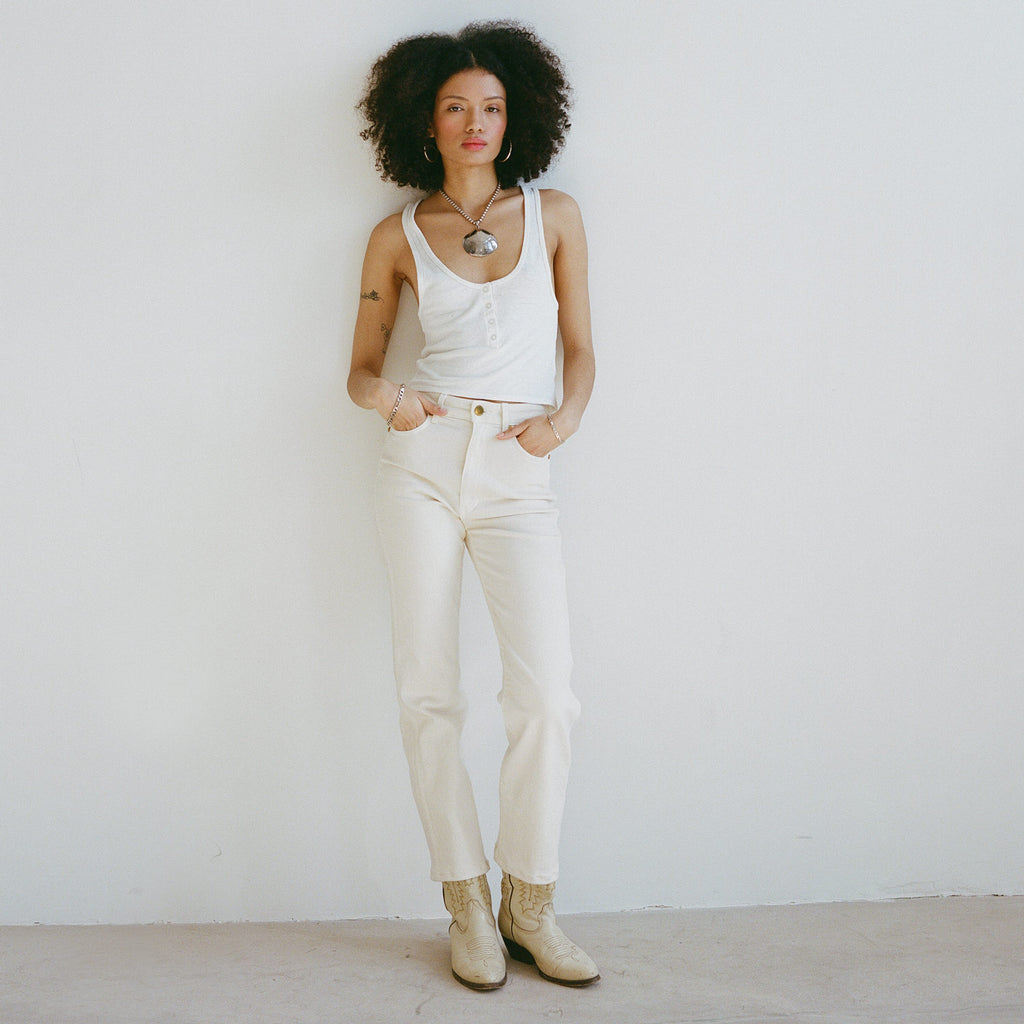 An updated classic tank with a waist-skimming, slim-fit and a deep, flattering neckline with snaps that can be buttoned up or left open, depending on the mood. The tank is made with a broken-in, soft, and sustainable hemp and organic cotton blend. **THIS ITEM IS FINAL SALE.