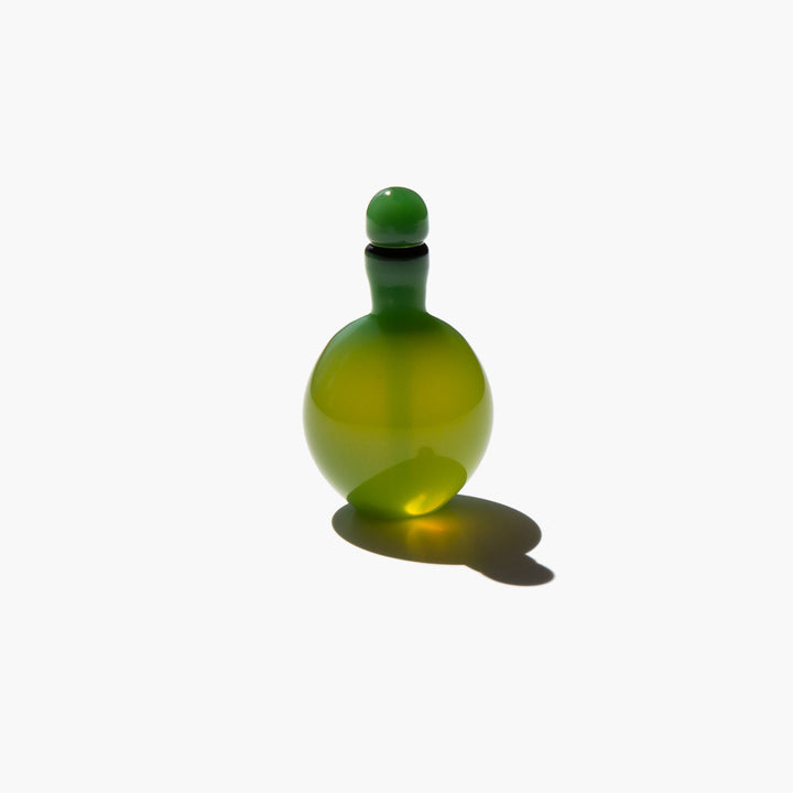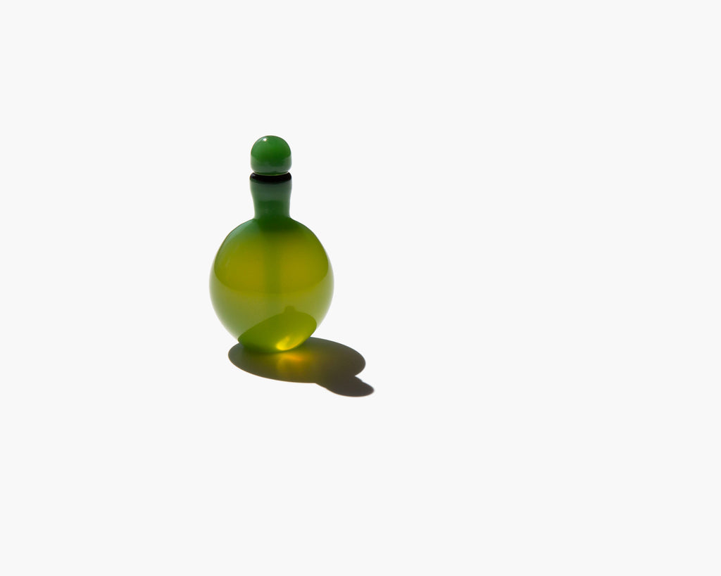 The hand blown glass bottles are inspired by 19th century stone and ceramic snuff bottles. Each sculptural bottle is a distinctive work of art, blown by a master glass artisan in Illinois, and shipped using the ancient method of cork and wax sealing.