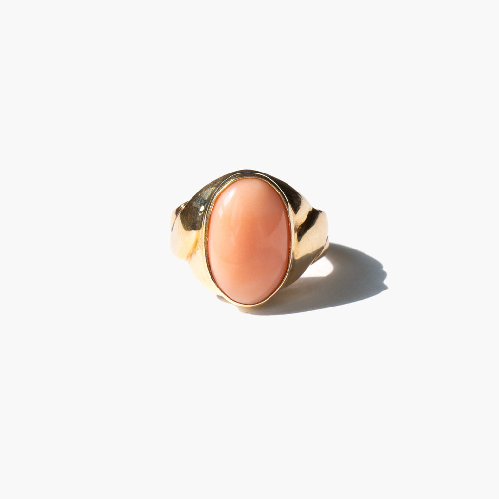 Elegant 14k gold and pink coral ring. During the Victorian period coral was given to children to protect them from becoming a changeling, a fairy child swapped and left in the place of a human child. Still thought to have protective powers, coral is said to guard against demonic powers, curses, and the destructive forces of the Evil Eye.