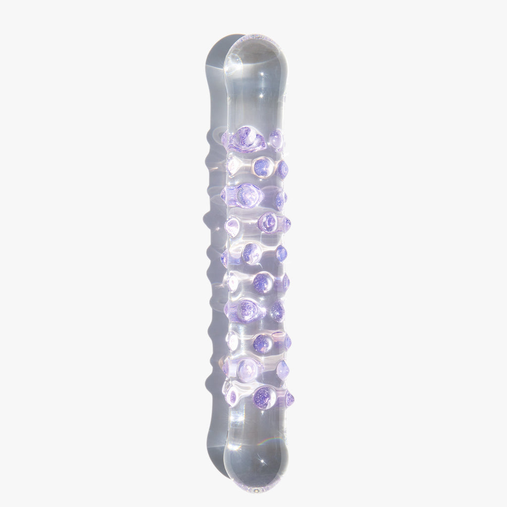 A Kindred Black original – hand blown glass sex toy, with a beautifully crystal clear shaft, peppered with pleasure ridges in an ethereal pale lavender. A minimal piece of pleasure art.