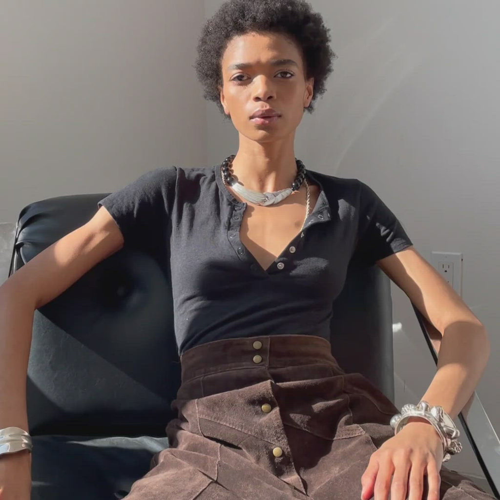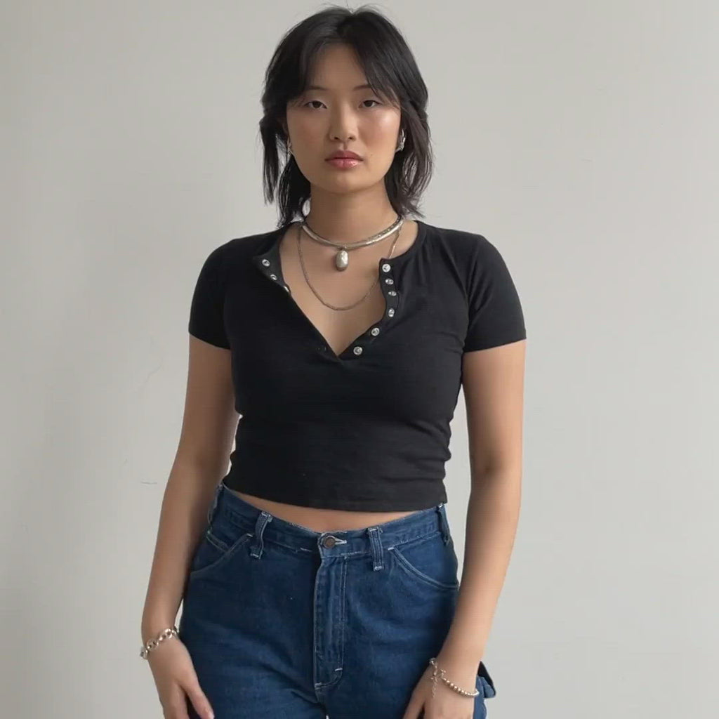 Our day to night – a form fitting and cropped tee with a deep, snap front v-neck that can be worn open or buttoned-up. Made in a broken-in, soft, and sustainable hemp and organic cotton blend. **THIS ITEM IS FINAL SALE.