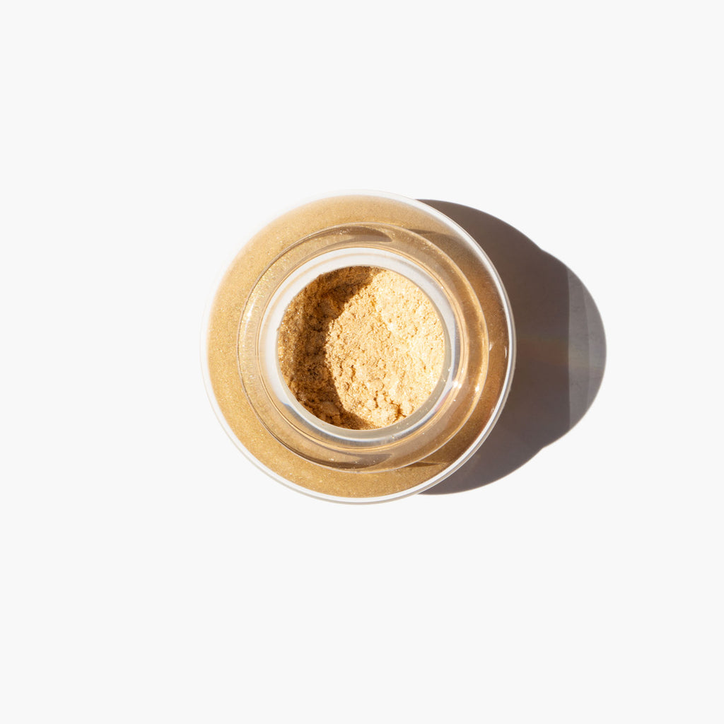 A simple, loose powder eye shadow handmade in small batches with a base of natural arrowroot and Sonoran jojoba oil from a family-run farm in the desert. Golden Hour is a warm sunlit wheat with metallic golden radiance, a wash of pearlescent color for the eyes that also looks fantastic when applied to highlight the cheek and collar bones.