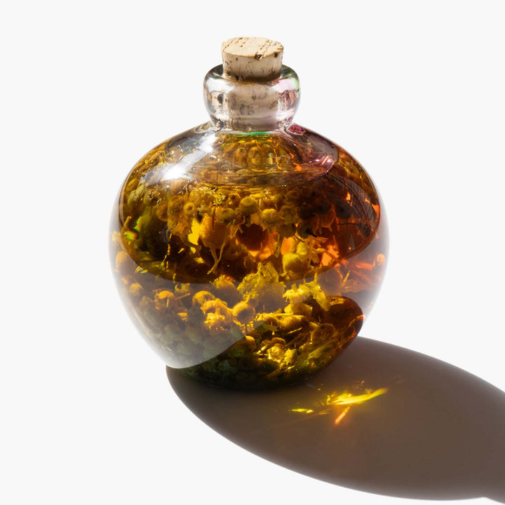 A small batch infusion of golden Sonoran Desert jojoba oil slowly infused with whole chamomile flowers. This started as something simple that we made for an event, flowers resting in a healing body oil, slowly infusing it with their soothing properties. We brought the samples back home and began using them ourselves, moving the bottles around the house – next to the kitchen sink for our hands after washing dishes, by the bath for a soak, in the work studio throughout the day. We can imagine ourselves when it’s warmer reaching for it after gardening or after an outdoor shower at the beach. Versatile, healing, and calming, this limited edition is in a special larger size of our rainbow kaleidoscope bottles, hand blown in Mexico by artisans that use recycled glass and renewable energy for their craft.