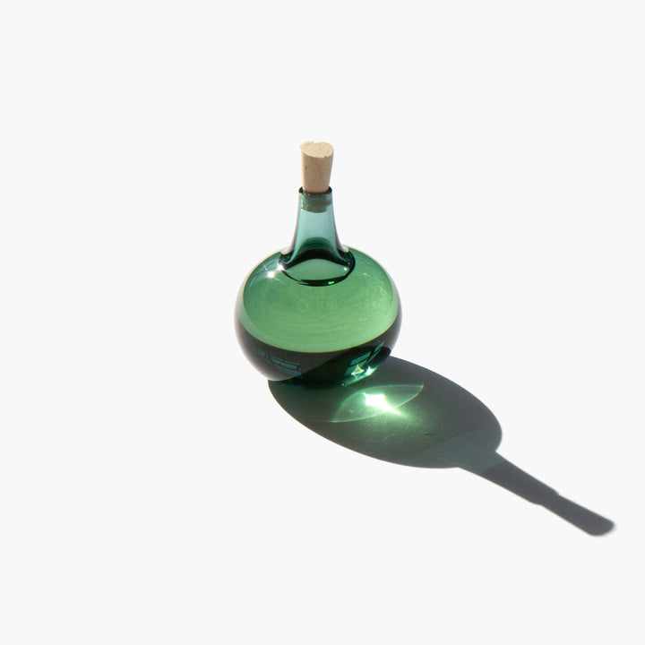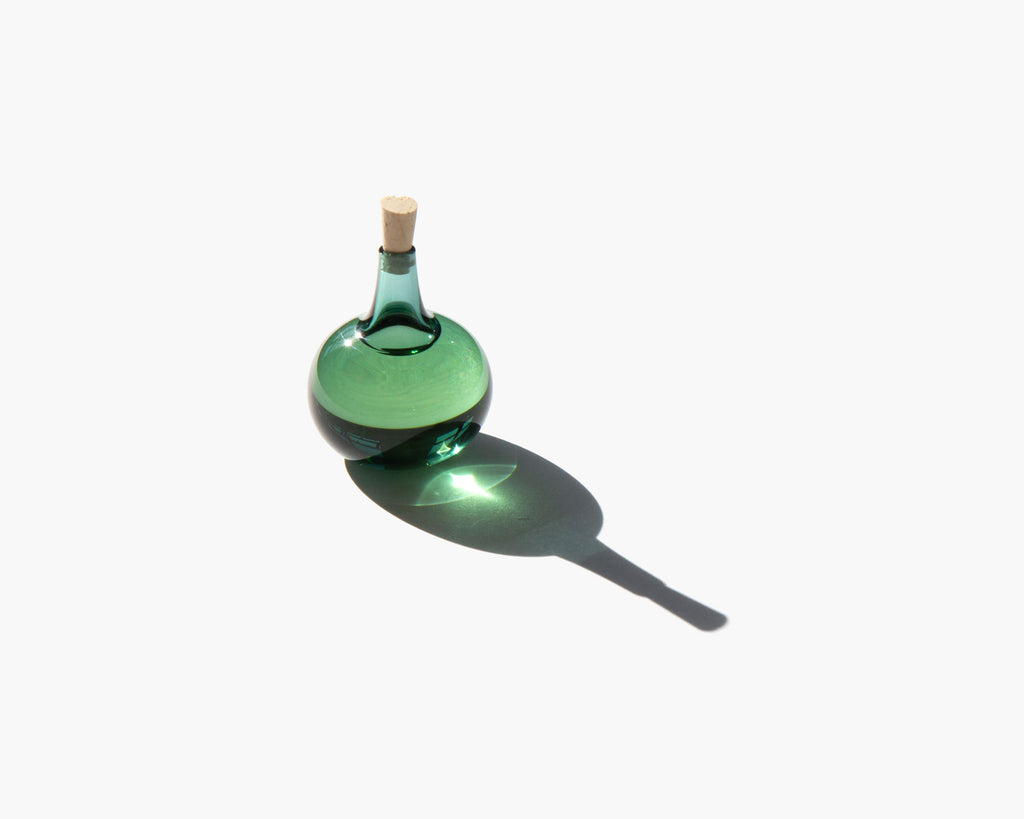 Each bottle is a distinctive work of art, hand blown by a master glass artisan in Illinois, and shipped using the ancient method of cork and wax sealing.