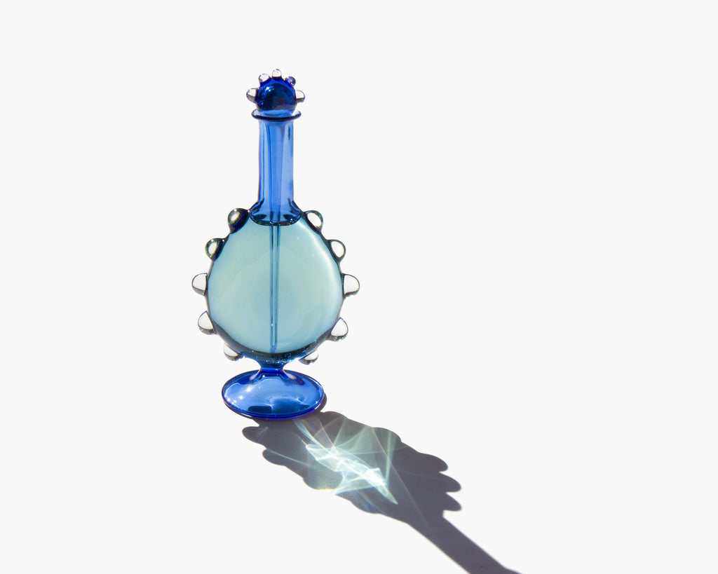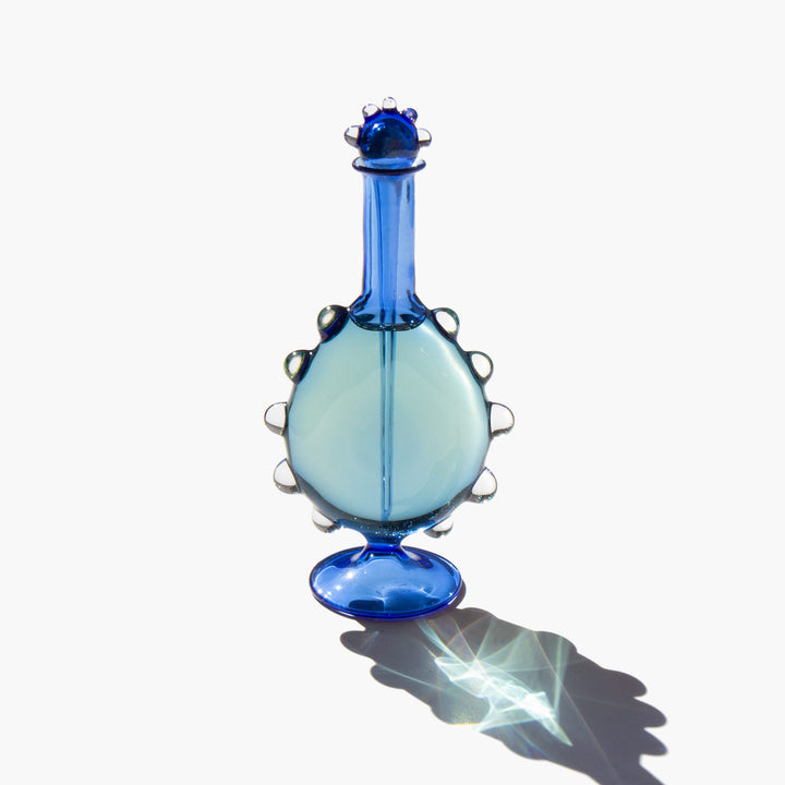 Each bottle is a distinctive work of art, hand blown by a master glass artisan in Illinois, and shipped using the ancient method of cork and wax sealing.
