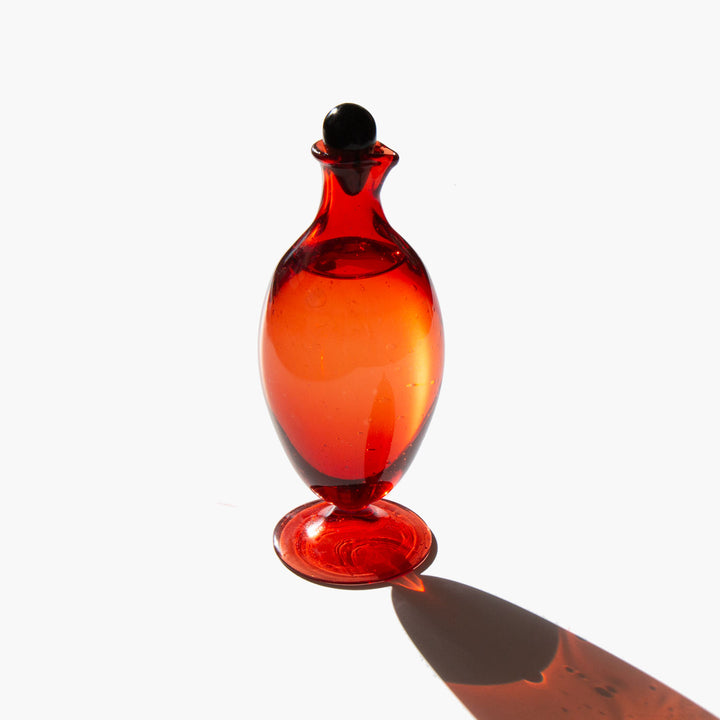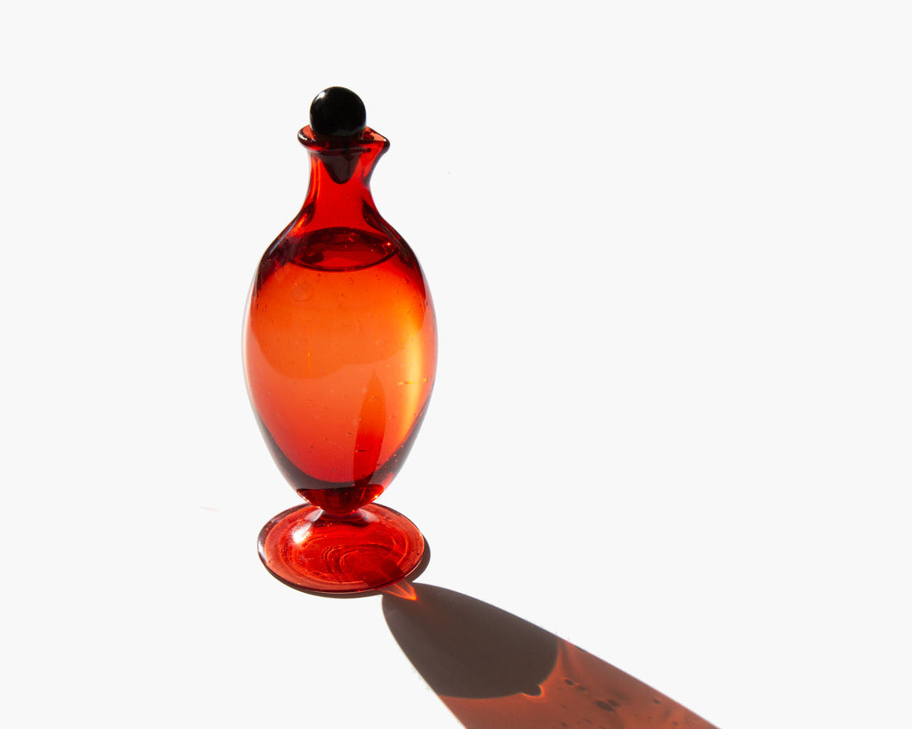 Each ruby pouring flacon is a distinctive work of art, hand blown by a master glass artisan in Illinois. A work of art not meant to be secreted away, the bottle looks beautiful at the bedside.