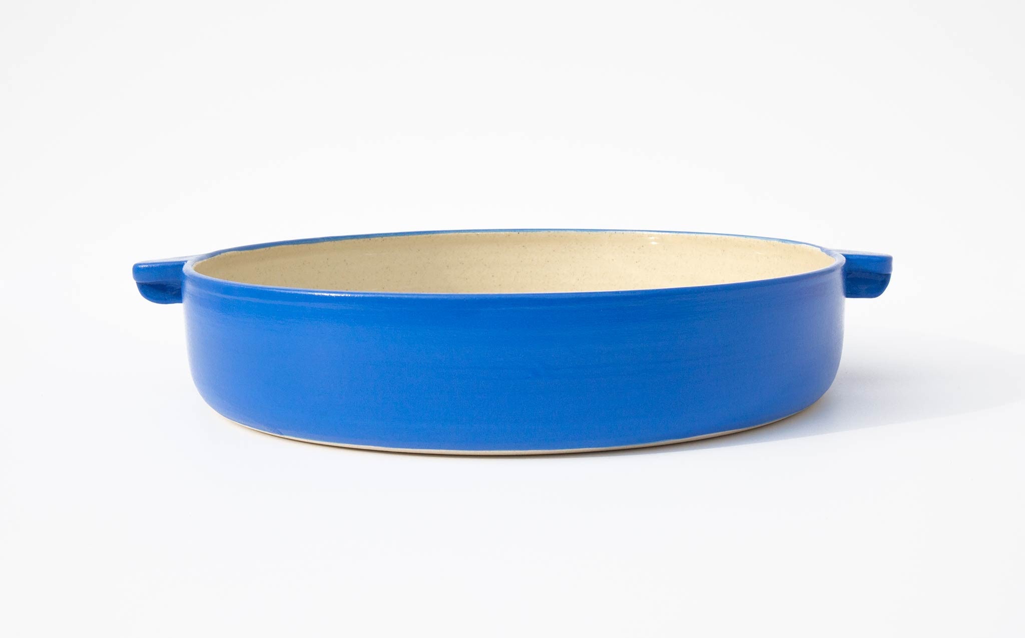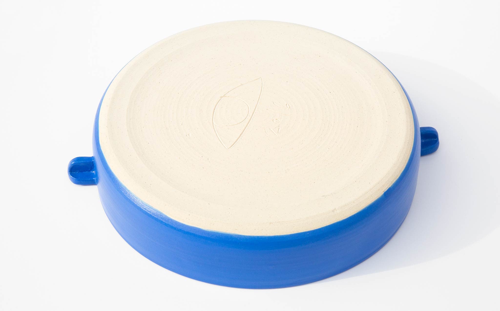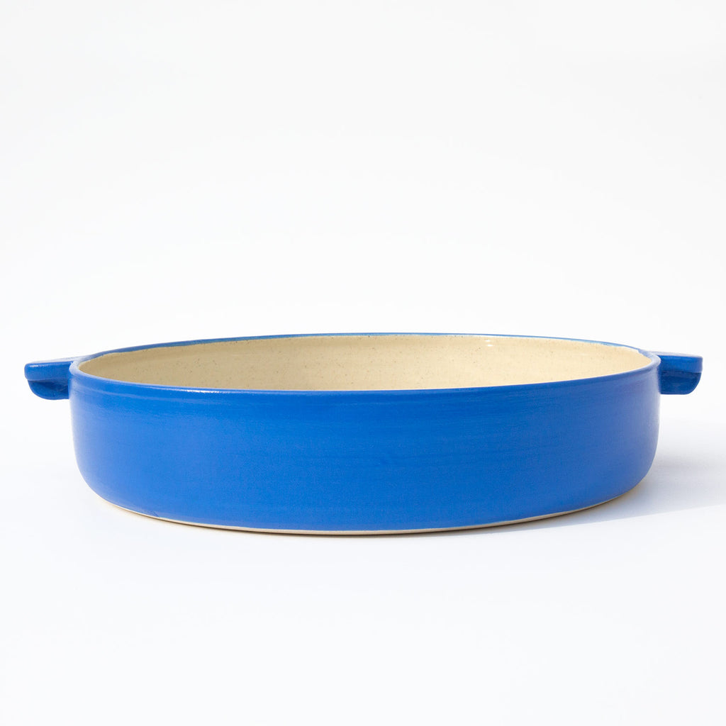 Hand-thrown stoneware casserole glazed a deep and clear, matte royal blue with a clear glossy interior.