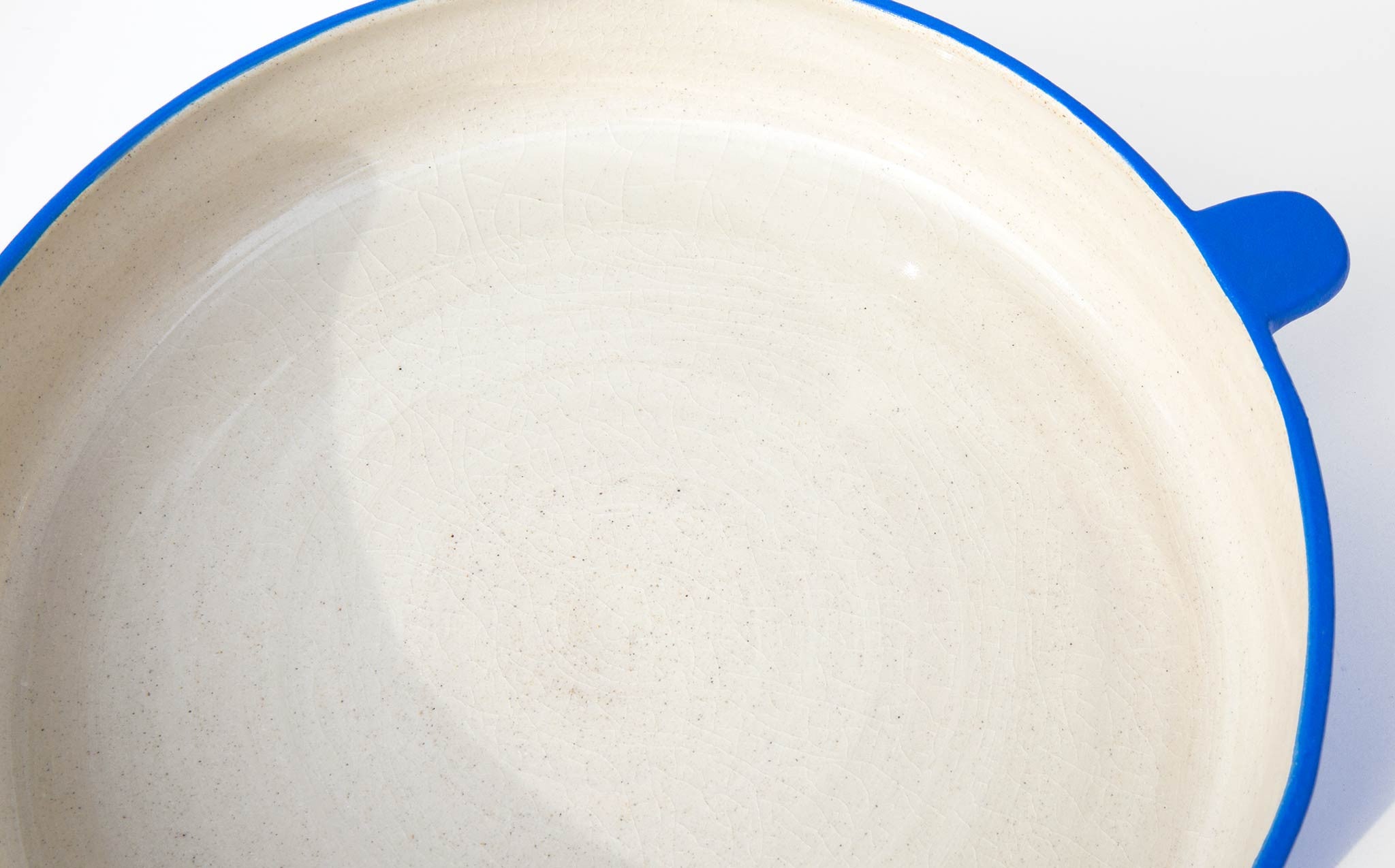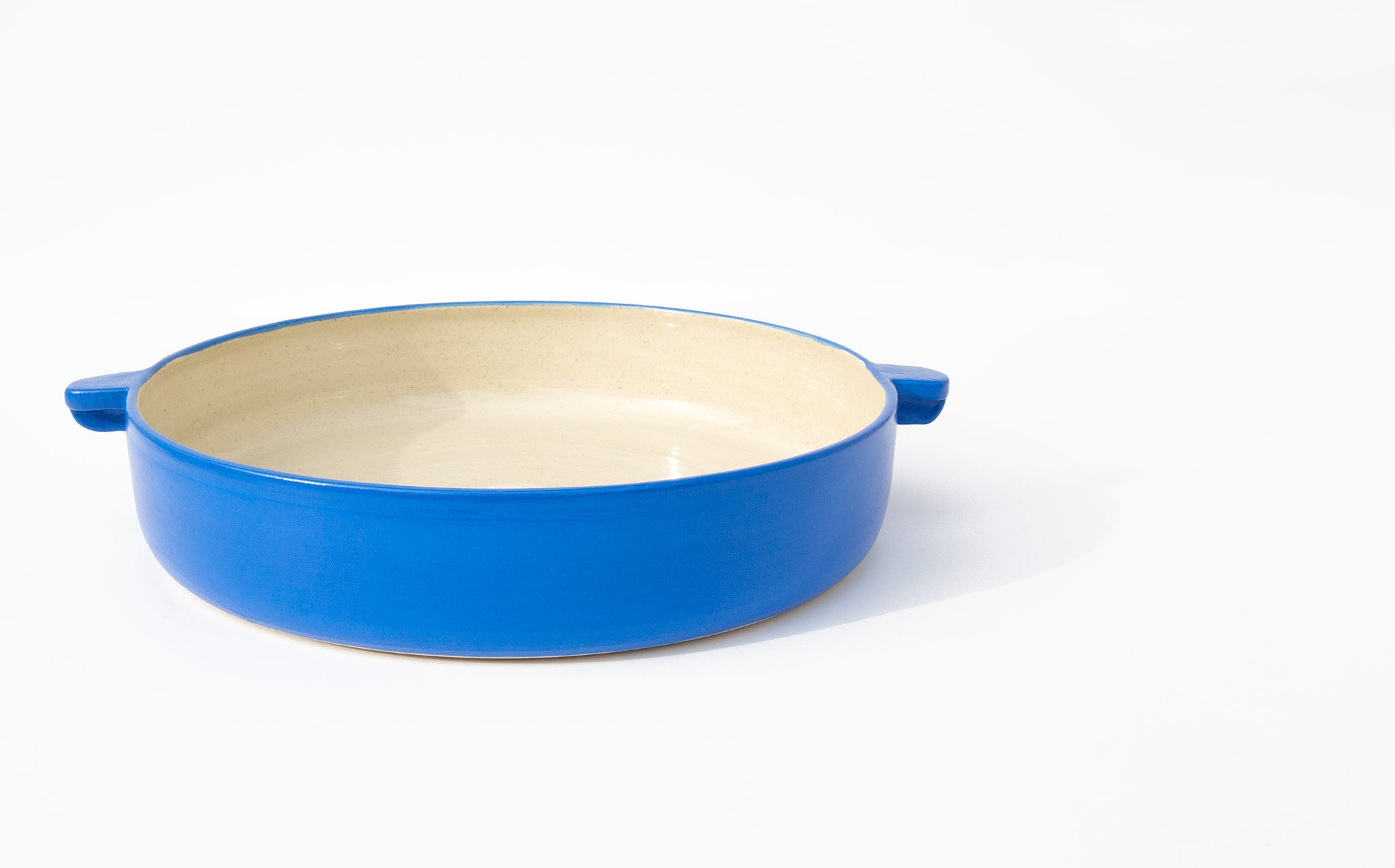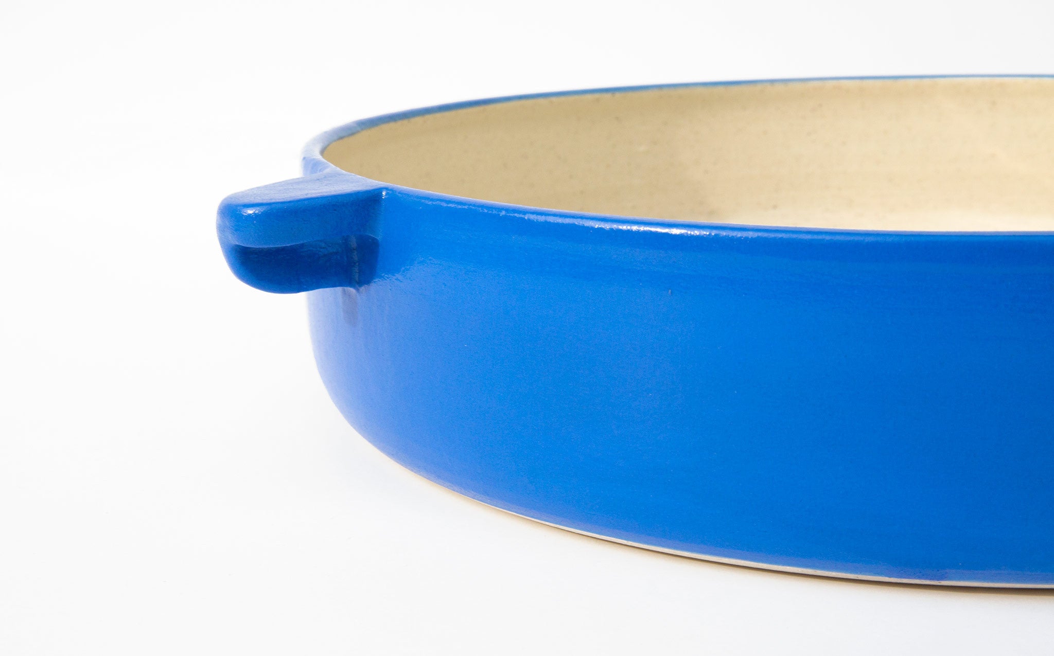 Hand-thrown stoneware casserole glazed a deep and clear, matte royal blue with a clear glossy interior.