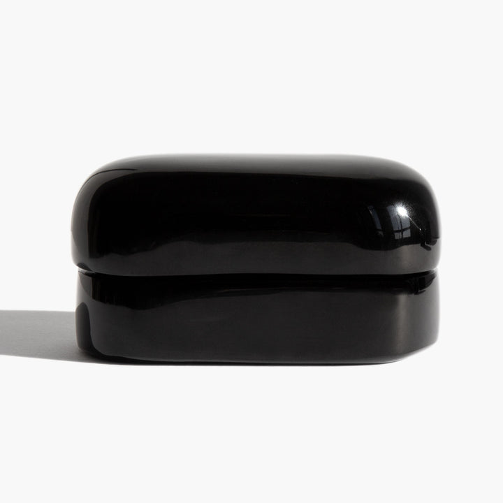 Hand carved and polished solid obsidian box. The deep black obsidian is mined communally in the Mexican state of Hidalgo and worked by hand in a workshop near the Pyramid of the Moon in Teotihuacán. A smooth, glass-like volcanic rock, obsidian has been a tool of healing for thousands of years and is said to counter fear, anxiety, and anger, and to clear negative energy from the psyche.