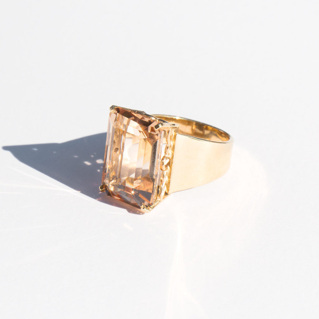 Rare large precious topaz in a 1960's handmade, salmon pink hued 14k gold cocktail setting.