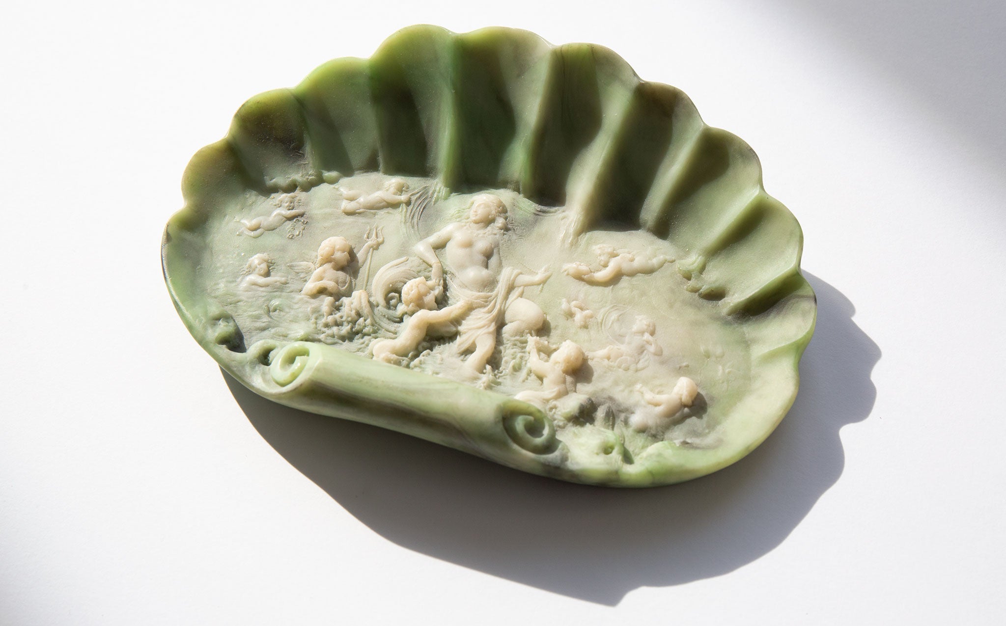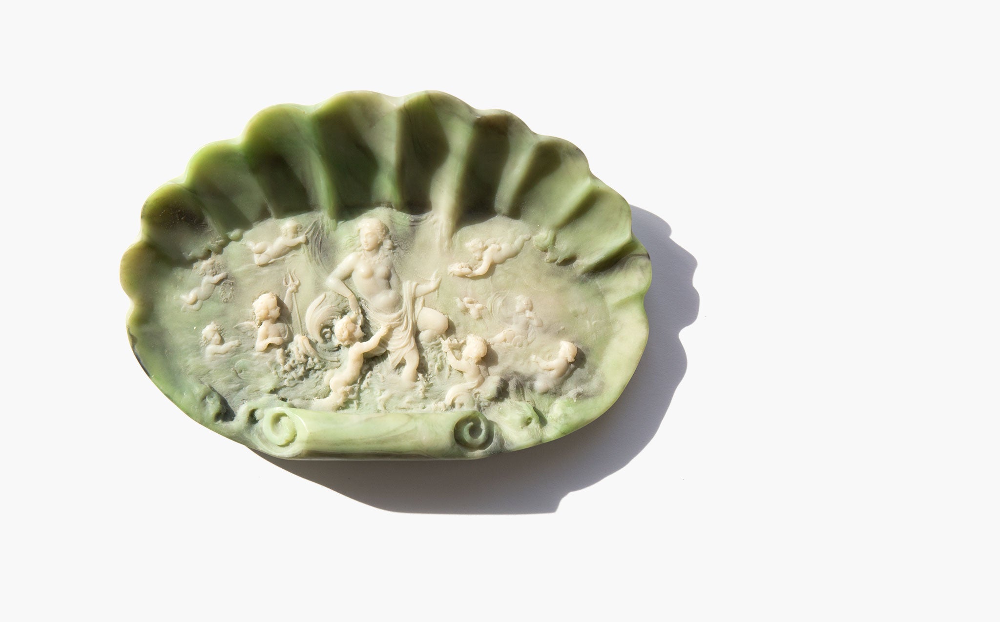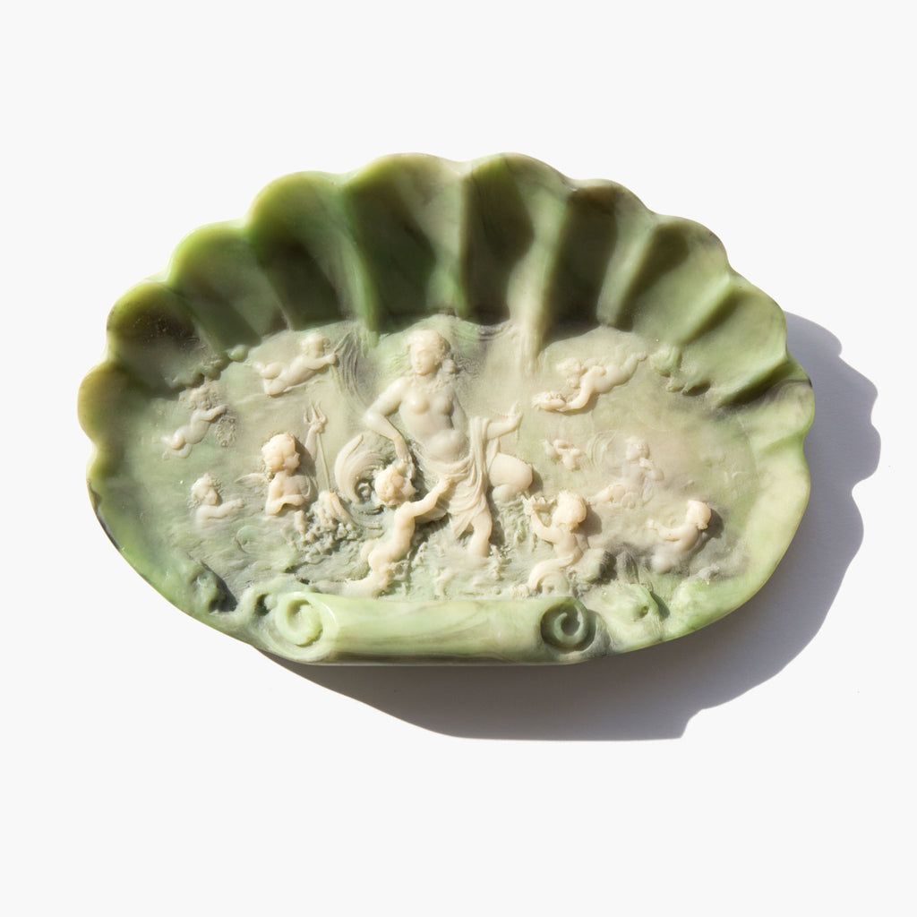 Incolay stone shell jewelry dish with an intricately carved cameo relief of Aphrodite, the ancient Greek goddess of love, beauty and pleasure, with cherubs in attendance. Incolay stone is a complex combination of natural colored minerals, such as rose quartz, sardonyx, carnelian, onyx, and banded agate, individually handcrafted to create a unique stone color formation that resembles marble. Because of the varying minerals and amounts of each, no two pieces of Incolay can ever be identical. Incolay is a coined term derived from "in-layers of color" or "in-color-lay".