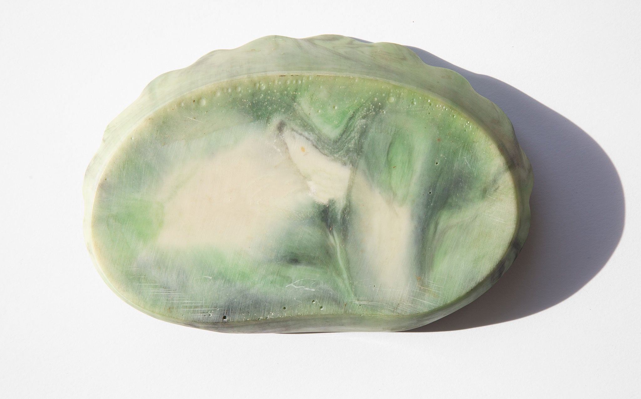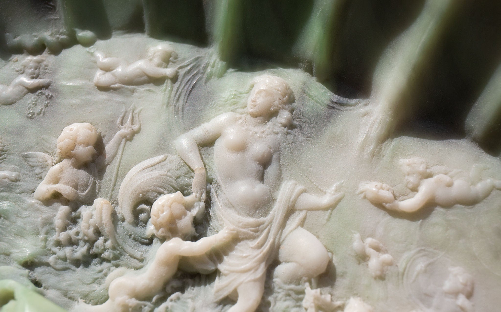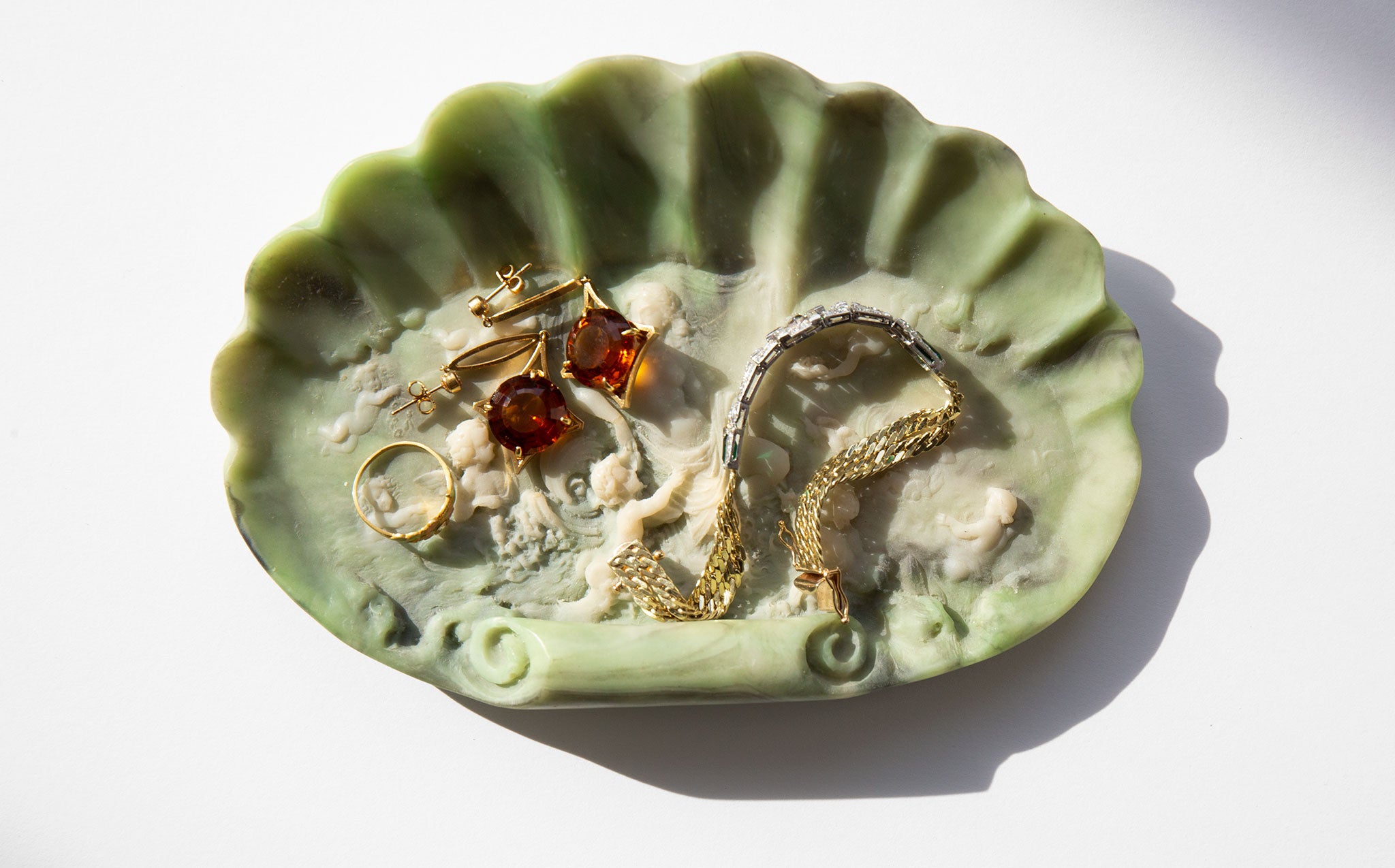 Incolay stone shell jewelry dish with an intricately carved cameo relief of Aphrodite, the ancient Greek goddess of love, beauty and pleasure, with cherubs in attendance. Incolay stone is a complex combination of natural colored minerals, such as rose quartz, sardonyx, carnelian, onyx, and banded agate, individually handcrafted to create a unique stone color formation that resembles marble. Because of the varying minerals and amounts of each, no two pieces of Incolay can ever be identical. Incolay is a coined term derived from "in-layers of color" or "in-color-lay".
