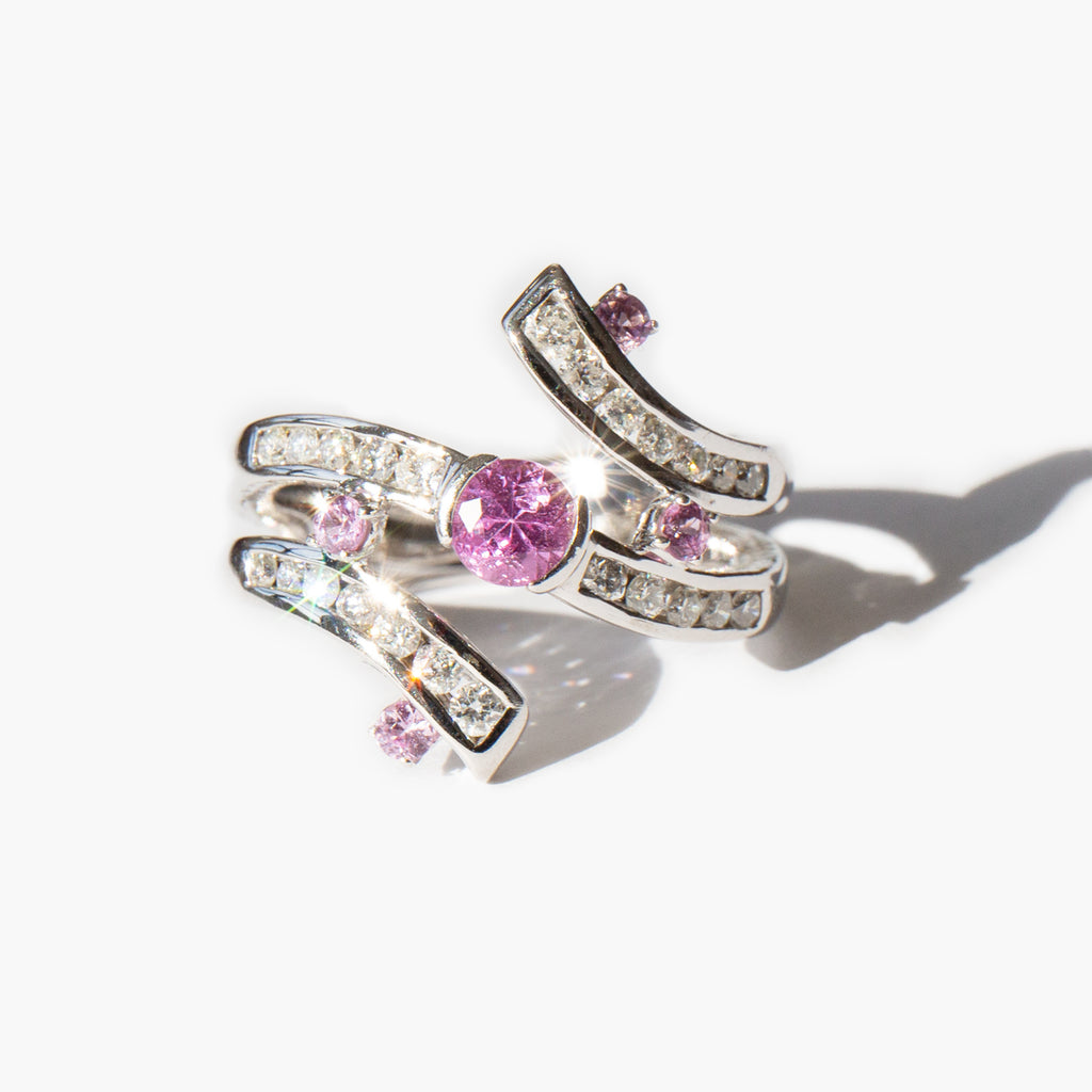 Lovely 14k white gold wrap-around ring with diamonds and pink sapphire. Pink sapphire is worn for protection, good judgement, and as a talisman of good fortune.