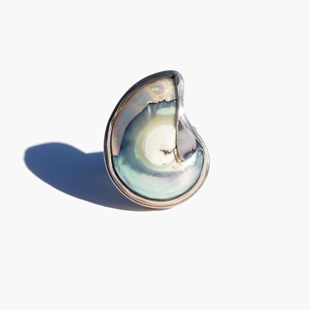 Sterling silver nautilus shell ring with swirls of sherbet hued iridescent color.