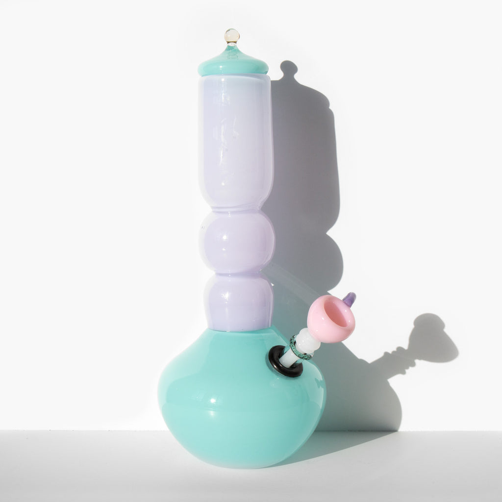 Handmade pastel glass bong by Alana Biffert, a master glass artist based in Calgary, Canada. A fusion of soft and hard glasses, these pieces are limited edition and each piece is a unique work of art that is slightly different from any other.