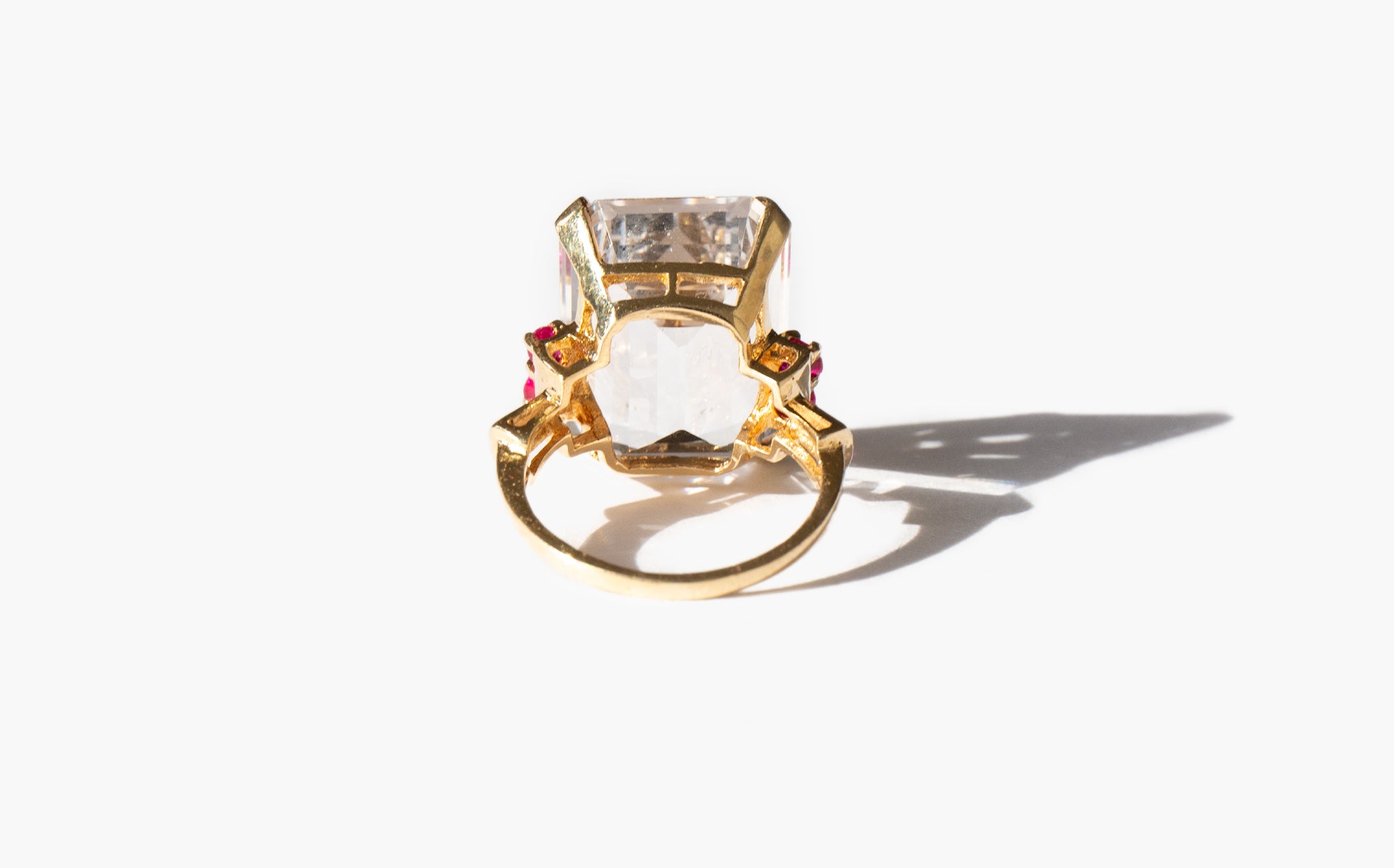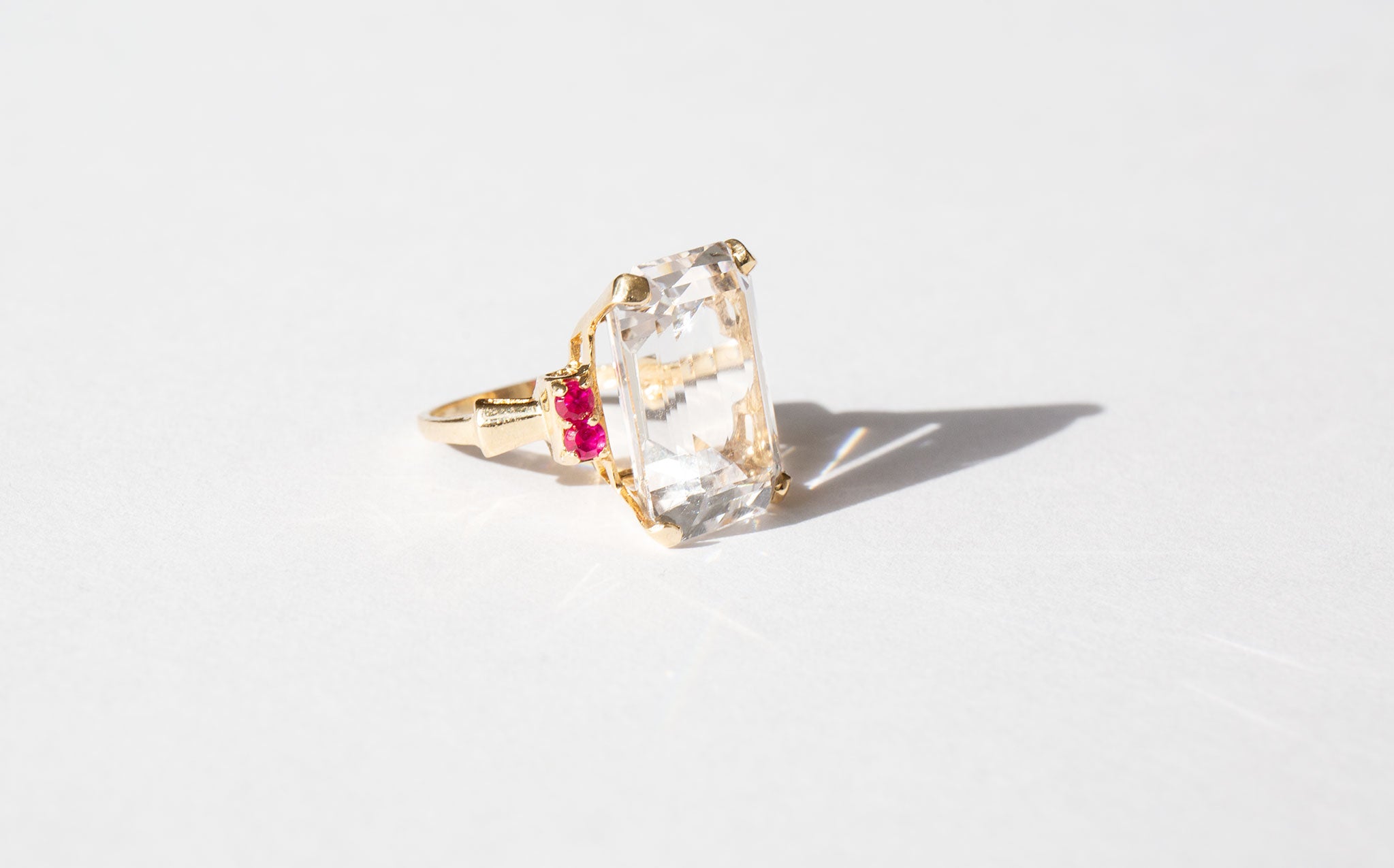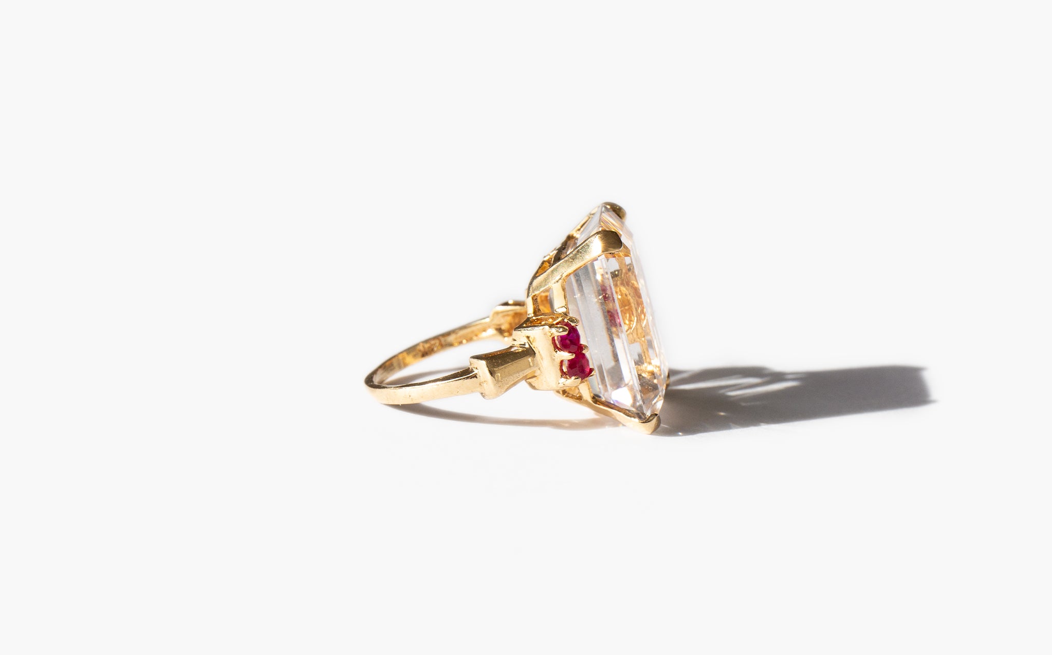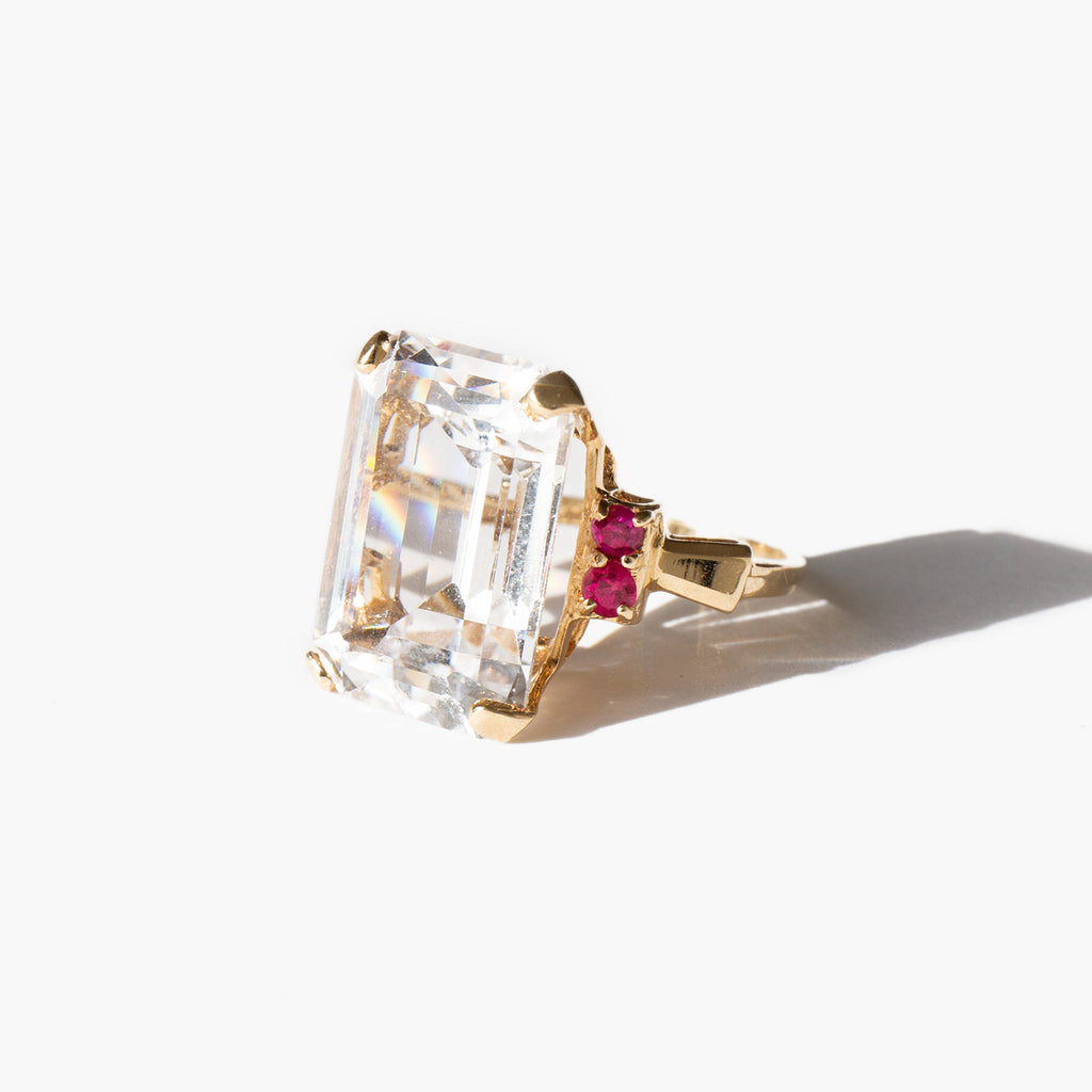 Large, sparkling cocktail ring with a center zircon flanked with small rubies.