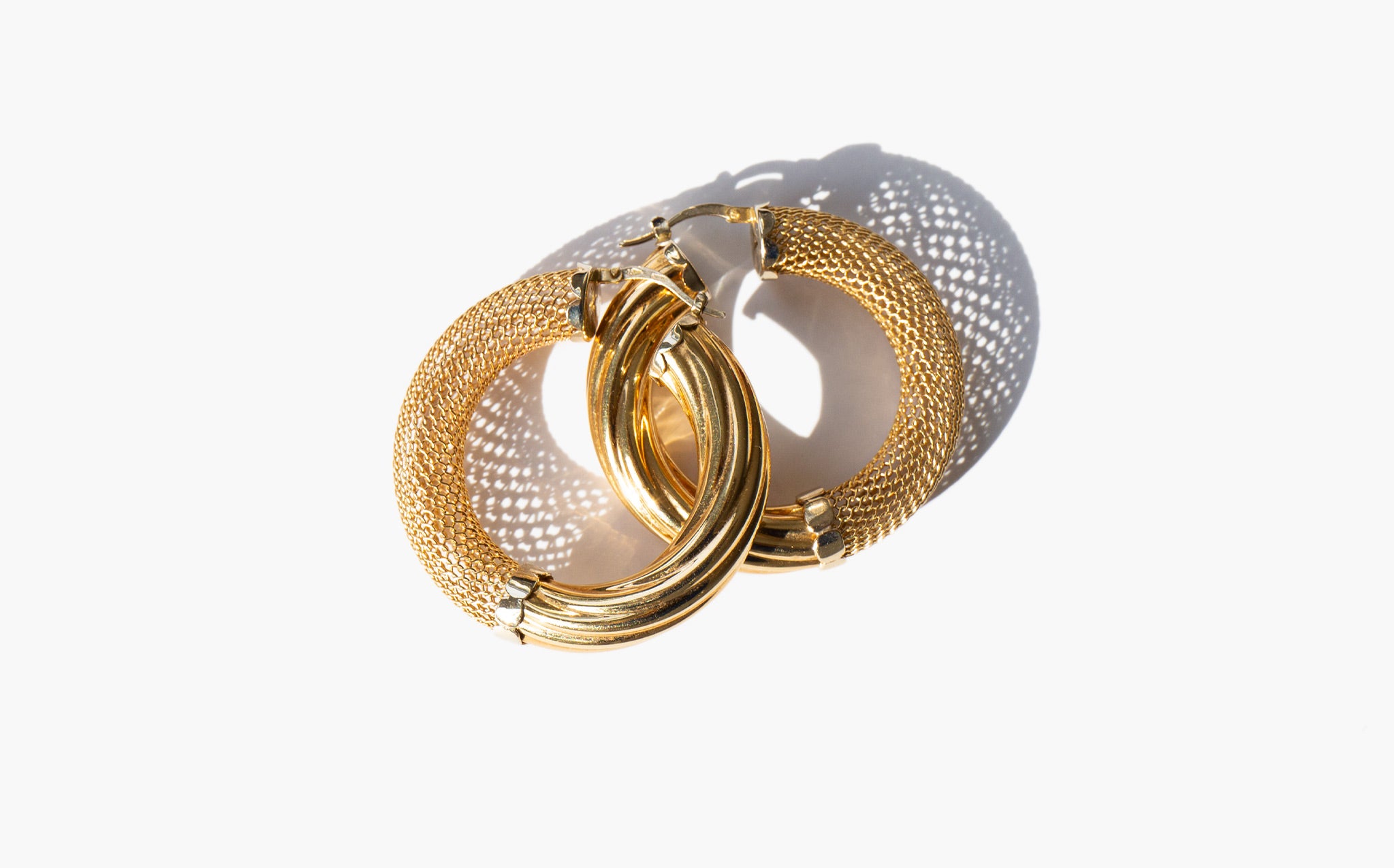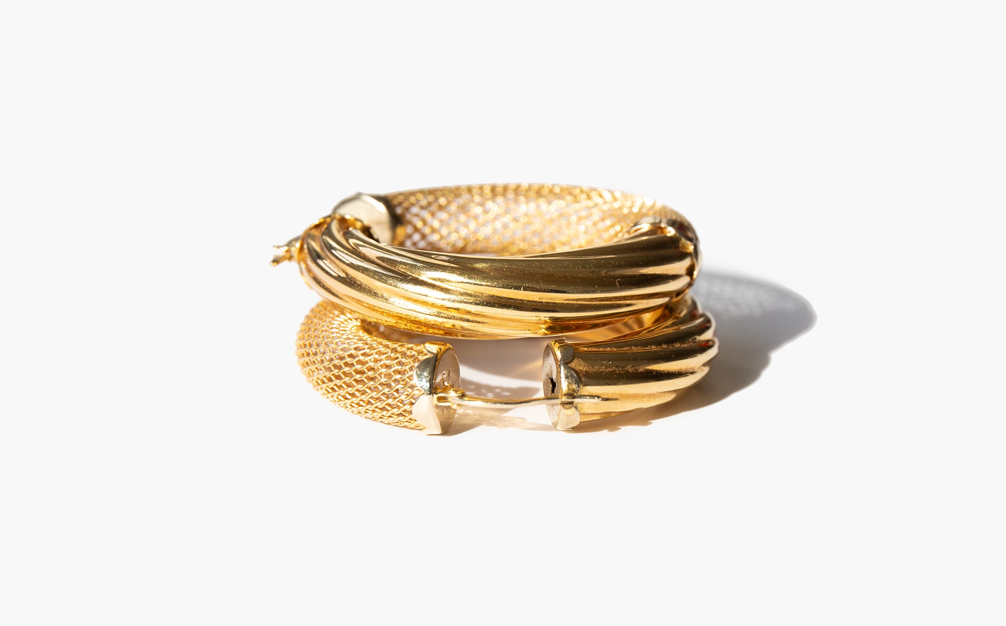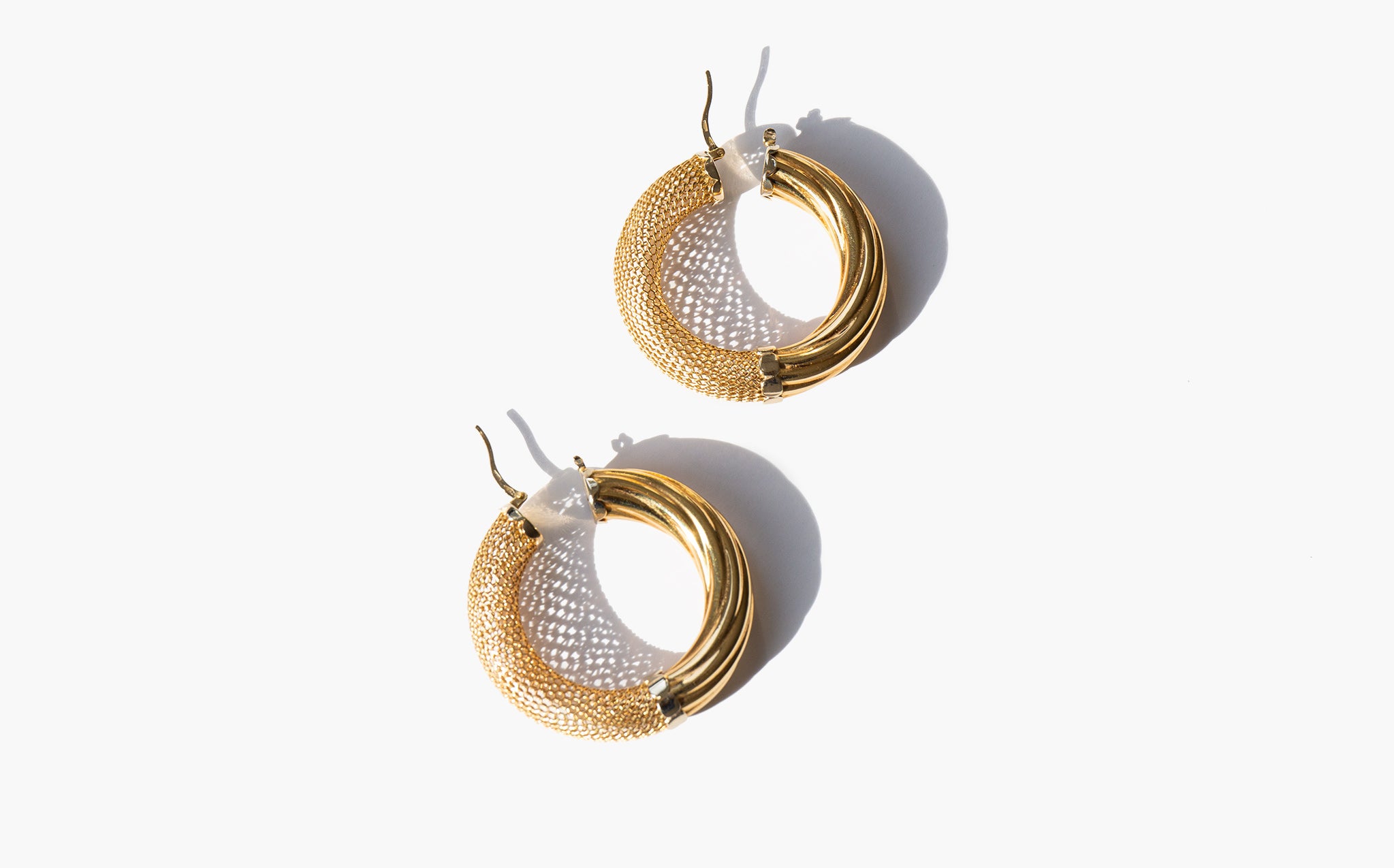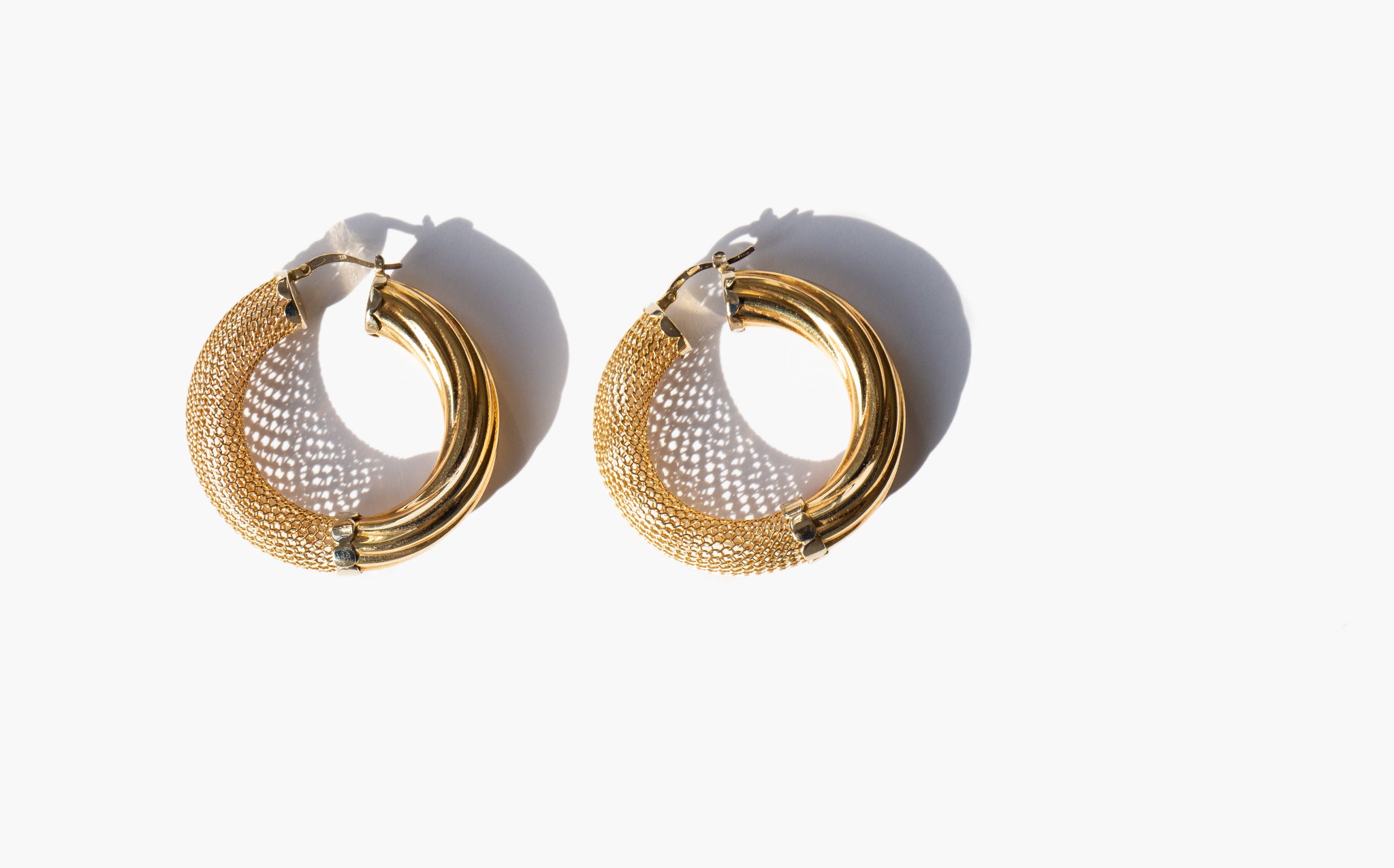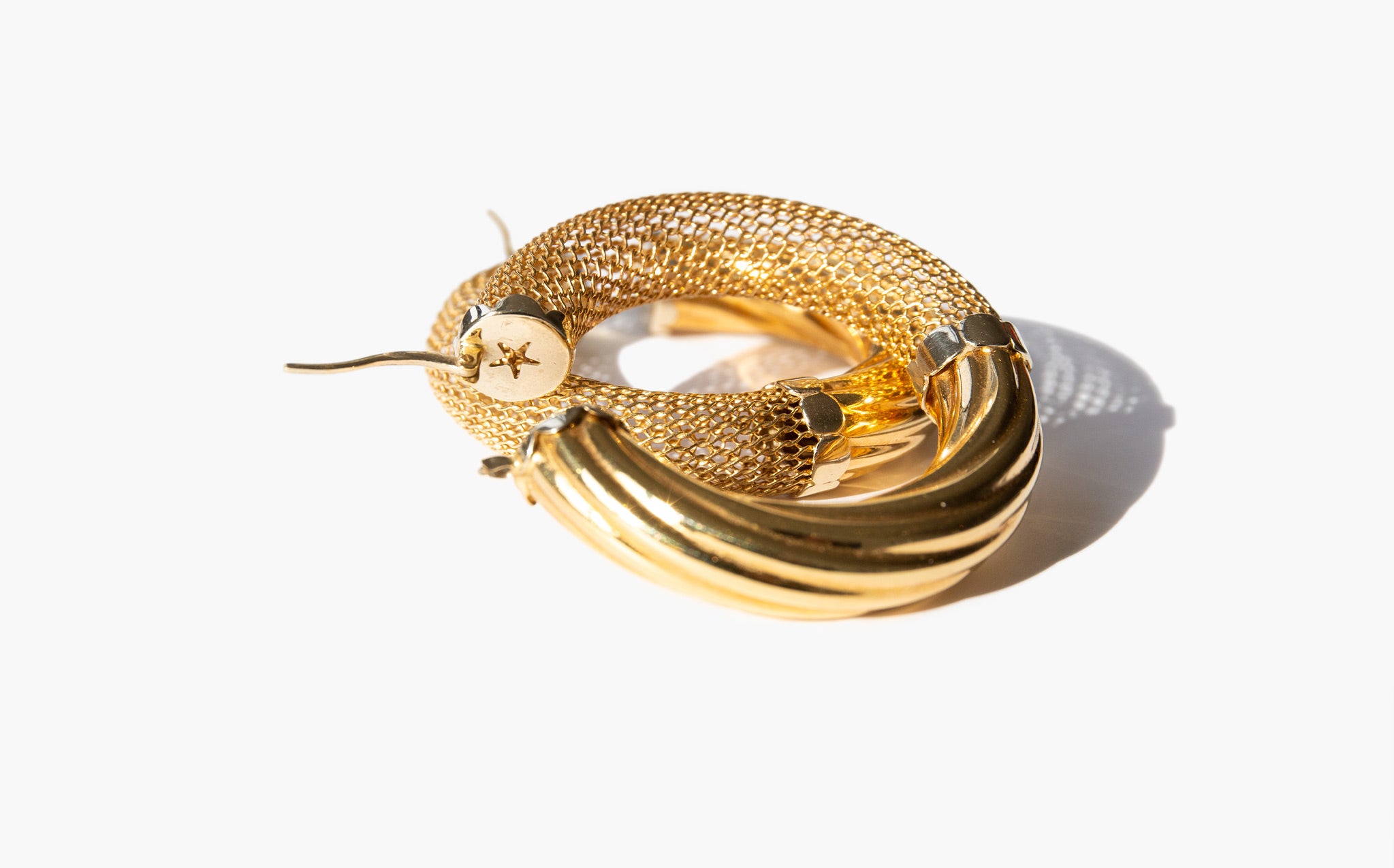 Glittering, large 18k gold stylized mesh and solid hoop earrings.