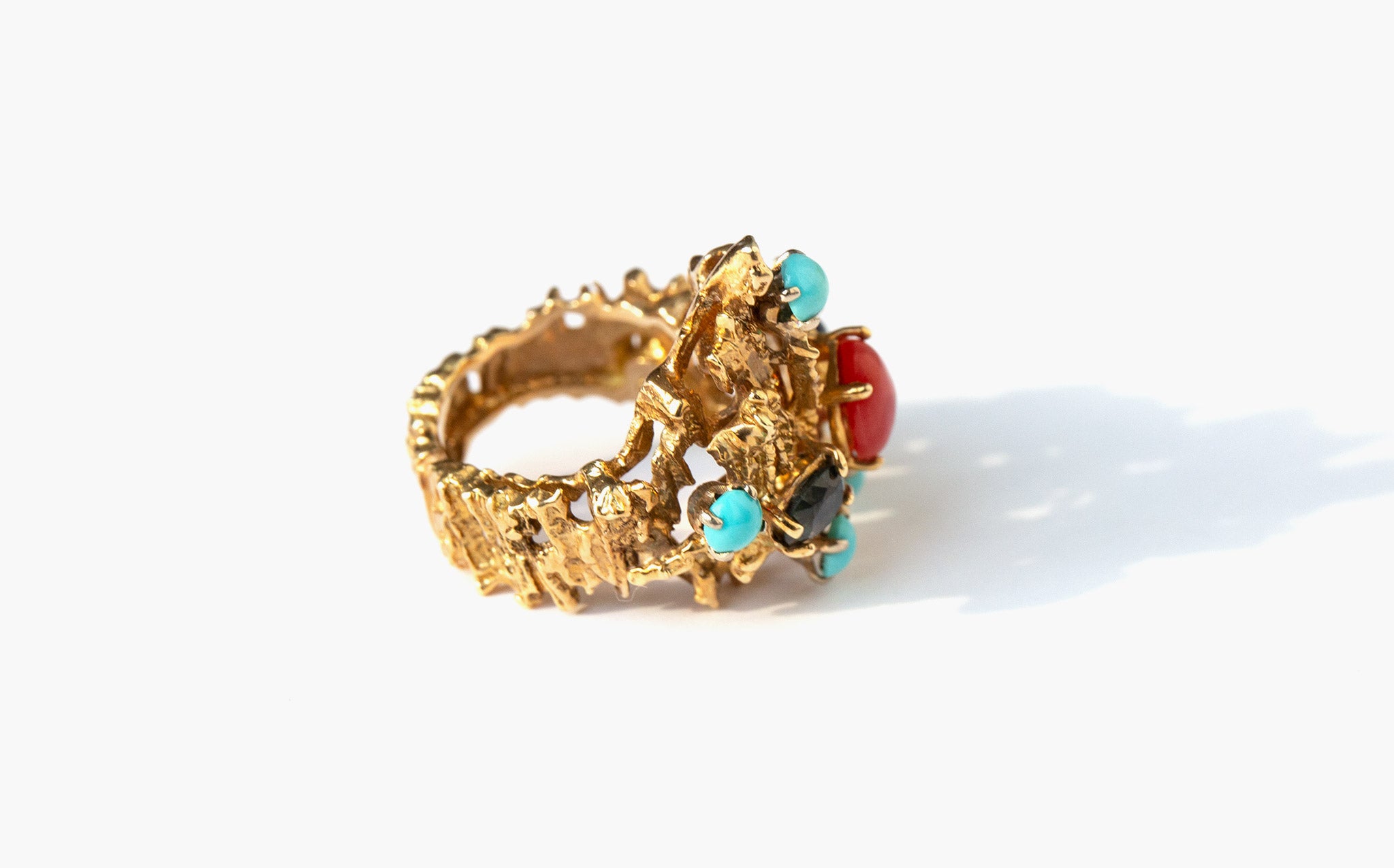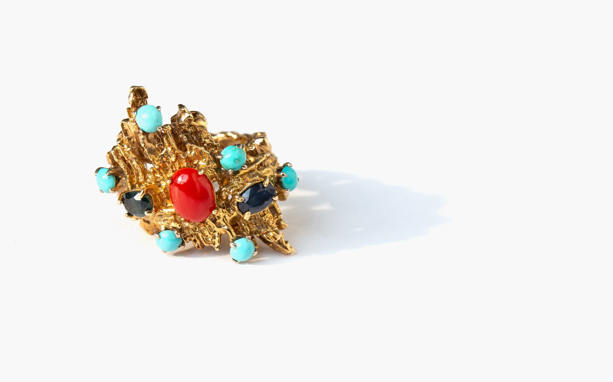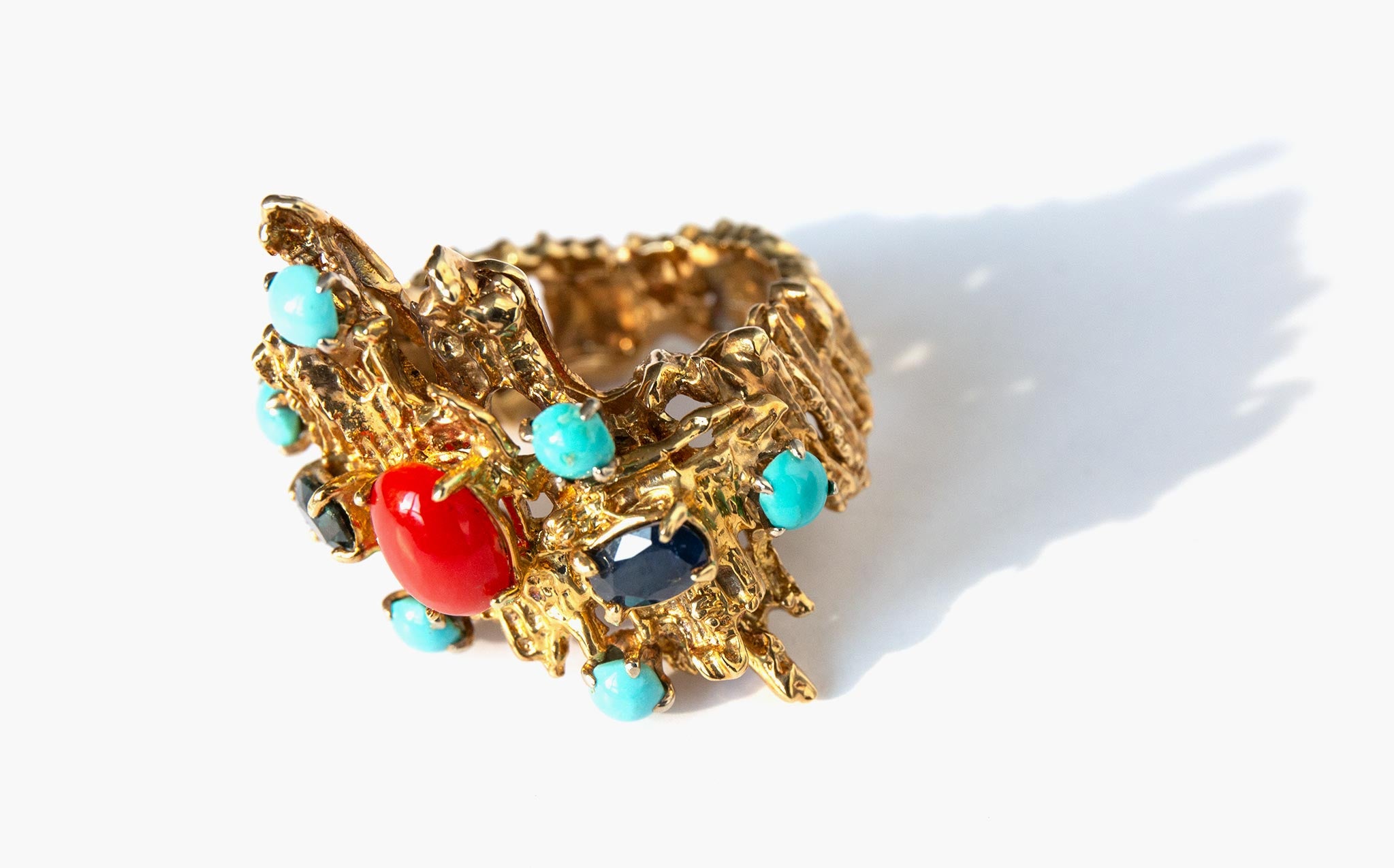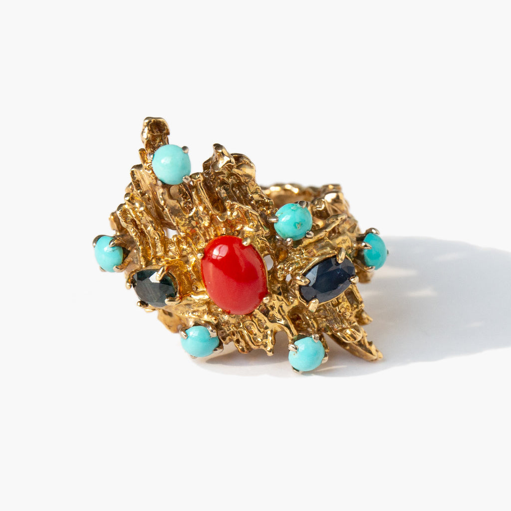 Weighty and fabulous brutalist 14k gold ring with coral, sapphire, and turquoise accents.