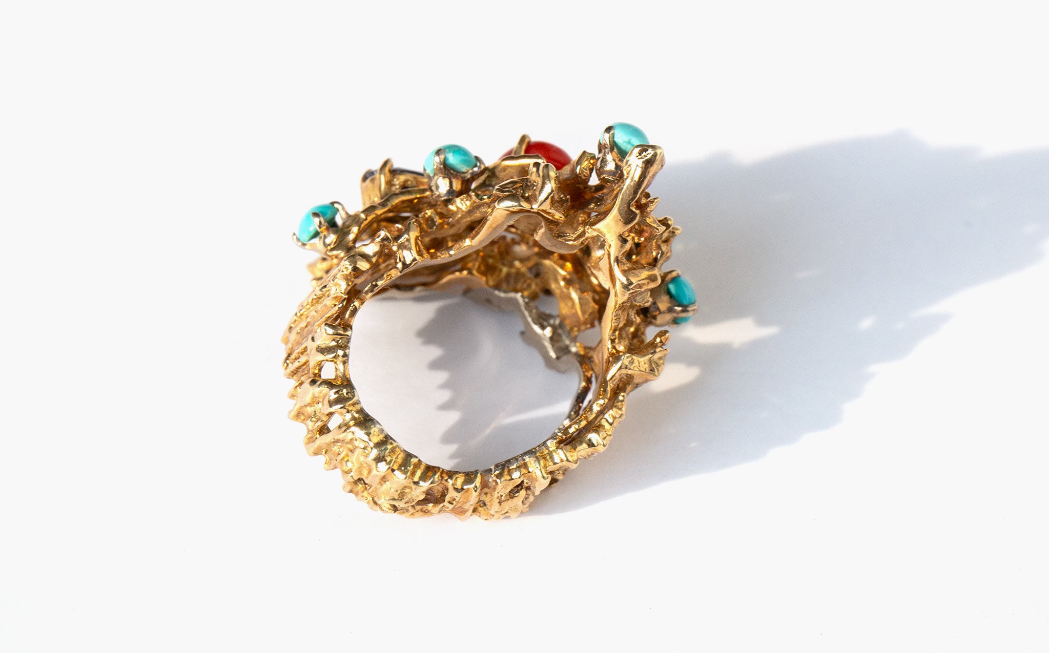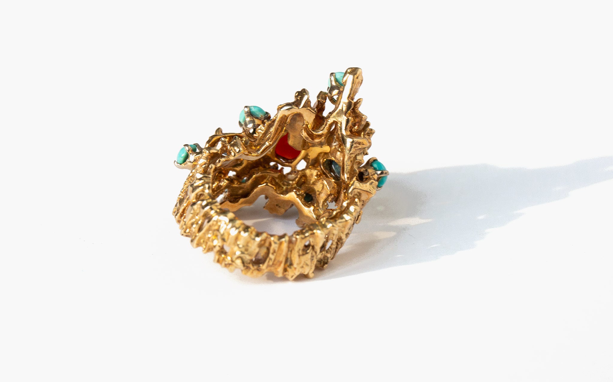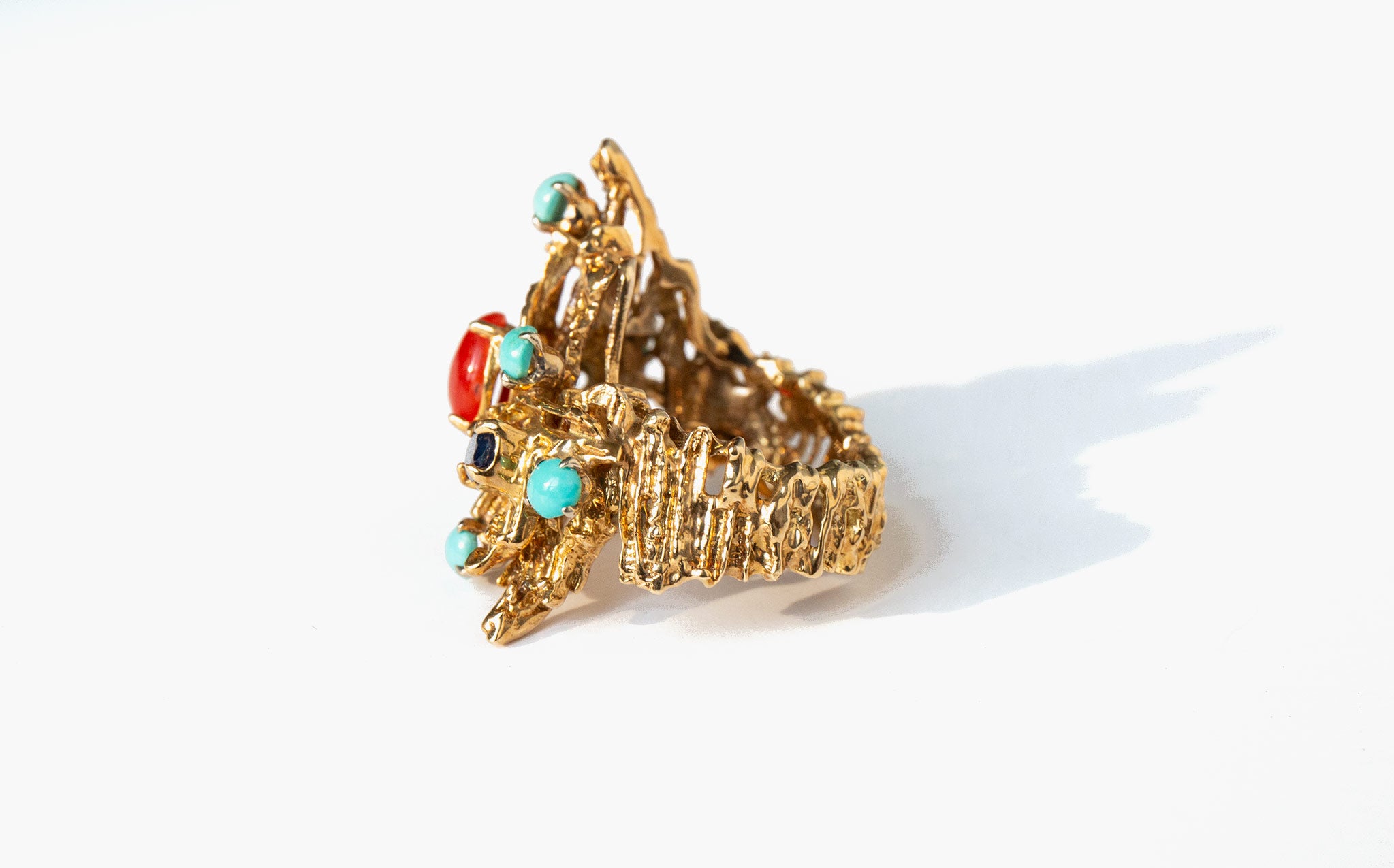 Weighty and fabulous brutalist 14k gold ring with coral, sapphire, and turquoise accents.