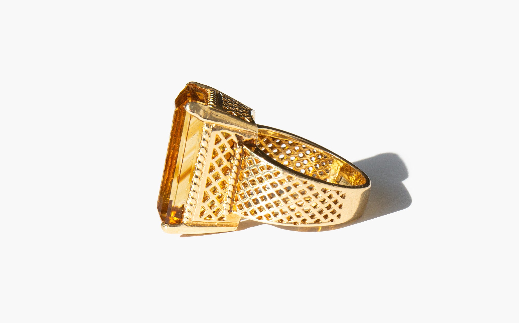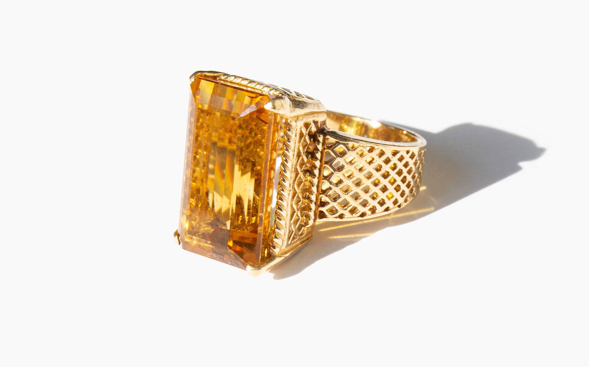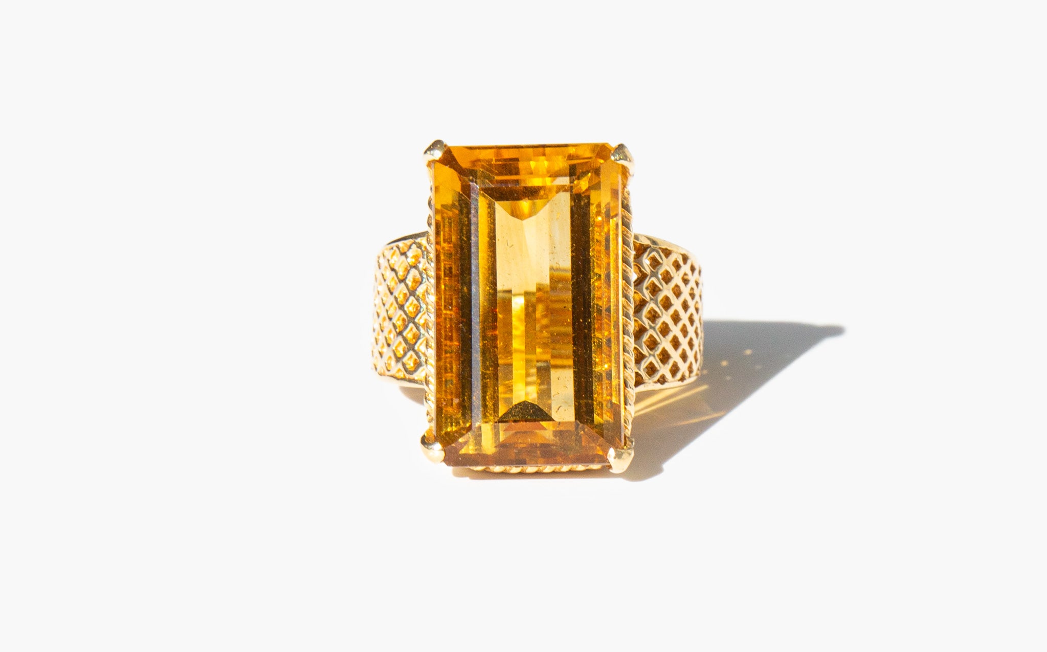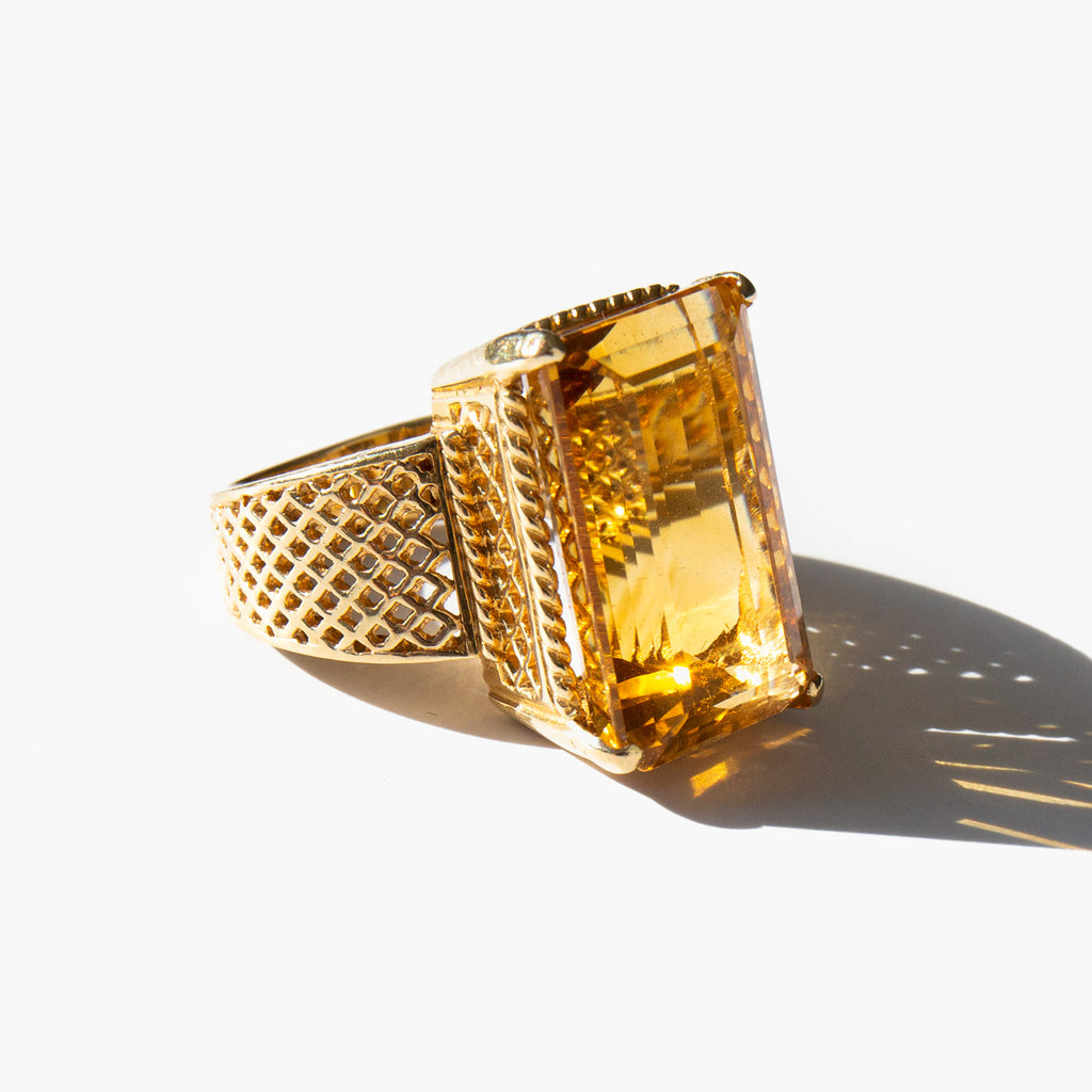 1960's 14k gold basket-weave setting with a large and majestic faceted citrine. Known as "the happy stone" citrine is said to dispel negative energy and bring happiness and positivity into the life of the those who wear it.
