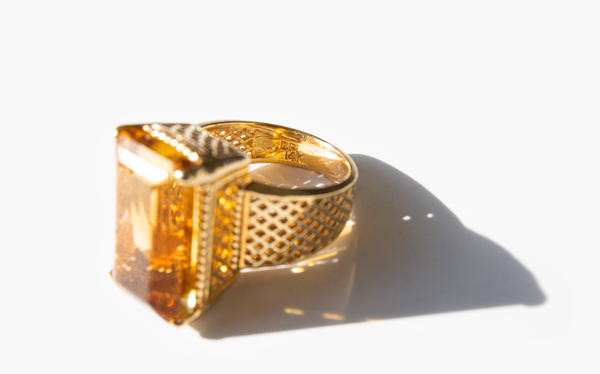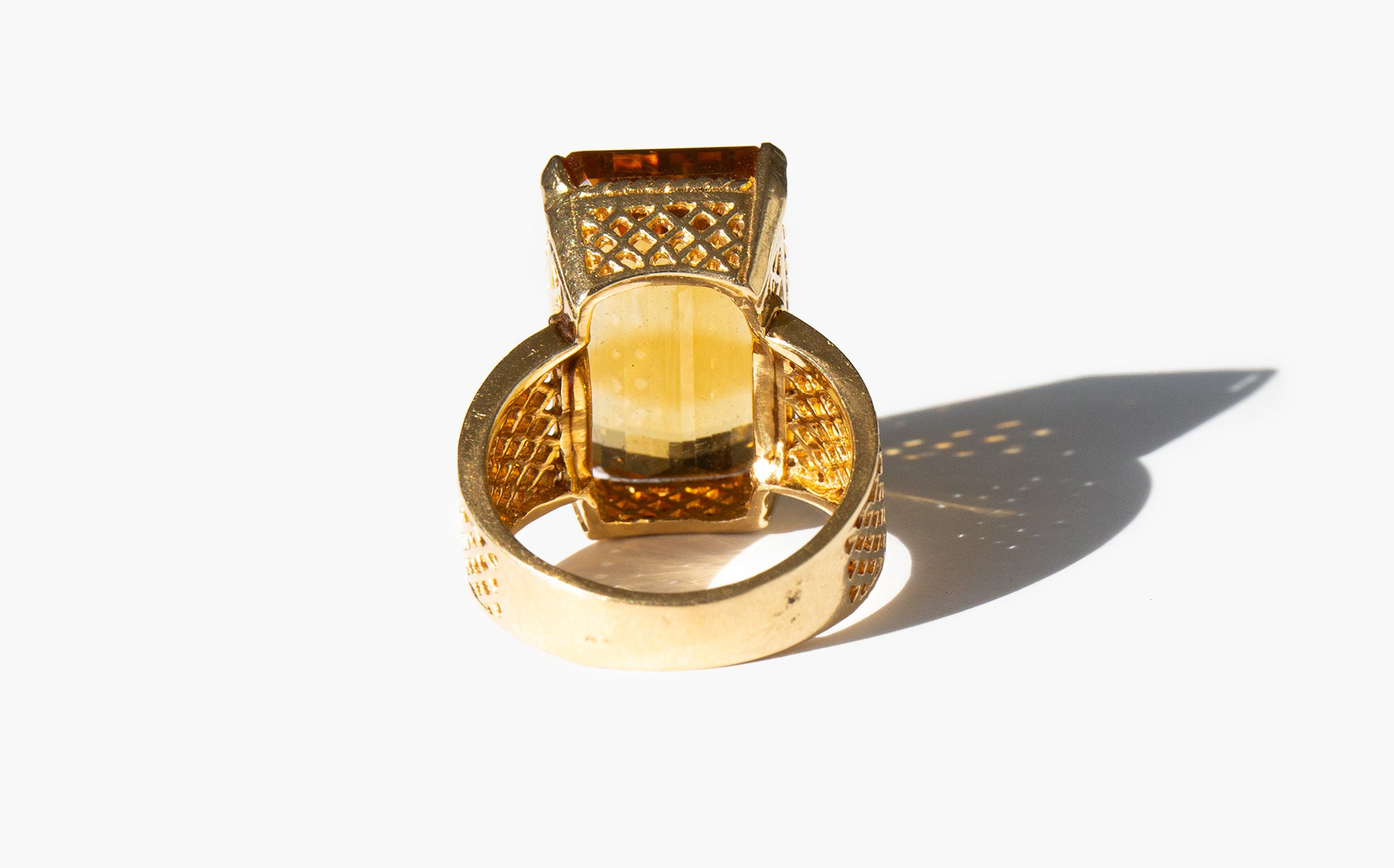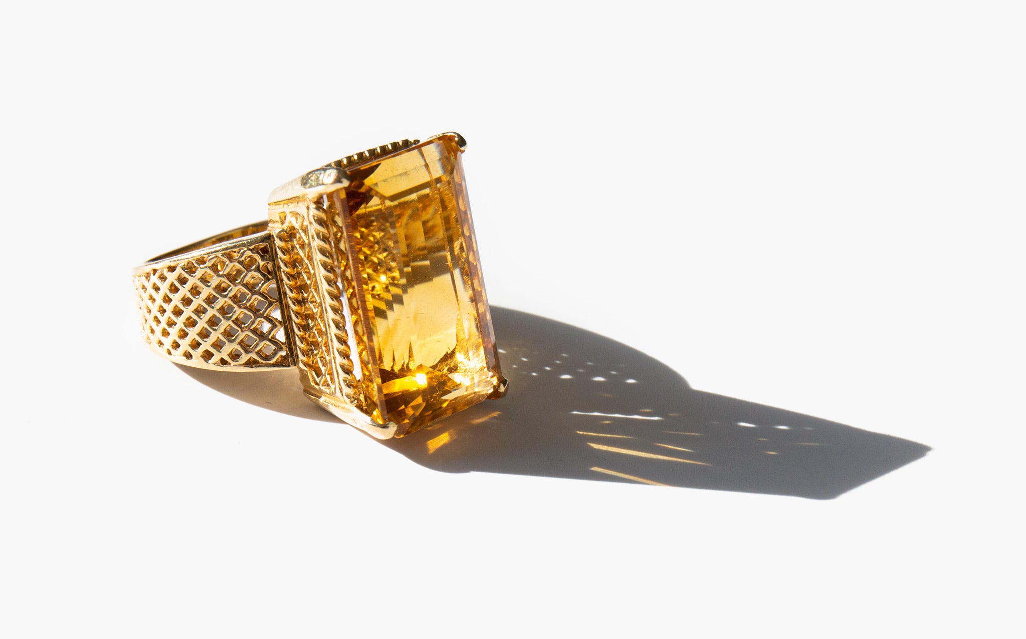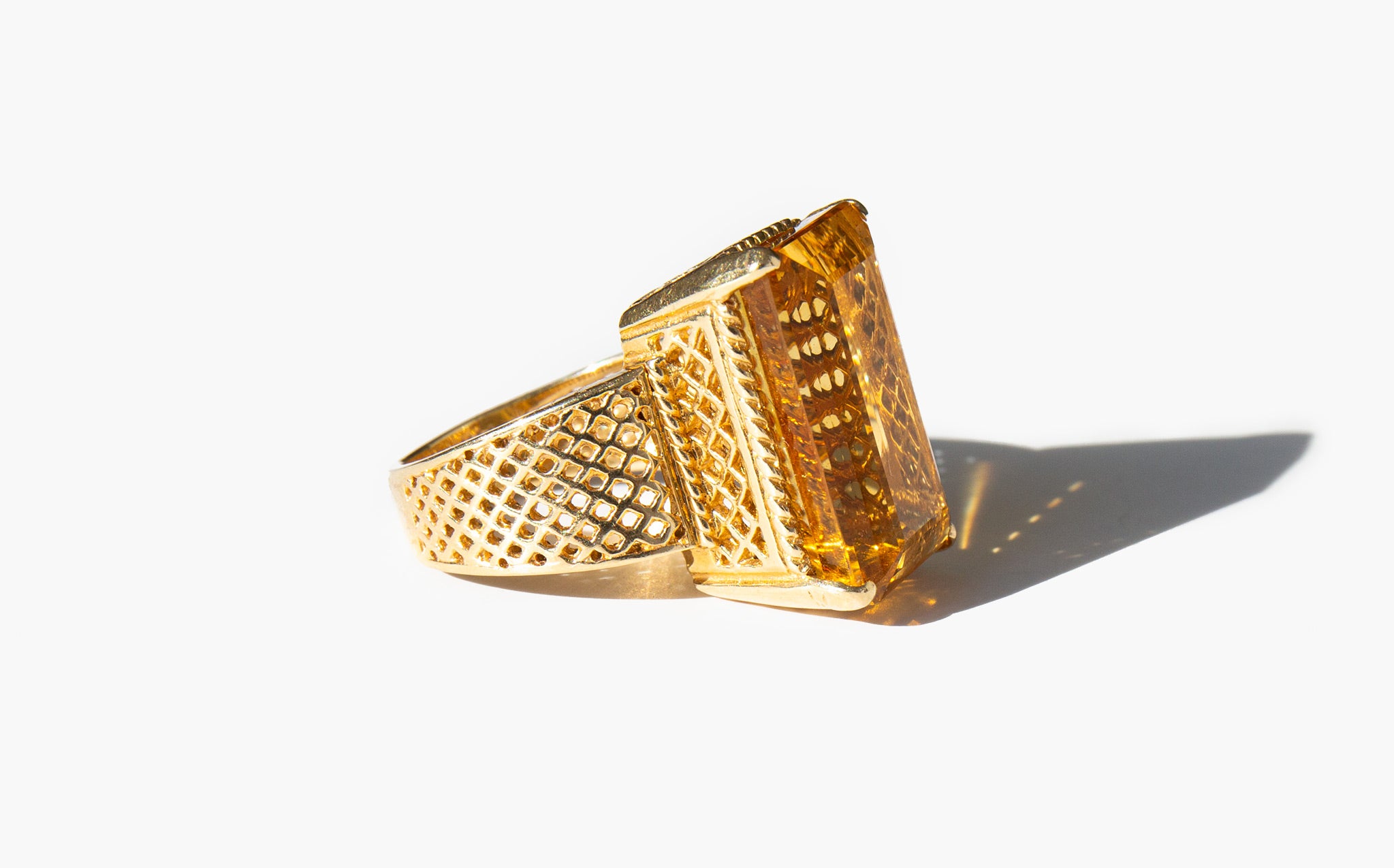 1960's 14k gold basket-weave setting with a large and majestic faceted citrine. Known as "the happy stone" citrine is said to dispel negative energy and bring happiness and positivity into the life of the those who wear it.
