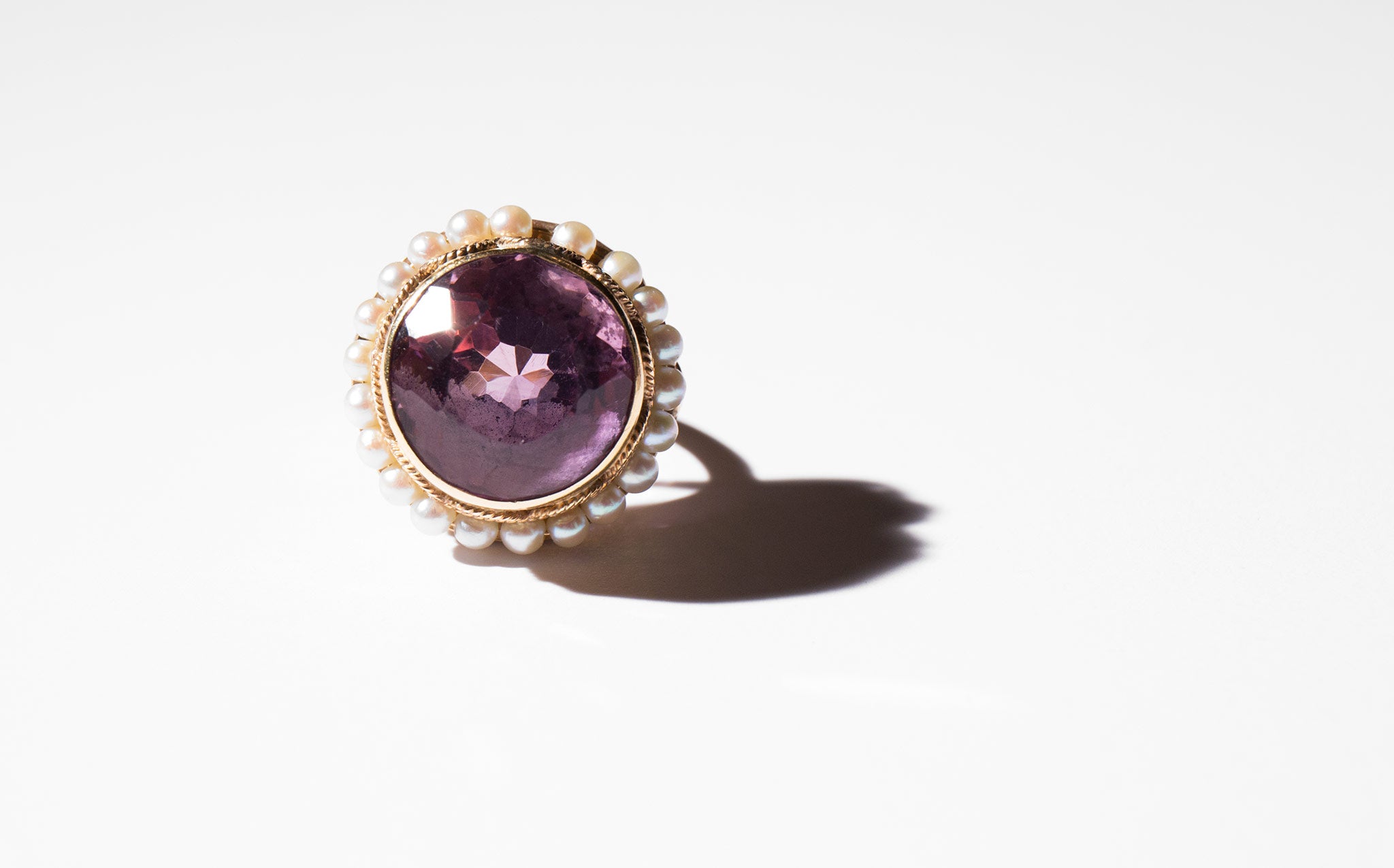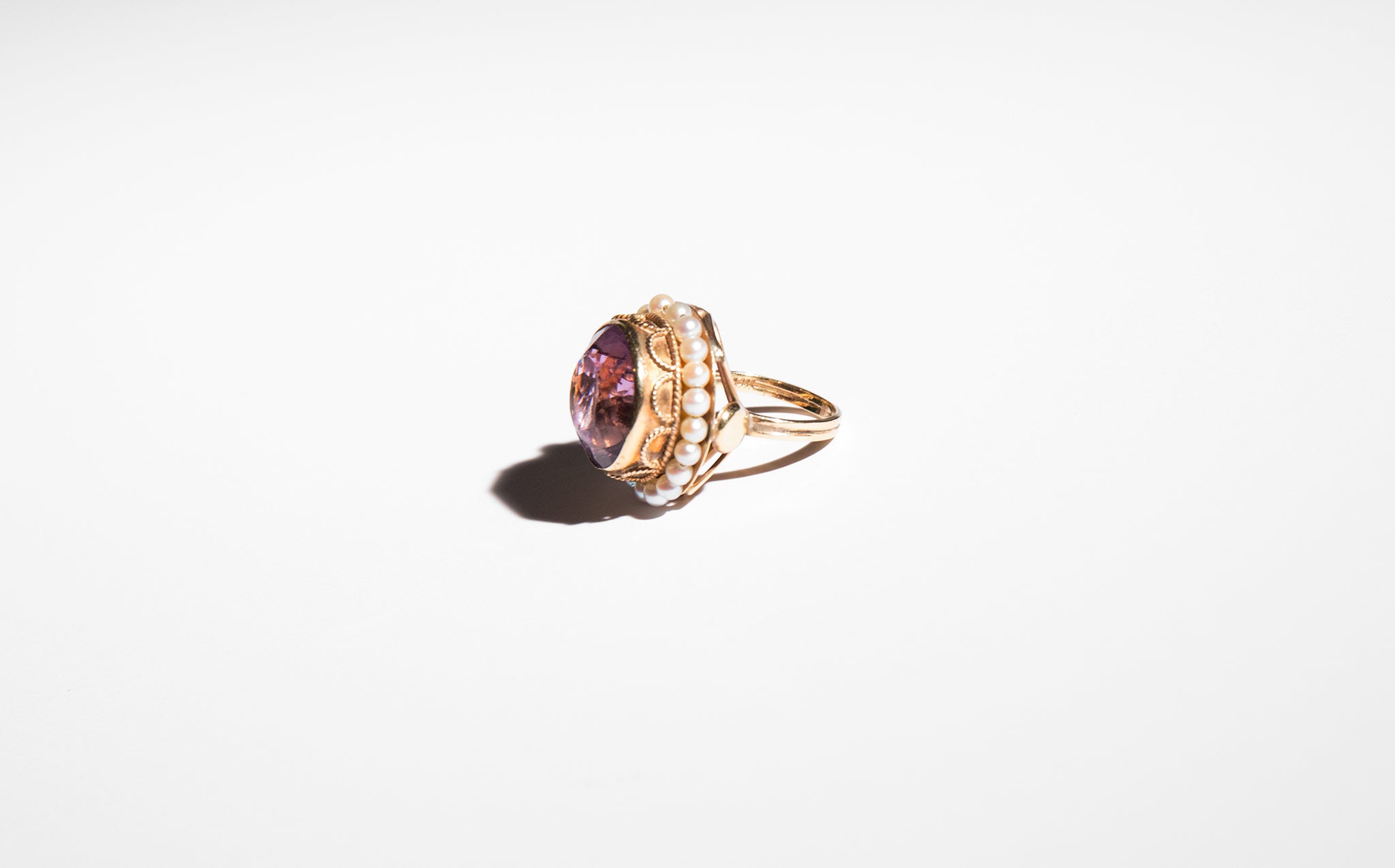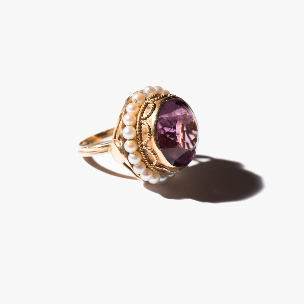 Vintage, large and beautiful faceted amethyst surrounded in creamy seed pearls and set in a handmade 14k gold setting.