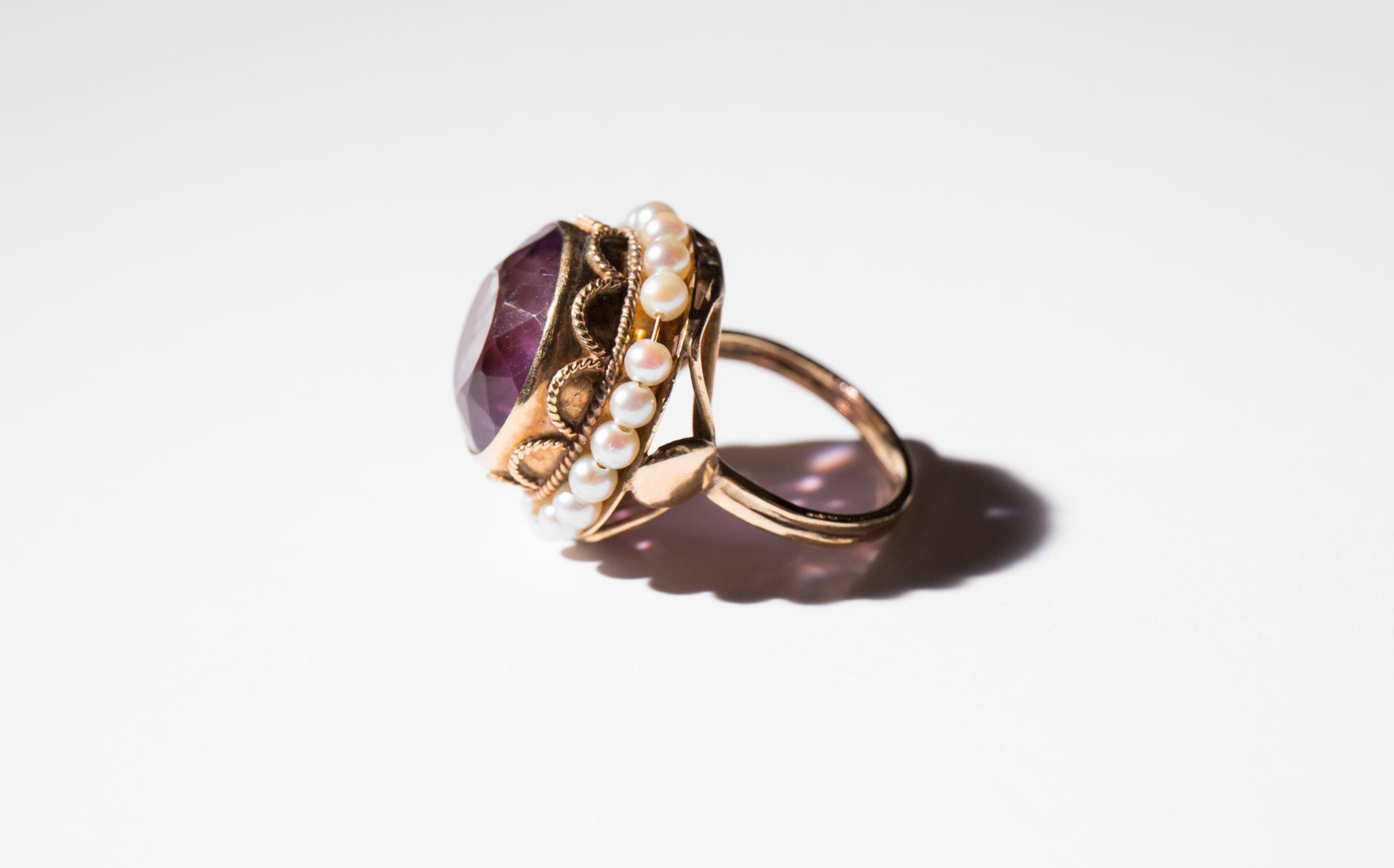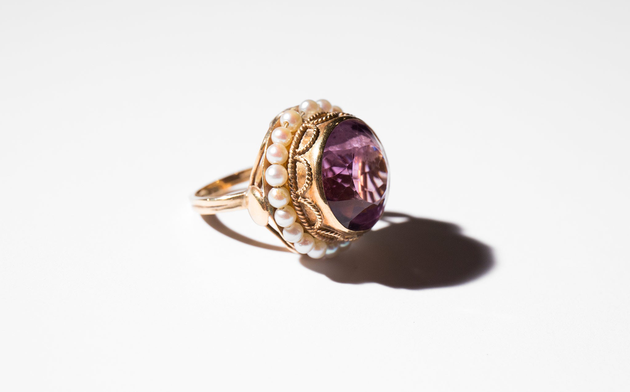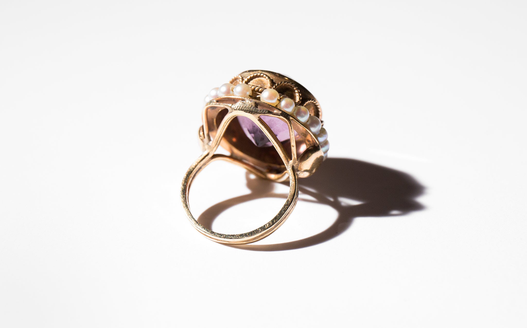 Vintage, large and beautiful faceted amethyst surrounded in creamy seed pearls and set in a handmade 14k gold setting.