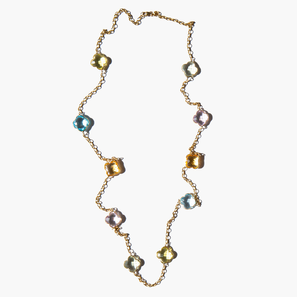 Lovely, long, and colorful 14k gold chain with beautifully translucent topaz, amethyst, citrine, and green amethyst stones.