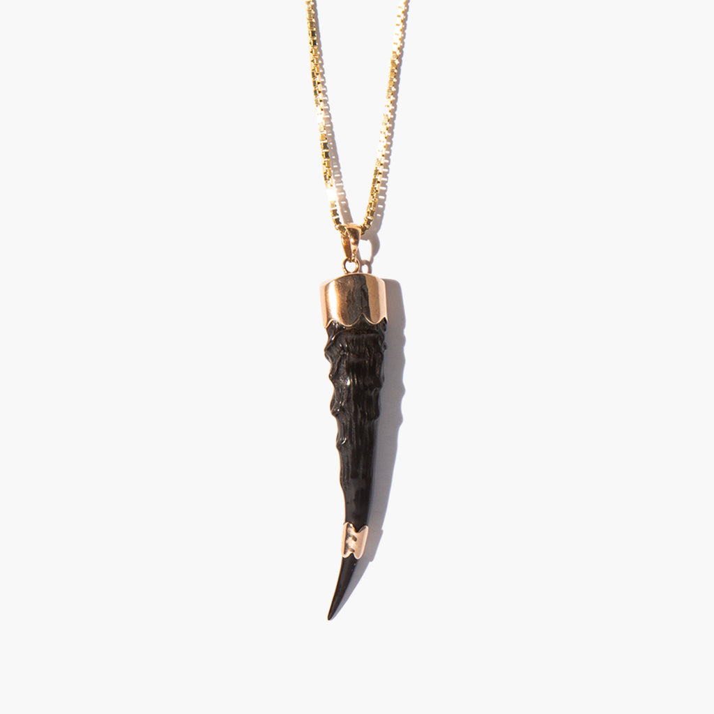 Slinky and sparkling 14k gold chain with an antique 10k gold embellished Victorian dik dik horn charm, the horn of a tiny African antelope collected by the Victorians as trophies and for spiritual protection.