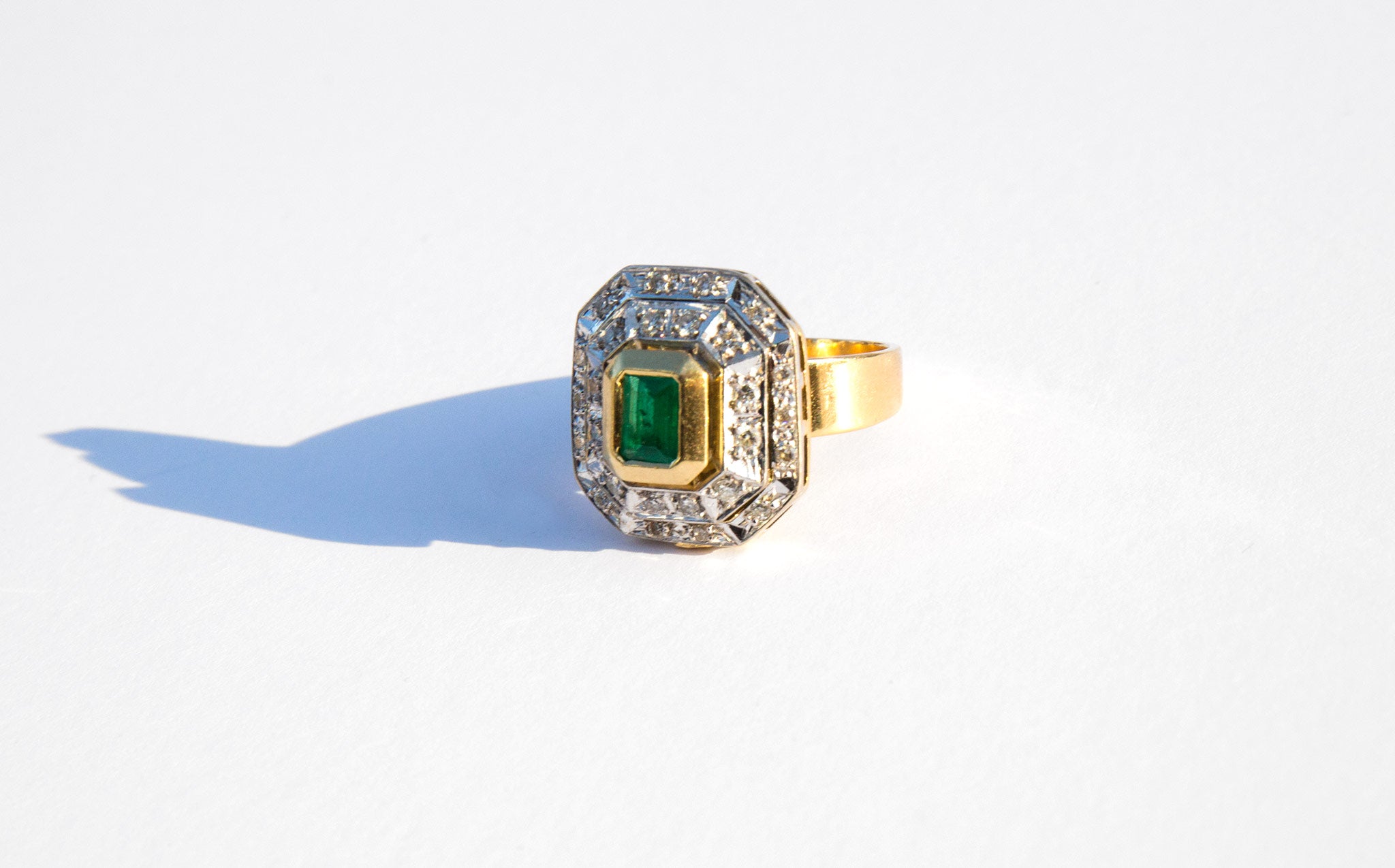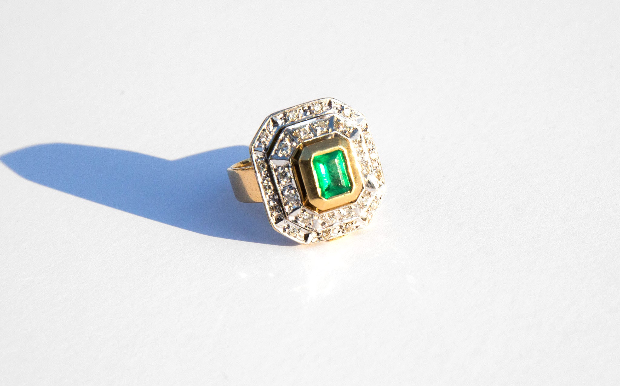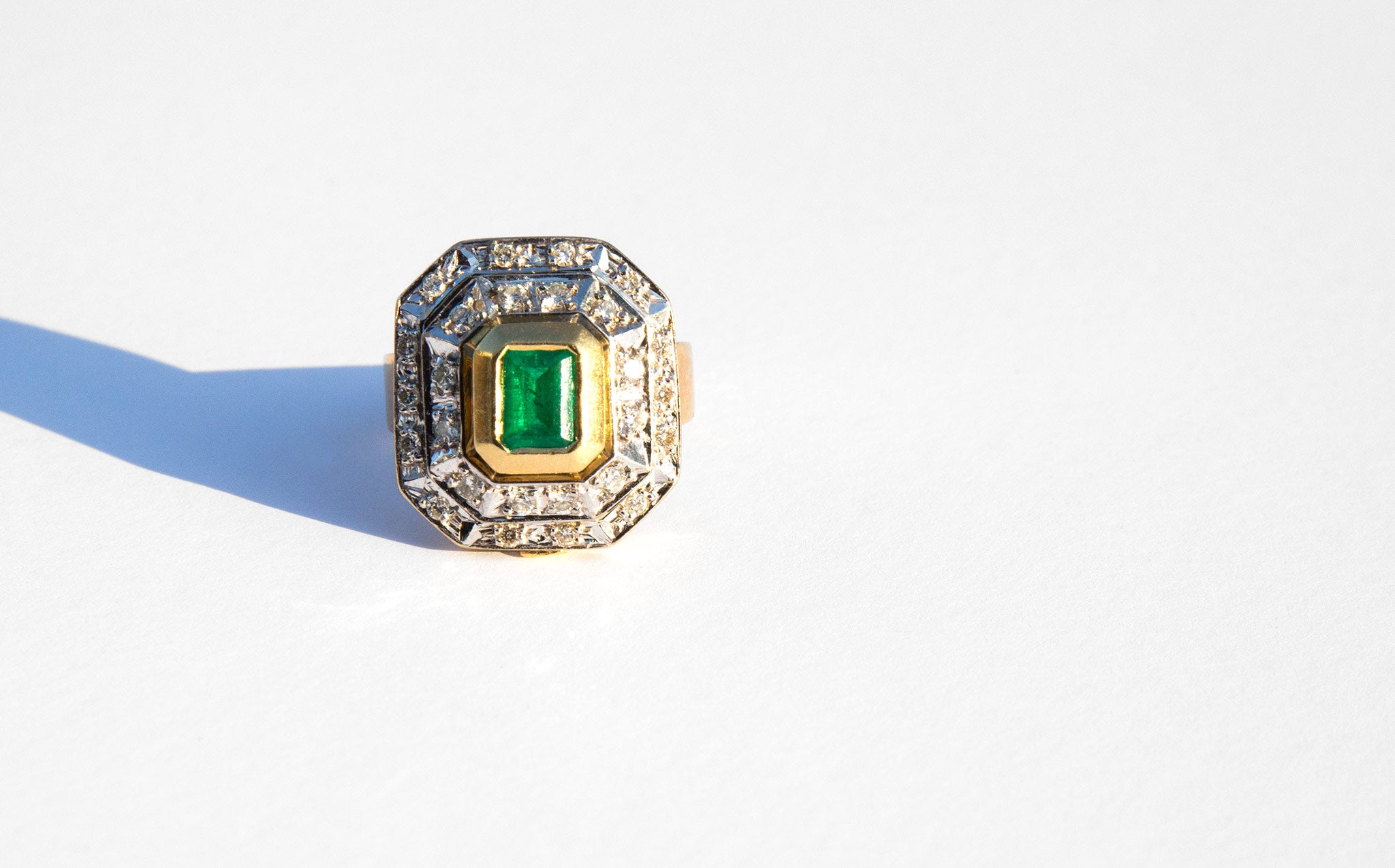 Dazzling 18k gold ring set with an array of sparkling diamonds totaling 1/2 ct., and a beautifully bright center emerald.