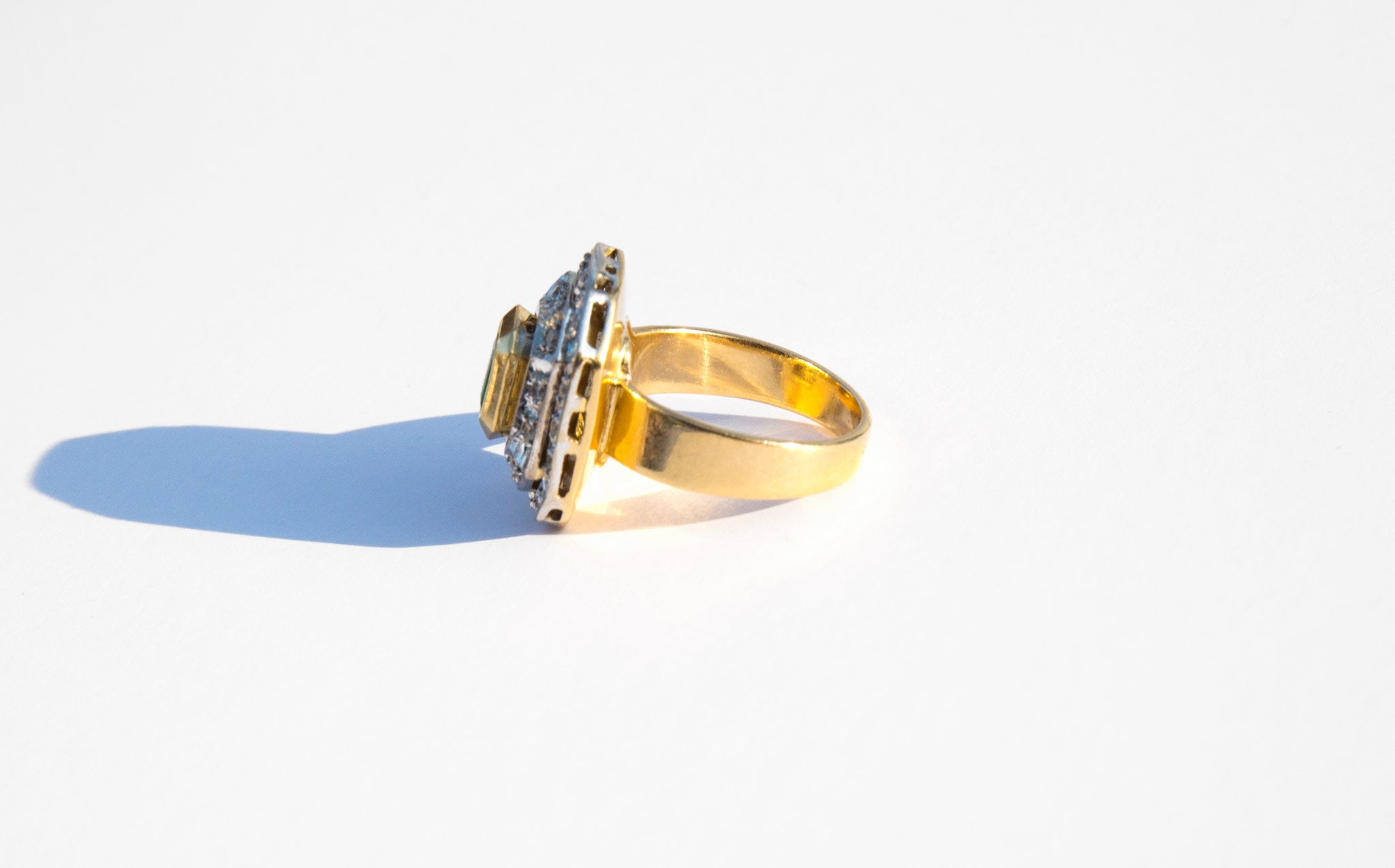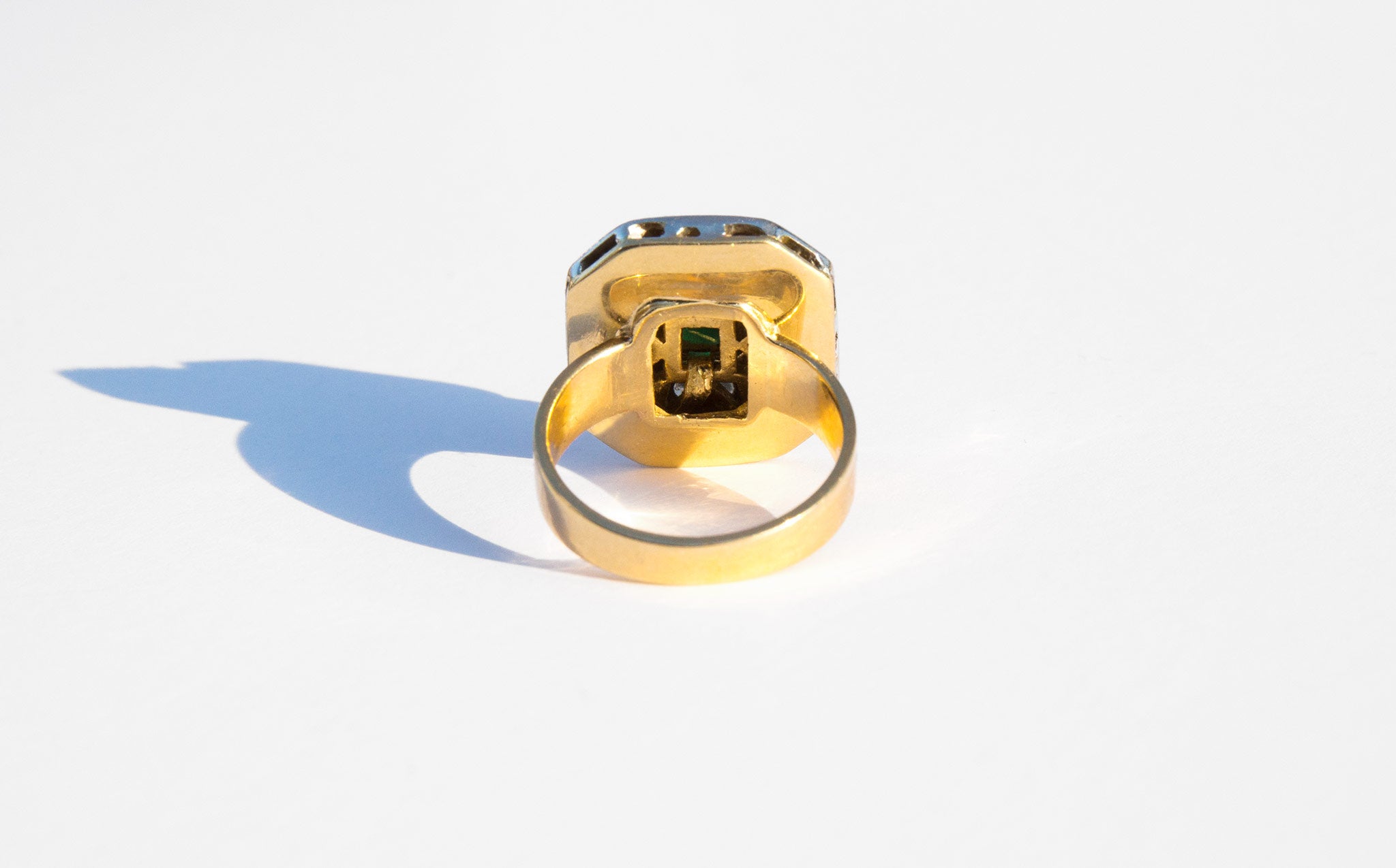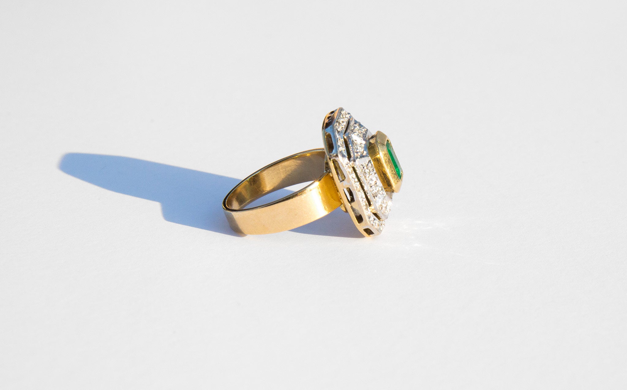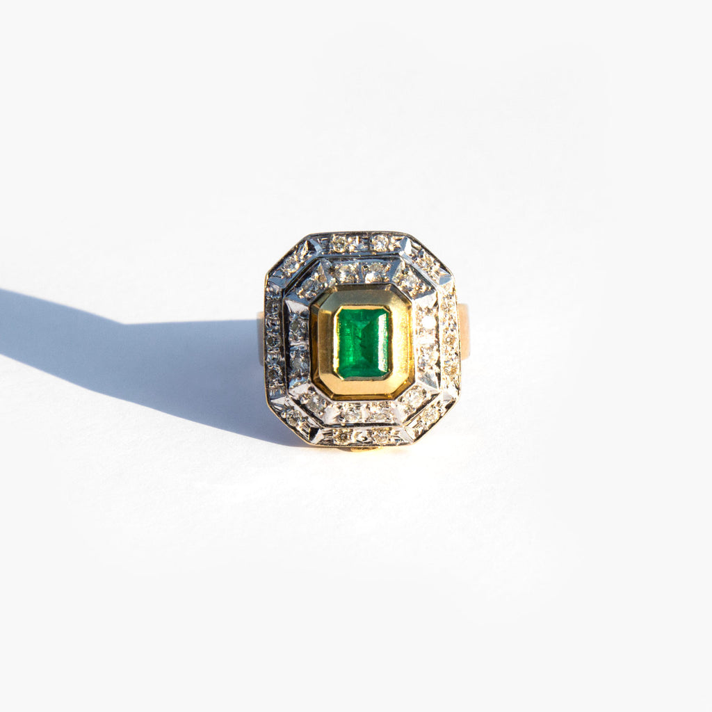 Dazzling 18k gold ring set with an array of sparkling diamonds totaling 1/2 ct., and a beautifully bright center emerald.