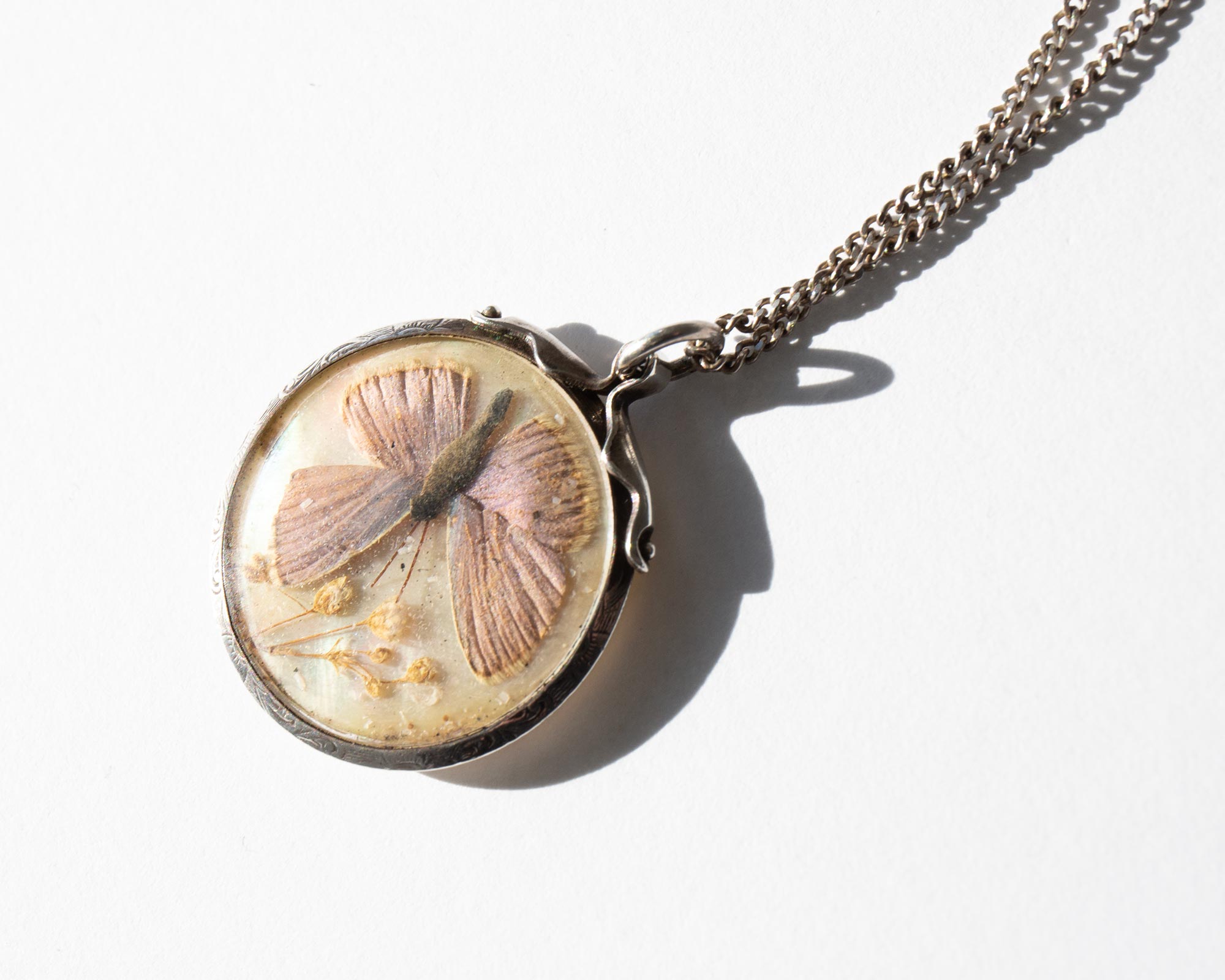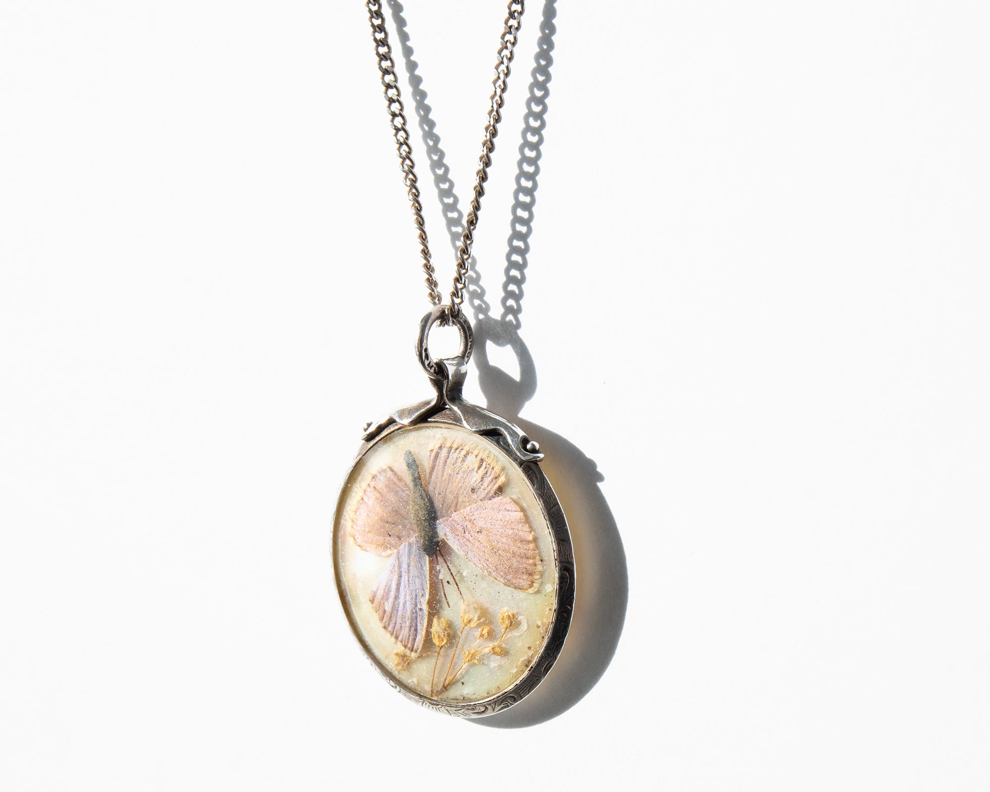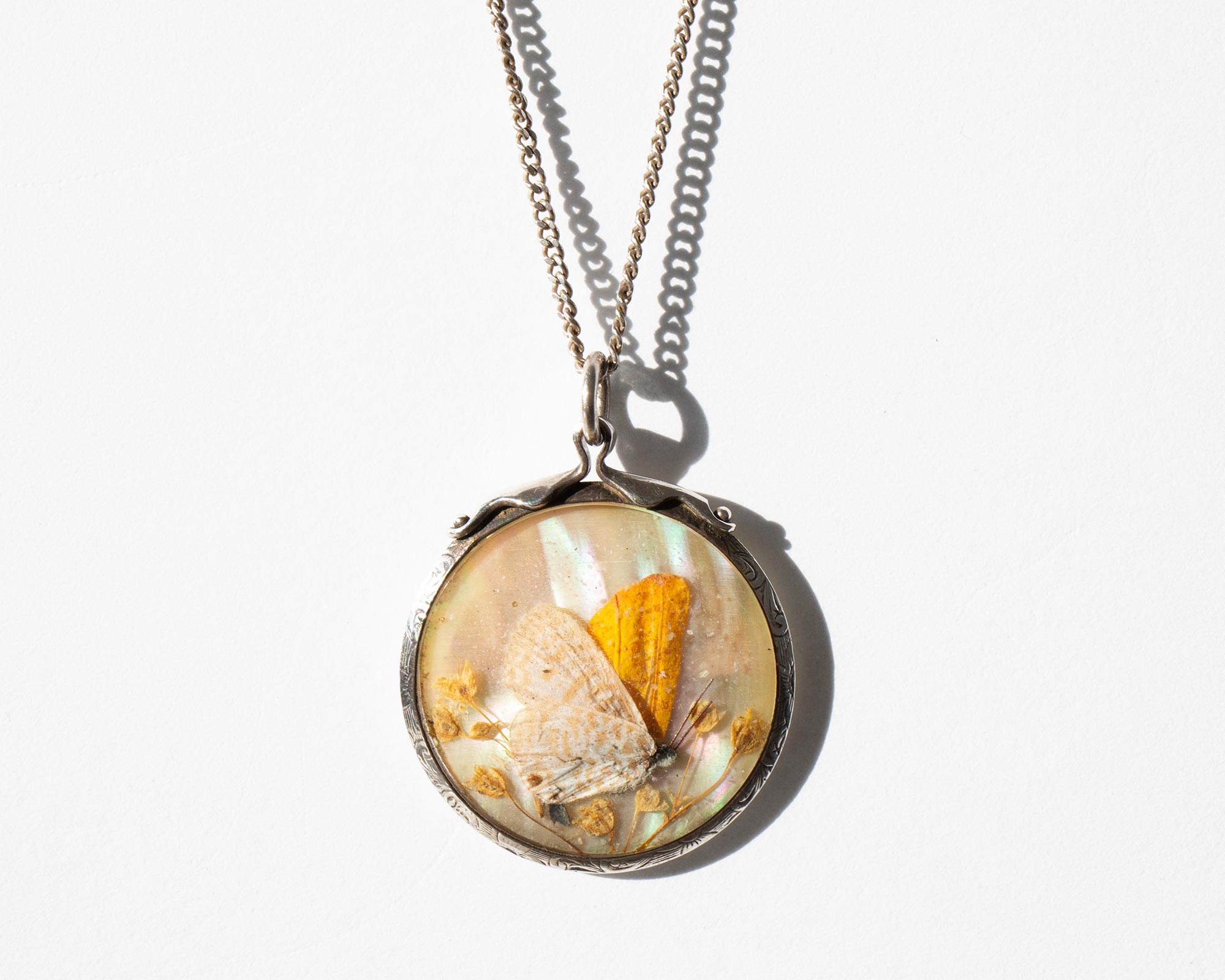 Antique sterling silver and mother of pearl double sided charm with real butterflies encased in the charm, on a sterling silver chain. Butterflies represent rebirth, transformation, and change.