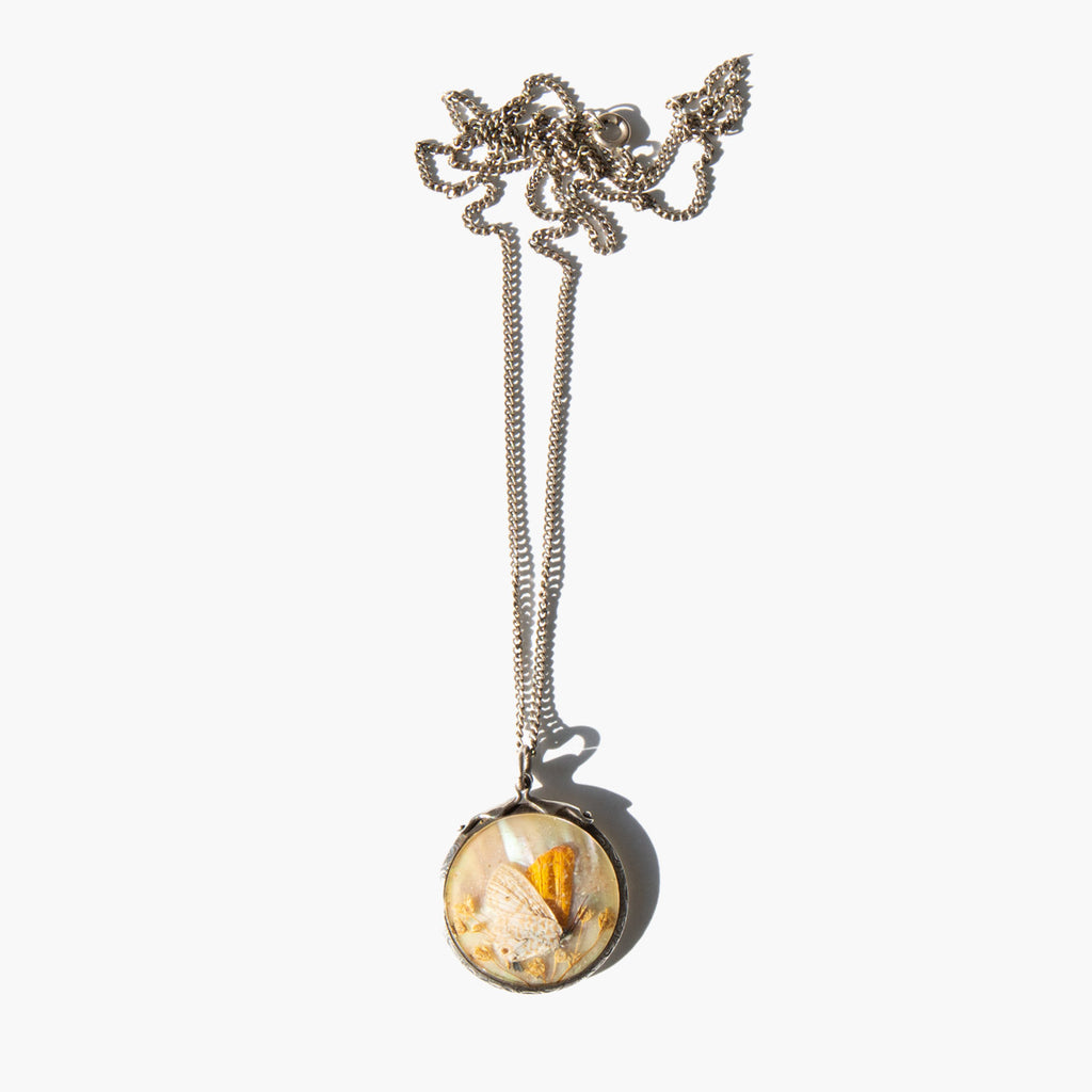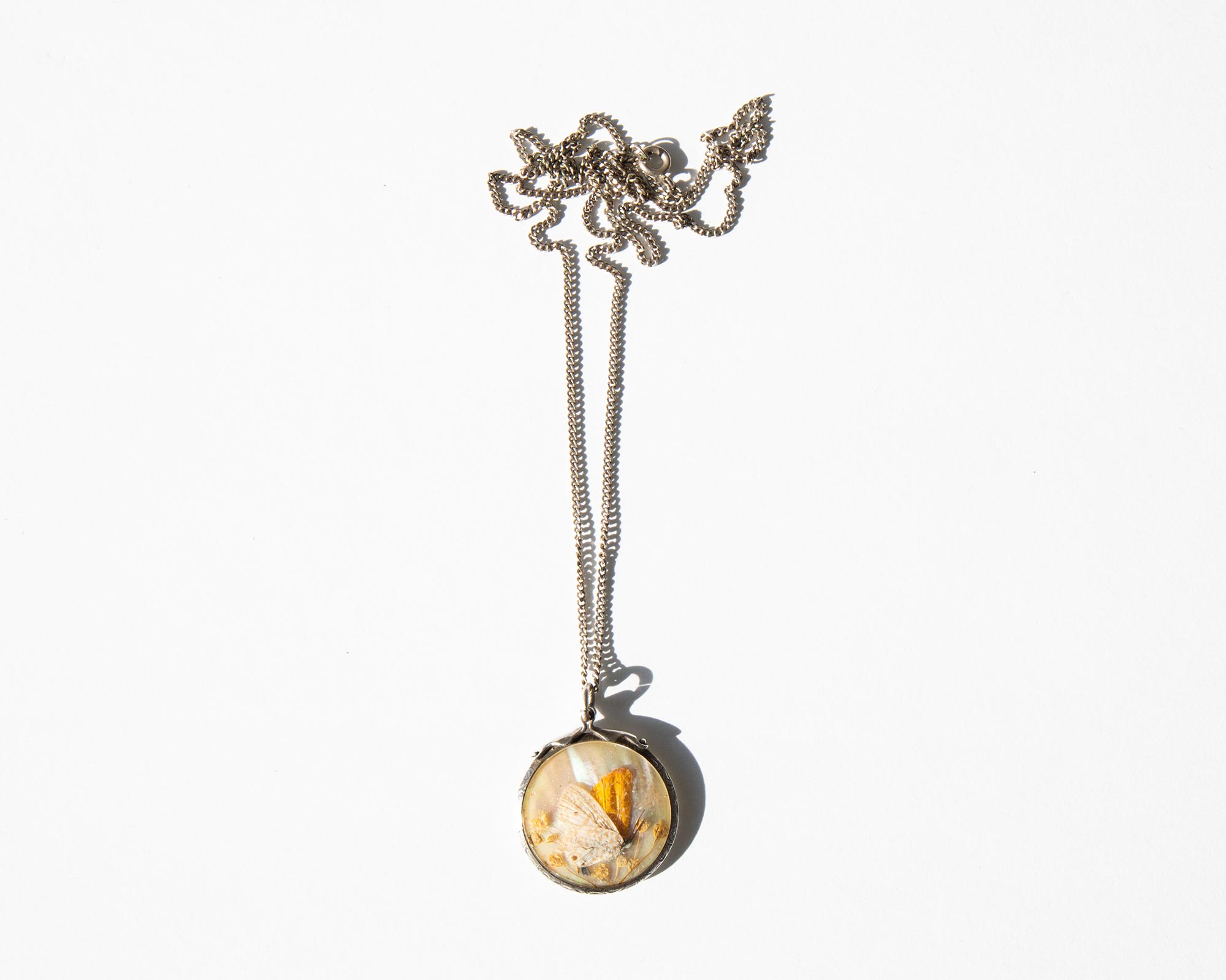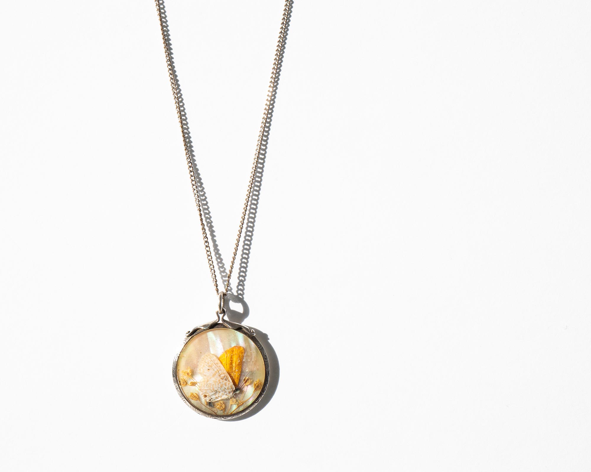 Antique sterling silver and mother of pearl double sided charm with real butterflies encased in the charm, on a sterling silver chain. Butterflies represent rebirth, transformation, and change.