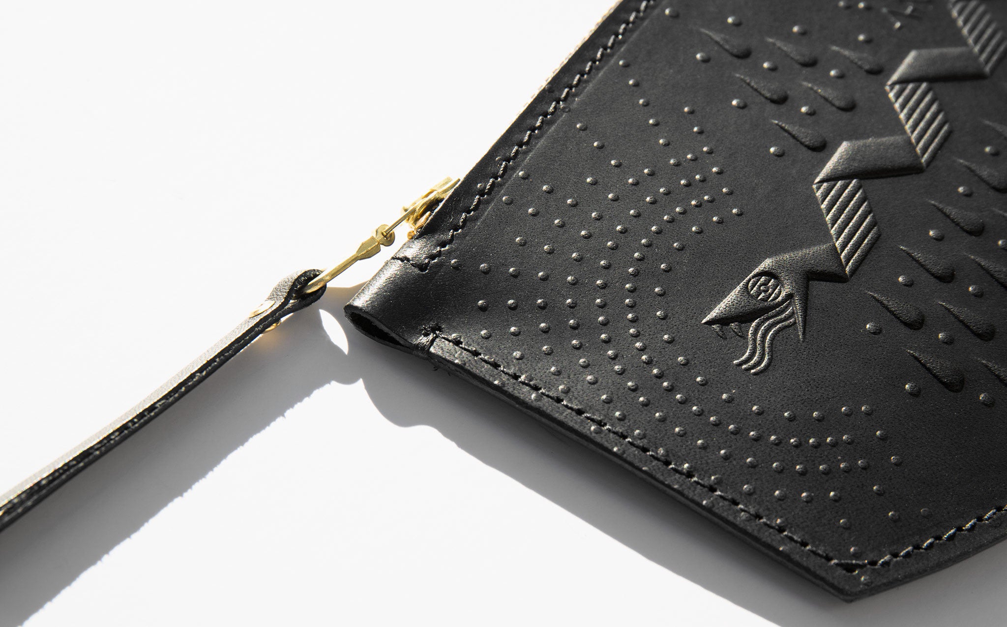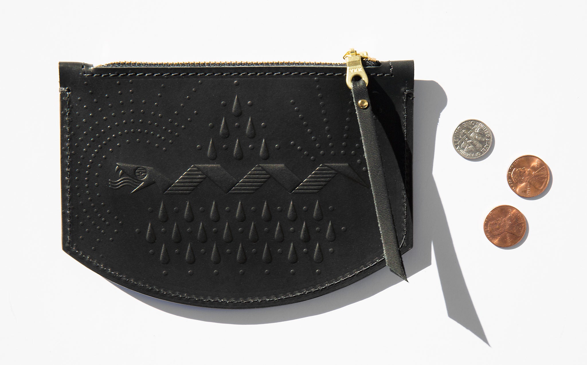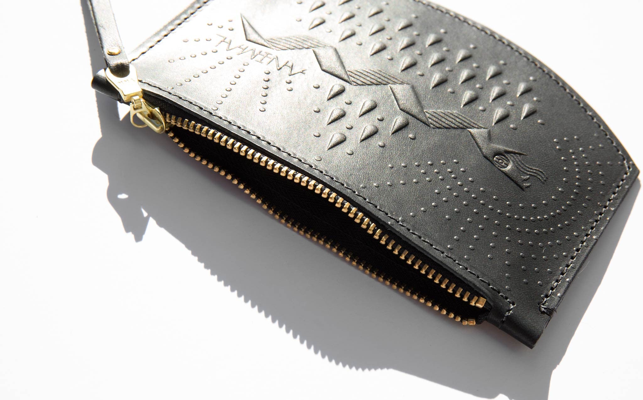 A delicately and intricately embossed leather coin pouch with a zipper closure.